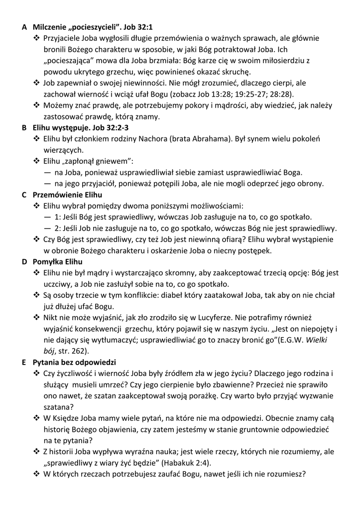 A Milczenie „pocieszycieli”. Job 32:1 Przyjaciele Joba wygłosili długie przemówienia o ważnych sprawach, ale głównie bronili Bożego charakteru w sposobie, w jaki Bóg potraktował Joba. Ich „pocieszająca” mowa dla Joba brzmiała: Bóg karze cię w swoim miłosierdziu z powodu ukrytego grzechu, więc powinieneś okazać skruchę. Job zapewniał o swojej niewinności. Nie mógł zrozumieć, dlaczego cierpi, ale zachował wierność i wciąż ufał Bogu (zobacz Job 13:28; 19:25-27; 28:28). Możemy znać prawdę, ale potrzebujemy pokory i mądrości, aby wiedzieć, jak należy zastosować prawdę, którą znamy. B Elihu występuje. Job 32:2-3 Elihu był członkiem rodziny Nachora (brata Abrahama). Był synem wielu pokoleń wierzących. Elihu „zapłonął gniewem”: — na Joba, ponieważ usprawiedliwiał siebie zamiast usprawiedliwiać Boga. — na jego przyjaciół, ponieważ potępili Joba, ale nie mogli odeprzeć jego obrony. C Przemówienie Elihu Elihu wybrał pomiędzy dwoma poniższymi możliwościami: — 1: Jeśli Bóg jest sprawiedliwy, wówczas Job zasługuje na to, co go spotkało. — 2: Jeśli Job nie zasługuje na to, co go spotkało, wówczas Bóg nie jest sprawiedliwy. Czy Bóg jest sprawiedliwy, czy też Job jest niewinną ofiarą? Elihu wybrał wystąpienie w obronie Bożego charakteru i oskarżenie Joba o niecny postępek. D Pomyłka Elihu Elihu nie był mądry i wystarczająco skromny, aby zaakceptować trzecią opcję: Bóg jest uczciwy, a Job nie zasłużył sobie na to, co go spotkało. Są osoby trzecie w tym konflikcie: diabeł który zaatakował Joba, tak aby on nie chciał już dłużej ufać Bogu. Nikt nie może wyjaśnić, jak zło zrodziło się w Lucyferze. Nie potrafimy również wyjaśnić konsekwencji grzechu, który pojawił się w naszym życiu. „Jest on niepojęty i nie dający się wytłumaczyć; usprawiedliwiać go to znaczy bronić go”(E.G.W. Wielki bój, str. 262). E Pytania bez odpowiedzi Czy życzliwość i wierność Joba były źródłem zła w jego życiu? Dlaczego jego rodzina i służący musieli umrzeć? Czy jego cierpienie było zbawienne? Przecież nie sprawiło ono nawet, że szatan zaakceptował swoją porażkę. Czy warto było przyjąć wyzwanie szatana? W Księdze Joba mamy wiele pytań, na które nie ma odpowiedzi. Obecnie znamy całą historię Bożego objawienia, czy zatem jesteśmy w stanie gruntownie odpowiedzieć na te pytania? Z historii Joba wypływa wyraźna nauka; jest wiele rzeczy, których nie rozumiemy, ale „sprawiedliwy z wiary żyć będzie” (Habakuk 2:4). W których rzeczach potrzebujesz zaufać Bogu, nawet jeśli ich nie rozumiesz?