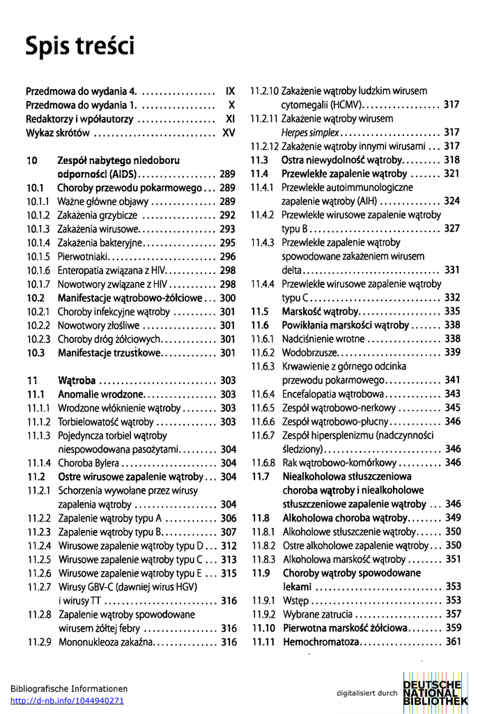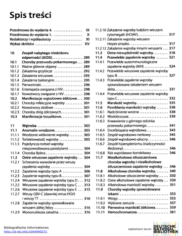 Spis treści 11.2.10 Zakażenie wątroby ludzkim wirusem Przedmowa do wydania 4 IX Przedmowa do wydania 1 X cytomegalii (HCMV) Redaktorzy i wpółautorzy XI 11.2.11 Zakażenie wątroby wirusem Wykaz skrótów Herpes simplex XV 317 317 11.2.12 Zakażenie wątroby innymi wirusami... 317 10 Zespół nabytego niedoboru odporności (AIDS) 10.1 289 Choroby przewodu pokarmowego... 289 11.3 Ostra niewydolność wątroby 318 11.4 Przewlekłe zapalenie wątroby 321 11.4.1 Przewlekłe autoimmunologiczne zapalenie wątroby (AIH) 10.1.1 Ważne główne objawy 289 10.1.2 Zakażenia grzybicze 292 10.1.3 Zakażenia wirusowe 293 10.1.4 Zakażenia bakteryjne 295 10.1.5 Pierwotniaki 296 spowodowane zakażeniem wirusem 10.1.6 Enteropatia związana z HIV 298 delta 10.1.7 Nowotwory związane z HIV 298 324 11.4.2 Przewlekłe wirusowe zapalenie wątroby typuB 327 11.4.3 Przewlekłe zapalenie wątroby 331 11.4.4 Przewlekłe wirusowe zapalenie wątroby typuC 332 10.2.1 Choroby infekcyjne wątroby 301 11.5 Marskość wątroby 335 10.2.2 Nowotwory złośliwe 301 11.6 Powikłania marskości wątroby 338 10.2.3 Choroby dróg żółciowych 301 11.6.1 Nadciśnienie wrotne 338 10.3 301 11.6.2 Wodobrzusze 339 10.2 Manifestacje wątrobowo-żółciowe... 300 Manifestacje trzustkowe 11.6.3 Krwawienie z górnego odcinka 11 Wątroba 11.1 Anomalie wrodzone 303 przewodu pokarmowego 341 303 11.6.4 Encefalopatia wątrobowa 343 11.1.1 Wrodzone włóknienie wątroby 303 11.6.5 Zespół wątrobowo-nerkowy 345 11.1.2 Torbielowatość wątroby 303 11.6.6 Zespół wątrobowo-płucny 346 11.6.7 Zespół hipersplenizmu (nadczynności 11.1.3 Pojedyncza torbiel wątroby niespowodowana pasożytami 11.1.4 Choroba Bylera 11.2 śledziony) 304 304 Ostre wirusowe zapalenie wątroby... 304 11.6.8 Rak wątrobowo-komórkowy 11.7 Niealkoholowa stłuszczeniowa choroba wątroby i niealkoholowe 11.2.1 Schorzenia wywołane przez wirusy stłuszczeniowe zapalenie wątroby ... 346 zapalenia wątroby 304 11.2.2 Zapalenie wątroby typu A 306 11.8 11.2.3 Zapalenie wątroby typu B 307 11.8.1 Alkoholowe stłuszczenie wątroby 11.2.4 Wirusowe zapalenie wątroby typu D... 312 Alkoholowa choroba wątroby 11.2.5 Wirusowe zapalenie wątroby typu C ... 313 11.8.3 Alkoholowa marskość wątroby 11.9 11.2.9 Mononukleoza zakaźna http://d-nb.info/1044940271 351 353 316 11.9.1 Wstęp 353 11.9.2 Wybrane zatrucia 357 316 11.10 Pierwotna marskość żółciowa 359 316 11.11 Hemochromatoza 361 11.2.8 Zapalenie wątroby spowodowane wirusem żółtej febry 350 Choroby wątroby spowodowane lekami 11.2.7 Wirusy GBV-C (dawniej wirus HGV) 349 11.8.2 Ostre alkoholowe zapalenie wątroby... 350 11.2.6 Wirusowe zapalenie wątroby typu E ... 315 i wirusy TT 346 346 VI Spis treści 12.7 11.12 Choroba Wilsona (zwyrodnienie wątrobowo-soczewkowe) 12.8 11.13 Pierwotne zaburzenia przemiany materii 364 12.9 11.13.1 Rodzinna hiperbilirubinemia Zapalenie bakteryjne pęcherzyka żółciowego 362 402 Pierwotne stwardniające zapalenie dróg żółciowych 403 Dysfunkcja zwieracza Oddiego 406 364 12.10 Guzy 406 11.13.2 Porfirię 364 12.10.1 Rak pęcherzyka żółciowego 406 11.13.3 Niedobór a-1-antytrypsyny 366 12.10.2 Rak dróg żółciowych 407 11.13.4 Wrodzona nietolerancja fruktozy 367 12.10.3 Nowotwór złośliwy brodawki Vatera 11.13.5 Galaktozemia 367 11.13.6 Zaburzenia spichrzania glikogenu 368 12.10.4 Łagodne guzy dróg żółciowych 11.13.7 Tyrozynemia wrodzona 368 12.11 Cholesteroloza, 11.14 Naczyniowe choroby wątroby 368 niehemolityczna (bańki wątrobowo-żółciowej) pęcherzyka żółciowego 409 369 12.12.1 Zespół po cholecystektomii 409 370 12.12.2 Zwężenia dróg żółciowych 410 12.12.3 Pozostałe problemy pooperacyjne 410 11.14.4 Niedokrwienne zapalenie wątroby i hepatopatia zastoinowa 409 12.12 Operowany system żółciowy 11.14.2 Choroby tętnicy wątrobowej i jej 11.14.3 Choroby żył wątrobowych 408 gruczolakomięśniakowatość i polipy 11.14.1 Choroby żyły wrotnej i jej odgałęzień .. 368 odgałęzień 408 372 13 Trzustka 413 373 13.1 Wady wrodzone 413 11.15.1 Zakażenia bakteryjne 373 13.1.1 Trzustka obrączkowata 413 11.15.2 Zakażenia pasożytnicze 376 13.1.2 Trzustka dwudzielna 413 11.15.3 Inne niewirusowe zakażenia wątroby .. 380 13.2 Ostre zapalenie trzustki 414 11.16 Nowotwory 382 13.3 Przewlekłe zapalenie trzustki 421 11.16.1 Nowotwory złośliwe 382 13.4 Autoimmunologiczne zapalenie 11.16.2 Guzy łagodne 386 trzustki 428 11.16.3 Przerzuty 387 13.5 Mukowiscydoza 430 11.17 Przeszczep wątroby 388 13.6 Zmiany torbielowate 432 12 Pęcherzyk żółciowy 391 13.6.2 Wrodzone („prawdziwe") torbiele 434 12.1 Wady wrodzone 391 13.6.3 Nowotwory torbielowate 436 438 11.15 Zakażenia bakteryjne i pasożytnicze wątroby 13.6.1 Torbiele rzekome 12.1.1 Zespół Carolego 391 13.7 12.1.2 Niedrożności dróg żółciowych 392 13.7.1 Rak trzustki 438 12.2 Kamica żółciowa 393 13.7.2 Guzy brodawki Vatera 443 12.3 Kamica przewodu żółciowego 13.7.3 Guzy z komórek wysp trzustki 444 13.8 444 wspólnego 12.4 396 Ostre zapalenie pęcherzyka żółciowego i jego komplikacje 398 12.4.1 Ostre zapalenie pęcherzyka żółciowego 398 12.4.2 Komplikacje 399 12.5 Przewlekłe zapalenie pęcherzyka 401 12.6 Ostre zapalenie pęcherzyka żółciowego bez kamicy 401 Guzy lite 432 Trzustka operowana 13.8.1 Całkowita pankreatektomia 444 13.8.2 Resekcja głowy trzustki 444 13.8.3 Resekcja ogona trzustki 445 13.9 445 14 14.1 Transplantacja trzustki Zaburzenia motoryki przewodu pokarmowego 447 Zaburzenia motoryki przełyku 447 Spis treści 14.1.1 Achalazja 447 14.1.2 Rozlany skurcz przełyku 448 14.1.3 Bolesne skurcze przełyku (przełyk typu „dziadek do orzechów") 14.1.4 Pozasercowy ból klatki piersiowej 15.6 żółciowego i zwieracza Oddiego 449 żółciowego 449 15.6.2 Czynnościowe zaburzenia zwieracza w schorzeniach układowych 450 15.7 Zaburzenia motoryki żołądka 450 14.2.1 Gastropareza Oddiego 450 14.2.2 Patologicznie przyspieszone opróżnianie żołądka 14.3 488 Cz