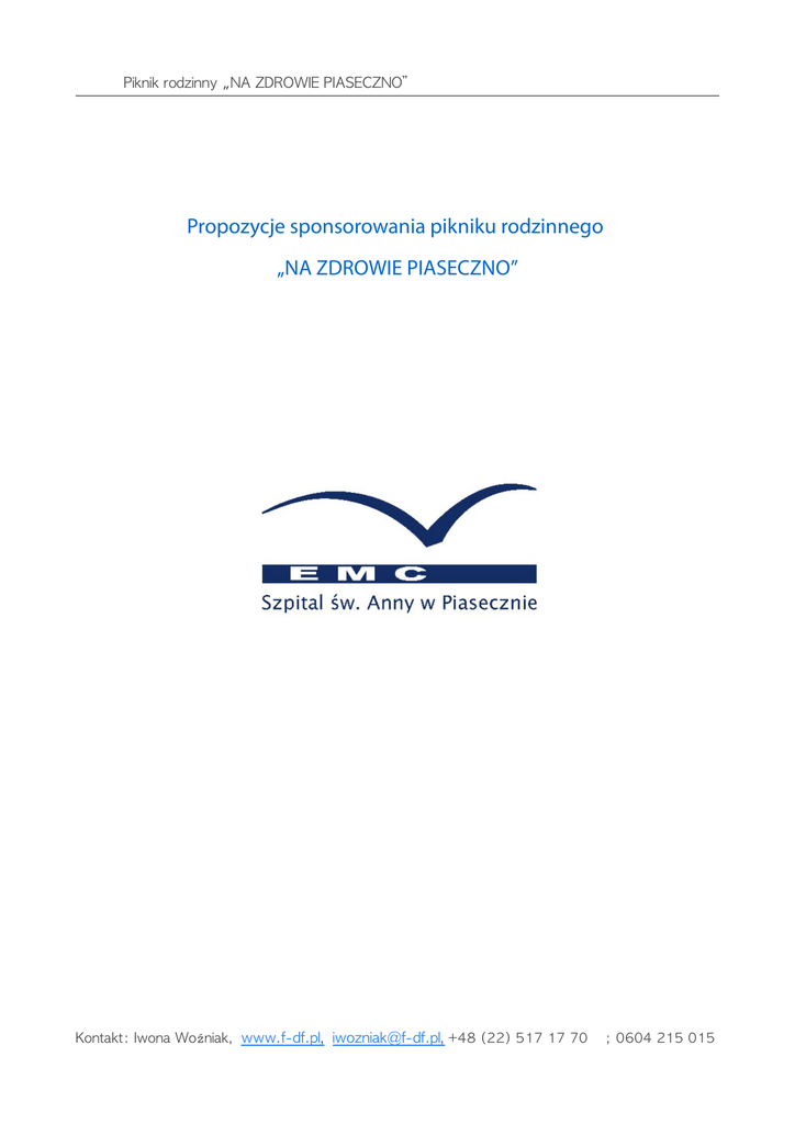 Piknik rodzinny „NA ZDROWIE PIASECZNO” Propozycje sponsorowania pikniku rodzinnego „NA ZDROWIE PIASECZNO” Kontakt: Iwona Woźniak, www.f-df.pl, [email protected], +48 (22) 517 17 70 ; 0604 215 015 Piknik rodzinny „NA ZDROWIE PIASECZNO” Szanowni Państwo, Pragniemy złożyć ofertę wystąpienia Państwa Firmy lub produktu w charakterze Partnera lub Sponsora pikniku rodzinnego „Na zdrowie Piaseczno”, który odbędzie się 8 czerwca 2013 r. w godzinach 11.00-17.00 przy ul. Mickiewicza 39 na terenie Szpitala EMC w Piasecznie. Współorganizatorem pikniku jest Fundacja Dziecięca Fantazja, która od 2003 roku spełnia marzenia dzieci nieuleczalnie chorych. Znaczna część dochodu z pikniku przeznaczona jest na spełnienie marzeń podopiecznych fundacji z Piaseczna i okolic. Do chwili obecnej Fundacja spełniła prawie 3000 marzeń, na spełnienie kolejnych czeka ponad 600 dzieci i wielu przypadkach trzeba się spieszyć. O marzeniach spełnionych i jeszcze tych niespełnionych przeczytacie Państwo na stronie Fundacji. Piknik ma na celu przybliżenie mieszkańcom usług medycznych w Szpitalu św. Anny. Na scenie poszczególne Oddziały prezentować będą ich Ordynatorzy. Na terenie pikniku znajdować się będą stanowiska personelu medycznego z możliwością pomiaru ciśnienia, poziomu cukru, rozmowy z lekarzem. Specjaliści z różnych dziedzin medycyny pracujący w Szpitalu wygłaszać będą krótkie pogadanki dotyczące proflaktyki i leczenia różnych schorzeń. Przerywane będą licznymi konkursami z nagrodami oraz szkoleniami m.in. z pierwszej pomocy. Szczególne zaproszenie do udziału w pikniku skierowane będzie do rodziców ponad 3.000 dzieci urodzonych w Szpitalu św. Anny. Planowane są dla nich liczne atrakcje i wspólne zdjęcie z personelem Oddziału Położniczo-Ginekologicznego. Specjalne niespodzianki przygotowano też dla przyszłych rodziców. Oprócz możliwości rozmowy z położnymi i lekarzami, w niedużych grupach zaplanowano zwiedzanie Oddziału Położniczego oraz Baby Kino, czyli USG dla ciężarnych z możliwością towarzyszenia przyszłych dziadków, czy rodzeństwa. Zarząd Szpitala EMC ORGANIZATOR Zarząd Fundacji Dziecięca Fantazja WSPÓŁORGANIZATOR Zarząd Event 4U Starosta Gminy Piaseczno WSPÓŁORGANIZATOR Kontakt: Iwona Woźniak, www.f-df.pl, [email protected], +48 (22) 517 17 70 PATRON ; 0604 215 015 Piknik rodzinny „NA ZDROWIE PIASECZNO” Propozycje pakietów sponsorskich Partner Koszt: 990 zł brutto Partner otrzymuje: • Otrzymanie statusu Partnera pikniku • Stoisko reklamowe na terenie Parku 4-6 m/kw • Logo Partnera na materiałach reklamowych - plakaty • Możliwość dołączenia gadżetów i upominków firmy dla uczestników pikniku • Reklama Partnera na stronie www.emc.pl i www.f-df.pl , na plazmie mieszczącej się w głównej recepcji szpitala, informacja na stronie FB fundacji Istnieje możliwość wniesienie mniejszej opłaty: 700 zł brutto w przypadku zapewnienia atrakcji dla rodzin (catering, atrakcje dla dzieci i rodzin, wręczanie upominków, niespodzianek) Sponsor VIP Koszt: 1500 zł brutto Partner otrzymuje: • Otrzymanie statusu Sponsora VIP pikniku • Stoisko reklamowe na terenie Parku 4-6 m/kw • Logo Sponsora VIP na materiałach reklamowych - plakaty • Możliwość dołączenia gadżetów i upominków firmy dla uczestników pikniku • Reklama Sponsora VIP na stronie www.emc.pl i www.f-df.pl , na plazmie mieszczącej się w głównej recepcji szpitala, informacja na stronie FB fundacji • Możliwość dystrybucji materiałów reklamowych na terenie pikniku (hostessy) • 3-5 minutowe wystąpienie na scenie (konkurs, promocja połączona z wręczaniem upominków) Kontakt: Iwona Woźniak, www.f-df.pl, [email protected], +48 (22) 517 17 70 ; 0604 215 015 Piknik rodzinny „NA ZDROWIE PIASECZNO” Sponsor Generalny Koszt: 1990 zł brutto Partner otrzymuje: • Otrzymanie statusu Sponsora Generalnego pikniku • Stoisko reklamowe na terenie Parku 4-6 m/kw • Logo Sponsora Generalnego na materiałach reklamowych - plakaty • Możliwość dołączenia gadżetów i upominków firmy dla uczestników pikniku • Reklama Sponsora Generalnego na stronie www.emc.pl i www.f-df.pl , na plazmie mieszczącej się w głównej recepcji szpitala, informacja na stronie FB fundacji • Możliwość dystrybucji materiałów reklamowych na terenie pikniku (hostessy) • 15 min wystąpienie na scenie (możliwy podział na kilka bloków 3-5 minutowych) konkurs, promocja połączona z wręczaniem upominków Istnieje możliwość wniesienia mniejszej opłaty: 1500 zł brutto w przypadku zapewnienia atrakcji dla rodzin (catering, atrakcje dla dzieci i rodzin, wręczanie upominków, niespodzianek) Kontakt: Iwona Woźniak, www.f-df.pl, [email protected], +48 (22) 517 17 70 ; 0604 215 015 Piknik rodzinny „NA ZDROWIE PIASECZNO” Szpital św. Anny w Piasecznie został uruchomiony w lutym 2011 roku. W nowoczesnym budynku znajduje się Oddział Położniczo-Ginekologiczny z Neonatologią, Pediatria oraz Chirurgia. W odnowionej części Szpitala mieści się natomiast Interna oraz Przychodnia, gdzie do dyspozycji pacjentów jest ponad 20 poradni specjalistycznych. Szpital św.Anny realizuje usługi w ramach umowy z Narodowym Funduszem Zdrowia oraz komercyjnie. Szpital Św. Anny oferuje leczenie w następujących zakresach: Ginekologia i Położnictwo z Neonatologią Dzięki wysokiej jakości opiece i życzliwej atmosferze przyszłym mamom zapewniono poczucie bezpieczeństwa. Narodziny odbywają się w pojedynczych, komfortowo wyposażonych salach. Podczas porodu istnieje możliwość wyboru dowolnej pozycji oraz asysty bliskiej osoby. Porody refundowane są przez NFZ. W ofercie znajdują się także ponadstandardowe usługi pełnopłatne takie jak: indywidualna opieka położnej lub lekarza. Ponadto w Oddziale realizowany jest pełen zakres klasycznych operacji ginekologicznych, jak również nowoczesne zabiegi laparoskopo