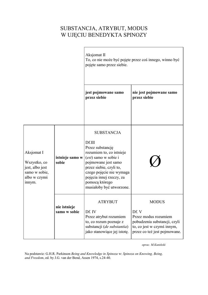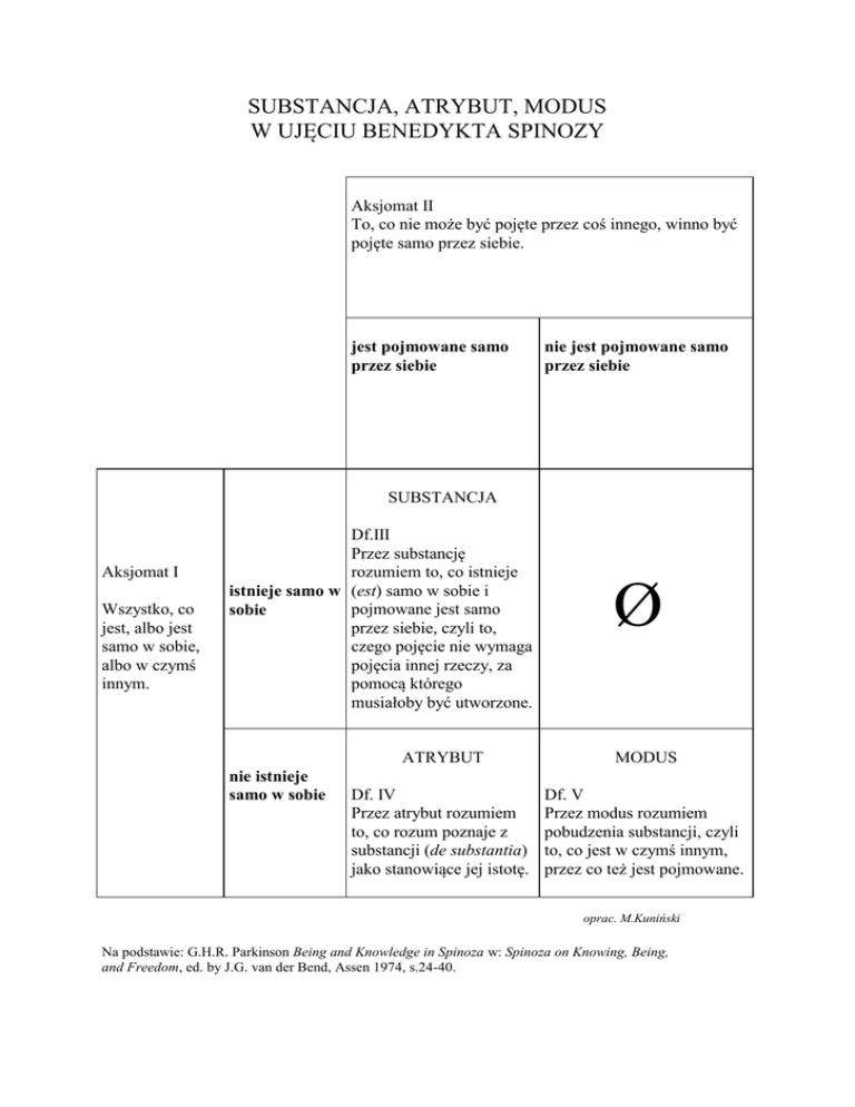 SUBSTANCJA, ATRYBUT, MODUS W UJĘCIU BENEDYKTA SPINOZY Aksjomat II To, co nie może być pojęte przez coś innego, winno być pojęte samo przez siebie. jest pojmowane samo przez siebie nie jest pojmowane samo przez siebie SUBSTANCJA Aksjomat I Wszystko, co jest, albo jest samo w sobie, albo w czymś innym. Df.III Przez substancję rozumiem to, co istnieje istnieje samo w (est) samo w sobie i pojmowane jest samo sobie przez siebie, czyli to, czego pojęcie nie wymaga pojęcia innej rzeczy, za pomocą którego musiałoby być utworzone. nie istnieje samo w sobie Ø ATRYBUT MODUS Df. IV Przez atrybut rozumiem to, co rozum poznaje z substancji (de substantia) jako stanowiące jej istotę. Df. V Przez modus rozumiem pobudzenia substancji, czyli to, co jest w czymś innym, przez co też jest pojmowane. oprac. M.Kuniński Na podstawie: G.H.R. Parkinson Being and Knowledge in Spinoza w: Spinoza on Knowing, Being, and Freedom, ed. by J.G. van der Bend, Assen 1974, s.24-40.