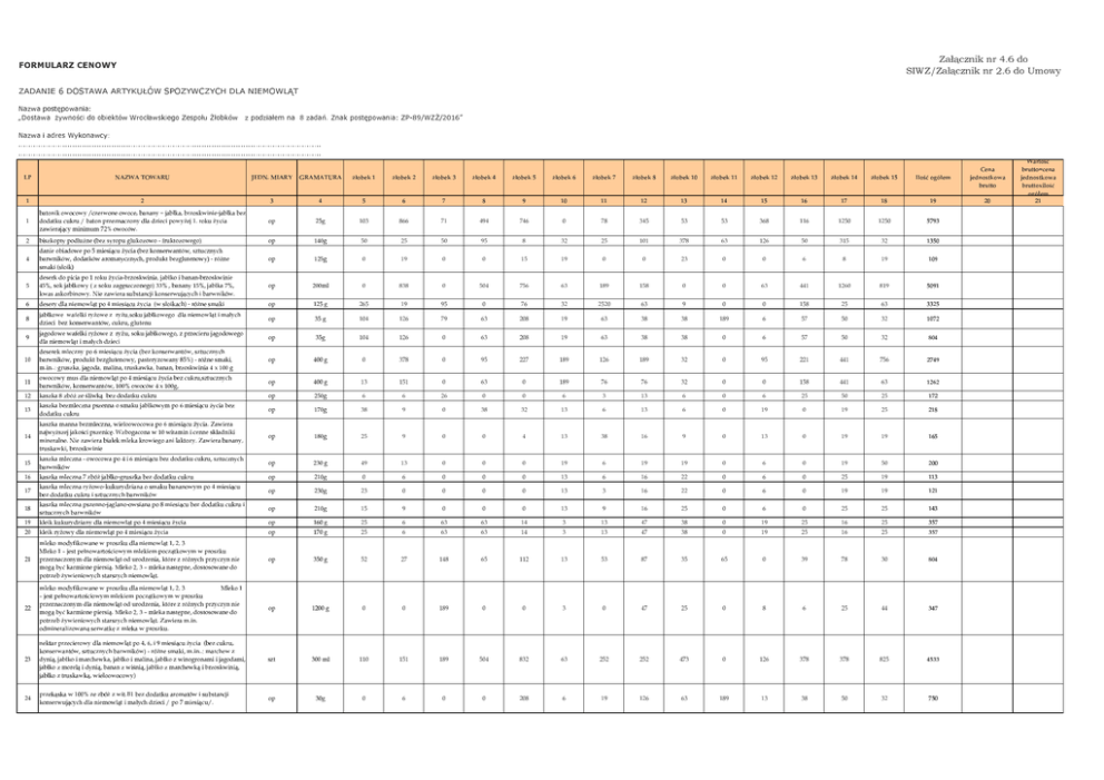Załącznik nr 4.6 do SIWZ/Załącznik nr 2.6 do Umowy FORMULARZ CENOWY ZADANIE 6 DOSTAWA ARTYKUŁÓW SPOZYWCZYCH DLA NIEMOWLĄT Nazwa postępowania: „Dostawa żywności do obiektów Wrocławskiego Zespołu Żłobków z podziałem na 8 zadań. Znak postępowania: ZP-89/WZŻ/2016” Nazwa i adres Wykonawcy: ............................................................................................................................ ............................................................................................................................ LP NAZWA TOWARU JEDN. MIARY GRAMATURA żłobek 1 żłobek 2 żłobek 3 żłobek 4 żłobek 5 żłobek 6 żłobek 7 żłobek 8 żłobek 10 żłobek 11 żłobek 12 żłobek 13 żłobek 14 żłobek 15 Ilość ogółem Cena jednostkowa brutto 20 1 2 3 4 5 6 7 8 9 10 11 12 13 14 15 16 17 18 19 1 batonik owocowy /czerwone owoce, banany – jabłka, brzoskwinie-jabłka bez dodatku cukru / baton przeznaczony dla dzieci powyżej 1. roku życia zawierający minimum 72% owoców. op 25g 103 866 71 494 746 0 78 345 53 53 368 116 1250 1250 5793 2 biszkopty podłużne (bez syropu glukozowo - fruktozowego) op 140g 50 25 50 95 8 32 25 101 378 63 126 50 315 32 1350 4 danie obiadowe po 5 miesiącu życia (bez konserwantów, sztucznych barwników, dodatków aromatycznych, produkt bezglutenowy) - różne smaki (słoik) op 125g 0 19 0 0 15 19 0 0 23 0 0 6 8 19 109 5 deserk do picia po 1 roku życia-brzoskwinia, jabłko i banan-brzoskwinie 45%, sok jabłkowy ( z soku zagęszczonego) 33% , banany 15%, jabłka 7%, kwas askorbinowy. Nie zawiera substancji konserwujących i barwników. op 200ml 0 838 0 504 756 63 189 158 0 0 63 441 1260 819 5091 6 desery dla niemowląt po 4 miesiącu życia (w słoikach) - różne smaki op 125 g 265 19 95 0 76 32 2520 63 9 0 0 158 25 63 3325 8 jabłkowe wafelki ryżowe z ryżu,soku jabłkowego dla niemowląt i małych dzieci bez konserwantów, cukru, glutenu op 35 g 104 126 79 63 208 19 63 38 38 189 6 57 50 32 1072 op 35g 104 126 0 63 208 19 63 38 38 0 6 57 50 32 804 op 400 g 0 378 0 95 227 189 126 189 32 0 95 221 441 756 2749 op 400 g 13 151 0 63 0 189 76 76 32 0 0 158 441 63 1262 op 250g 6 6 26 0 0 6 3 13 6 0 6 25 50 25 172 op 170g 38 9 0 38 32 13 6 13 6 0 19 0 19 25 218 op 180g 25 9 0 0 4 13 38 16 9 0 13 0 19 19 165 op 230 g 49 13 0 0 0 19 6 19 19 0 6 0 19 50 200 op 210g 0 6 0 0 0 13 6 16 22 0 6 0 25 19 113 op 230g 23 0 0 0 0 13 3 16 22 0 6 0 19 19 121 op 210g 15 9 0 0 0 13 9 16 25 0 6 0 25 25 143 op op 160 g 170 g 25 25 6 6 63 63 63 63 14 14 3 3 13 13 47 47 38 38 0 0 19 19 25 25 16 16 25 25 357 357 21 mleko modyfikowane w proszku dla niemowląt 1, 2, 3 Mleko 1 – jest pełnowartościowym mlekiem początkowym w proszku przeznaczonym dla niemowląt od urodzenia, które z różnych przyczyn nie mogą być karmione piersią. Mleko 2, 3 – mleka następne, dostosowane do potrzeb żywieniowych starszych niemowląt. op 350 g 52 27 148 65 112 13 53 87 35 65 0 39 78 30 804 22 mleko modyfikowane w proszku dla niemowląt 1, 2, 3 Mleko 1 – jest pełnowartościowym mlekiem początkowym w proszku przeznaczonym dla niemowląt od urodzenia, które z różnych przyczyn nie mogą być karmione piersią. Mleko 2, 3 – mleka następne, dostosowane do potrzeb żywieniowych starszych niemowląt. Zawiera m.in. odmineralizowaną serwatkę z mleka w proszku. op 1200 g 0 0 189 0 0 3 0 47 25 0 8 6 25 44 347 23 nektar przecierowy dla niemowląt po 4, 6, i 9 miesiącu życia (bez cukru, konserwantów, sztucznych barwników) - różne smaki, m.in..: marchew z dynią, jabłko i marchewka, jabłko i malina, jabłko z winogronami i jagodami, jabłko z morelą i dynią, banan z wiśnią, jabłko z marchewką i brzoskwinią, jabłko z truskawką, wieloowocowy) szt 300 ml 110 151 189 504 832 63 252 252 473 0 126 378 378 825 4533 24 przekąska w 100% ze zbóż z wit.B1 bez dodatku aromatów i substancji konserwujących dla niemowląt i małych dzieci / po 7 miesiącu/. op 30g 0 6 0 0 208 6 19 126 63 189 13 38 50 32 750 9 10 11 12 13 14 15 16 17 18 19 20 jagodowe wafelki ryżowe z ryżu, soku jabłkowego, z przecieru jagodowego dla niemowląt i małych dzieci deserek mleczny po 6 miesiącu życia (bez konserwantów, sztucznych barwników, produkt bezglutenowy, pasteryzowany 85%) - różne smaki, m.in..: gruszka, jagoda, malina, truskawka, banan, brzoskwinia 4 x 100 g owocowy mus dla niemowląt po 4 miesiącu życia bez cukru,sztucznych barwników, konserwantów, 100% owoców 4 x 100g, kaszka 8 zbóż ze śliwką bez dodatku cukru kaszka bezmleczna pszenna o smaku jabłkowym po 6 miesiącu życia bez dodatku cukru kaszka manna bezmleczna, wieloowocowa po 6 miesiącu życia. Zawiera najwyższej jakości pszenicę. Wzbogacona w 10 witamin i cenne składniki mineralne. Nie zawiera białek mleka krowiego ani laktozy. Zawiera banany, truskawki, brzoskwinie kaszka mleczna - owocowa po 4 i 6 miesiącu bez dodatku cukru, sztucznych barwników kaszka mleczna 7 zbóż jabłko-gruszka bez dodatku cukru kaszka mleczna ryżowo-kukurydziana o smaku bananowym po 4 miesiącu bez dodatku cukru i sztucznych barwników kaszka mleczna pszenno-jaglano-owsiana po 8 miesiącu bez dodatku cukru i sztucznych barwników kleik kukurydziany dla niemowląt po 4 miesiącu życia kleik ryżowy dla niemowląt po 4 miesiącu życia Wartość brutto=cena jednostkowa bruttoxilość ogółem 21 25 produkt zbożowy (bezglutenowy, bezlaktozowy, nie zawierający soi) dla niemowląt po 4 miesiącu życia z dodatkiem mączki chleba świętojańskiego op 400g 0 0 63 0 0 0 0 19 0 0 0 0 8 25 115 26 zupka mięsno-jarzynowa po 5 miesiącu życia (bez konserwantów, sztucznych barwników, dodatków aromatycznych, produkt bezglutenowy) (słoik) szt 125 g 0 6 0 0 15 13 64 0 25 0 0 0 6 16 145 27 mleko modyfikowane hipoalergiczne w proszku dla niemowląt 1,2 mleko to jest pełnowartościowym mlekiem początkowym przeznaczonym dla niemowląt, zawiera zhydrolizowane białko op 350g 0 0 32 0 0 0 0 0 0 0 0 0 0 0 32