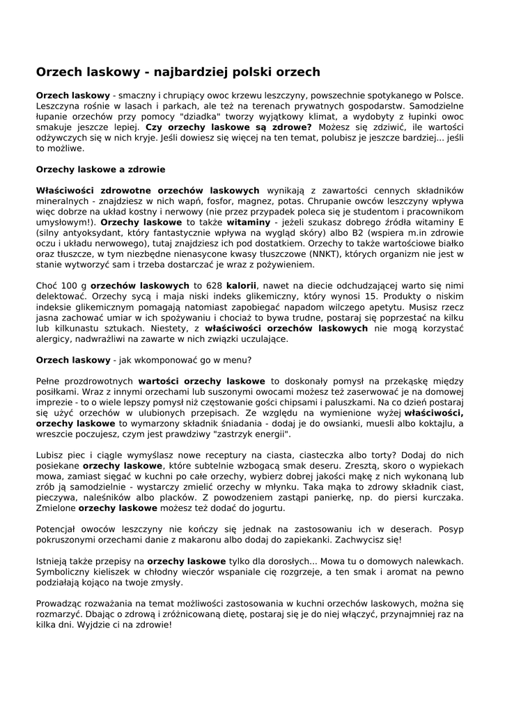 Orzech laskowy - najbardziej polski orzech Orzech laskowy - smaczny i chrupiący owoc krzewu leszczyny, powszechnie spotykanego w Polsce. Leszczyna rośnie w lasach i parkach, ale też na terenach prywatnych gospodarstw. Samodzielne łupanie orzechów przy pomocy "dziadka" tworzy wyjątkowy klimat, a wydobyty z łupinki owoc smakuje jeszcze lepiej. Czy orzechy laskowe są zdrowe? Możesz się zdziwić, ile wartości odżywczych się w nich kryje. Jeśli dowiesz się więcej na ten temat, polubisz je jeszcze bardziej... jeśli to możliwe. Orzechy laskowe a zdrowie Właściwości zdrowotne orzechów laskowych wynikają z zawartości cennych składników mineralnych - znajdziesz w nich wapń, fosfor, magnez, potas. Chrupanie owców leszczyny wpływa więc dobrze na układ kostny i nerwowy (nie przez przypadek poleca się je studentom i pracownikom umysłowym!). Orzechy laskowe to także witaminy - jeżeli szukasz dobrego źródła witaminy E (silny antyoksydant, który fantastycznie wpływa na wygląd skóry) albo B2 (wspiera m.in zdrowie oczu i układu nerwowego), tutaj znajdziesz ich pod dostatkiem. Orzechy to także wartościowe białko oraz tłuszcze, w tym niezbędne nienasycone kwasy tłuszczowe (NNKT), których organizm nie jest w stanie wytworzyć sam i trzeba dostarczać je wraz z pożywieniem. Choć 100 g orzechów laskowych to 628 kalorii, nawet na diecie odchudzającej warto się nimi delektować. Orzechy sycą i maja niski indeks glikemiczny, który wynosi 15. Produkty o niskim indeksie glikemicznym pomagają natomiast zapobiegać napadom wilczego apetytu. Musisz rzecz jasna zachować umiar w ich spożywaniu i chociaż to bywa trudne, postaraj się poprzestać na kilku lub kilkunastu sztukach. Niestety, z właściwości orzechów laskowych nie mogą korzystać alergicy, nadwrażliwi na zawarte w nich związki uczulające. Orzech laskowy - jak wkomponować go w menu? Pełne prozdrowotnych wartości orzechy laskowe to doskonały pomysł na przekąskę między posiłkami. Wraz z innymi orzechami lub suszonymi owocami możesz też zaserwować je na domowej imprezie - to o wiele lepszy pomysł niż częstowanie gości chipsami i paluszkami. Na co dzień postaraj się użyć orzechów w ulubionych przepisach. Ze względu na wymienione wyżej właściwości, orzechy laskowe to wymarzony składnik śniadania - dodaj je do owsianki, muesli albo koktajlu, a wreszcie poczujesz, czym jest prawdziwy "zastrzyk energii". Lubisz piec i ciągle wymyślasz nowe receptury na ciasta, ciasteczka albo torty? Dodaj do nich posiekane orzechy laskowe, które subtelnie wzbogacą smak deseru. Zresztą, skoro o wypiekach mowa, zamiast sięgać w kuchni po całe orzechy, wybierz dobrej jakości mąkę z nich wykonaną lub zrób ją samodzielnie - wystarczy zmielić orzechy w młynku. Taka mąka to zdrowy składnik ciast, pieczywa, naleśników albo placków. Z powodzeniem zastąpi panierkę, np. do piersi kurczaka. Zmielone orzechy laskowe możesz też dodać do jogurtu. Potencjał owoców leszczyny nie kończy się jednak na zastosowaniu ich w deserach. Posyp pokruszonymi orzechami danie z makaronu albo dodaj do zapiekanki. Zachwycisz się! Istnieją także przepisy na orzechy laskowe tylko dla dorosłych... Mowa tu o domowych nalewkach. Symboliczny kieliszek w chłodny wieczór wspaniale cię rozgrzeje, a ten smak i aromat na pewno podziałają kojąco na twoje zmysły. Prowadząc rozważania na temat możliwości zastosowania w kuchni orzechów laskowych, można się rozmarzyć. Dbając o zdrową i zróżnicowaną dietę, postaraj się je do niej włączyć, przynajmniej raz na kilka dni. Wyjdzie ci na zdrowie! Powered by TCPDF (www.tcpdf.org)