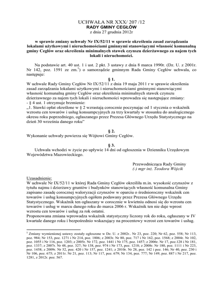 UCHWAŁA NR XXX/ 207 /12 RADY GMINY CEGŁÓW z dnia 27 grudnia 2012r w sprawie zmiany uchwały Nr IX/52/11 w sprawie określenia zasad zarządzania lokalami użytkowymi i nieruchomościami gminnymi stanowiącymi własność komunalną gminy Cegłów oraz określenia minimalnych stawek czynszu dzierżawnego za najem tych lokali i nieruchomości. Na podstawie art. 40 ust. 1 i ust. 2 pkt. 3 ustawy z dnia 8 marca 1990r. (Dz. U. z 2001r. Nr 142, poz. 1591 ze zm.1) o samorządzie gminnym Rada Gminy Cegłów uchwala, co następuje: § 1. W uchwale Rady Gminy Cegłów Nr IX/52/11 z dnia 19 maja 2011 r w sprawie określenia zasad zarządzania lokalami użytkowymi i nieruchomościami gminnymi stanowiącymi własność komunalną gminy Cegłów oraz określenia minimalnych stawek czynszu dzierżawnego za najem tych lokali i nieruchomości wprowadza się następujące zmiany: - § 4 ust. 1 otrzymuje brzmienie: „1. Stawki opłat określone w § 2 wzrastają corocznie poczynając od 1 stycznia o wskaźnik wzrostu cen towarów i usług konsumpcyjnych za trzy kwartały w stosunku do analogicznego okresu roku poprzedniego, ogłaszanego przez Prezesa Głównego Urzędu Statystycznego na dzień 30 września danego roku” § 2. Wykonanie uchwały powierza się Wójtowi Gminy Cegłów. § 3. Uchwała wchodzi w życie po upływie 14 dni od ogłoszenia w Dzienniku Urzędowym Województwa Mazowieckiego. Przewodnicząca Rady Gminy (-) mgr inż. Teodora Wójcik Uzasadnienie: W uchwale Nr IX/52/11 w której Rada Gminy Cegłów określiła m.in. wysokość czynszów z tytułu najmu i dzierżawy gruntów i budynków stanowiących własność komunalna Gminy zapisano zasadę corocznej waloryzacji czynszów w oparciu o średnioroczny wskaźnik cen towarów i usług konsumpcyjnych ogółem podawany przez Prezesa Głównego Urzędu Statystycznego. Wskaźnik ten ogłaszany w corocznie w kwietniu odnosi się do wzrostu cen towarów i usług w marcu danego roku do marca 2006 r. Wskaźnik ten nie daje wprost wzrostu cen towarów i usług za rok ostatni. Proponowana zmiana wprowadza wskaźnik statystyczny liczony rok do roku, ogłaszany w IV kwartale danego roku i bezpośrednio wskazujący na procentowy wzrost cen towarów i usług. 1 Zmiany wymienionej ustawy zostały ogłoszone w Dz. U. z 2002r.. Nr 23, poz. 220; Nr 62, poz. 558; Nr 113, poz. 984; Nr 153, poz. 1271 i Nr 214, poz. 1806; z 2003r. Nr 80, poz. 717 i Nr 162, poz. 1568; z 2004r. Nr 102, poz. 1055 i Nr 116, poz. 1203; z 2005r. Nr 172, poz. 1441 i Nr 175, poz. 1457; z 2006r. Nr 17, poz.128 i Nr 181, poz. 1337; z 2007r. Nr 48, poz. 327; Nr 138, poz. 974 i Nr 173, poz. 1218; z 2008r. Nr 180, poz. 1111 i Nr 223, poz. 1458; z 2009r. Nr 52, poz. 420 i Nr 157, poz. 1241; z 2010r. Nr 28, poz. 142 i poz. 146; Nr 40, poz. 230 i Nr 106, poz. 675; z 2011r. Nr 21, poz. 113; Nr 117, poz. 679; Nr 134, poz. 777; Nr 149, poz. 887 i Nr 217, poz. 1281, z 2012r. poz. 567.