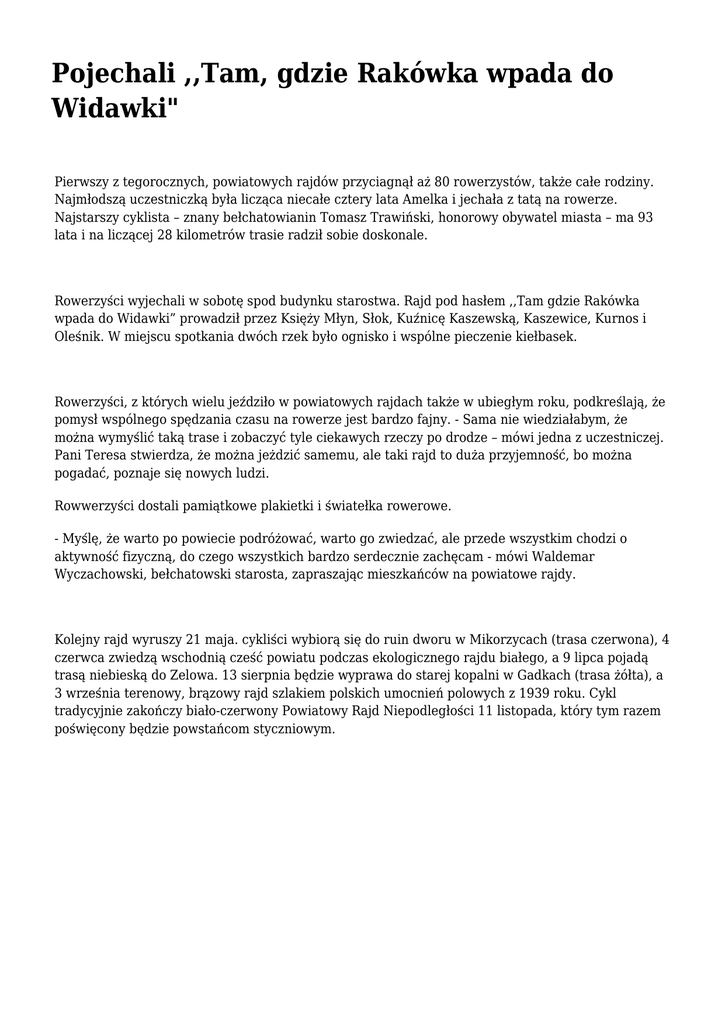 Pojechali ,,Tam, gdzie Rakówka wpada do Widawki" Pierwszy z tegorocznych, powiatowych rajdów przyciagnął aż 80 rowerzystów, także całe rodziny. Najmłodszą uczestniczką była licząca niecałe cztery lata Amelka i jechała z tatą na rowerze. Najstarszy cyklista – znany bełchatowianin Tomasz Trawiński, honorowy obywatel miasta – ma 93 lata i na liczącej 28 kilometrów trasie radził sobie doskonale. Rowerzyści wyjechali w sobotę spod budynku starostwa. Rajd pod hasłem ,,Tam gdzie Rakówka wpada do Widawki” prowadził przez Księży Młyn, Słok, Kuźnicę Kaszewską, Kaszewice, Kurnos i Oleśnik. W miejscu spotkania dwóch rzek było ognisko i wspólne pieczenie kiełbasek. Rowerzyści, z których wielu jeździło w powiatowych rajdach także w ubiegłym roku, podkreślają, że pomysł wspólnego spędzania czasu na rowerze jest bardzo fajny. - Sama nie wiedziałabym, że można wymyślić taką trase i zobaczyć tyle ciekawych rzeczy po drodze – mówi jedna z uczestniczej. Pani Teresa stwierdza, że można jeżdzić samemu, ale taki rajd to duża przyjemność, bo można pogadać, poznaje się nowych ludzi. Rowwerzyści dostali pamiątkowe plakietki i światełka rowerowe. - Myślę, że warto po powiecie podróżować, warto go zwiedzać, ale przede wszystkim chodzi o aktywność fizyczną, do czego wszystkich bardzo serdecznie zachęcam - mówi Waldemar Wyczachowski, bełchatowski starosta, zapraszając mieszkańców na powiatowe rajdy. Kolejny rajd wyruszy 21 maja. cykliści wybiorą się do ruin dworu w Mikorzycach (trasa czerwona), 4 czerwca zwiedzą wschodnią cześć powiatu podczas ekologicznego rajdu białego, a 9 lipca pojadą trasą niebieską do Zelowa. 13 sierpnia będzie wyprawa do starej kopalni w Gadkach (trasa żółta), a 3 września terenowy, brązowy rajd szlakiem polskich umocnień polowych z 1939 roku. Cykl tradycyjnie zakończy biało-czerwony Powiatowy Rajd Niepodległości 11 listopada, który tym razem poświęcony będzie powstańcom styczniowym.