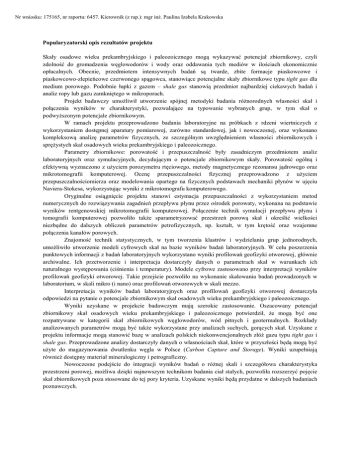 Nr wniosku: 175165, nr raportu: 6457. Kierownik (z rap.): mgr inż. Paulina Izabela Krakowska Popularyzatorski opis rezultatów projektu Skały osadowe wieku prekambryjskiego i paleozoicznego mogą wykazywać potencjał zbiornikowy, czyli zdolność do gromadzenia węglowodorów i wody oraz oddawania tych mediów w ilościach ekonomicznie opłacalnych. Obecnie, przedmiotem intensywnych badań są twarde, zbite formacje piaskowcowe i piaskowcowo-zlepieńcowe czerwonego spągowca, stanowiące potencjalne skały zbiornikowe typu tight gas dla medium porowego. Podobnie łupki z gazem – shale gas stanowią przedmiot najbardziej ciekawych badań i analiz ropy lub gazu zamkniętego w mikroporach. Projekt badawczy umożliwił utworzenie spójnej metodyki badania różnorodnych własności skał i połączenia wyników w charakterystyki, pozwalające na typowanie wybranych grup, w tym skał o podwyższonym potencjale zbiornikowym. W ramach projektu przeprowadzono badania laboratoryjne na próbkach z rdzeni wiertniczych z wykorzystaniem dostępnej aparatury pomiarowej, zarówno standardowej, jak i nowoczesnej, oraz wykonano kompleksową analizę parametrów fizycznych, ze szczególnym uwzględnieniem własności zbiornikowych i sprężystych skał osadowych wieku prekambryjskiego i paleozoicznego. Parametry zbiornikowe: porowatość i przepuszczalność były zasadniczym przedmiotem analiz laboratoryjnych oraz symulacyjnych, decydującym o potencjale zbiornikowym skały. Porowatość ogólną i efektywną wyznaczono z użyciem porozymetru rtęciowego, metody magnetycznego rezonansu jądrowego oraz mikrotomografii komputerowej. Ocenę przepuszczalności fizycznej przeprowadzono z użyciem przepuszczalnościomierza oraz modelowania opartego na fizycznych podstawach mechaniki płynów w ujęciu Naviera-Stokesa, wykorzystując wyniki z mikrotomografu komputerowego. Oryginalne osiągnięcie projektu stanowi estymacja przepuszczalności z wykorzystaniem metod numerycznych do rozwiązywania zagadnień przepływu płynu przez ośrodek porowaty, wykonana na podstawie wyników rentgenowskiej mikrotomografii komputerowej. Połączenie technik symulacji przepływu płynu i tomografii komputerowej pozwoliło także sparametryzować przestrzeń porową skał i określić wielkości niezbędne do dalszych obliczeń parametrów petrofizycznych, np. kształt, w tym krętość oraz wzajemne połączenia kanałów porowych. Znajomość technik statystycznych, w tym tworzenia klastrów i wydzielania grup jednorodnych, umożliwiło utworzenie modeli cyfrowych skał na bazie wyników badań laboratoryjnych. W celu poszerzenia punktowych informacji z badań laboratoryjnych wykorzystano wyniki profilowań geofizyki otworowej, głównie archiwalne. Ich przetworzenie i interpretacja dostarczyły danych o parametrach skał w warunkach ich naturalnego występowania (ciśnienia i temperatury). Modele cyfrowe zastosowano przy interpretacji wyników profilowań geofizyki otworowej. Takie przejście pozwoliło na wykonanie skalowania badań prowadzonych w laboratorium, w skali mikro (i nano) oraz profilowań otworowych w skali mezzo. Interpretacja wyników badań laboratoryjnych oraz profilowań geofizyki otworowej dostarczyła odpowiedzi na pytanie o potencjale zbiornikowym skał osadowych wieku prekambryjskiego i paleozoicznego. Wyniki uzyskane w projekcie badawczym mają szerokie zastosowanie. Oszacowany potencjał zbiornikowy skał osadowych wieku prekambryjskiego i paleozoicznego potwierdził, że mogą być one rozpatrywane w kategorii skał zbiornikowych węglowodorów, wód pitnych i geotermalnych. Rozkłady analizowanych parametrów mogą być także wykorzystane przy analizach suchych, gorących skał. Uzyskane z projektu informacje mogą stanowić bazę w analizach polskich niekonwencjonalnych złóż gazu typu tight gas i shale gas. Przeprowadzone analizy dostarczyły danych o własnościach skał, które w przyszłości będą mogą być użyte do magazynowania dwutlenku węgla w Polsce (Carbon Capture and Storage). Wyniki uzupełniają również dostępny materiał mineralogiczny i petrograficzny. Nowoczesne podejście do integracji wyników badań o różnej skali i szczegółowa charakterystyka przestrzeni porowej, możliwa dzięki najnowszym technikom badania ciał stałych, pozwoliła rozszerzyć pojęcie skał zbiornikowych poza stosowane do tej pory kryteria. Uzyskane wyniki będą przydatne w dalszych badaniach poznawczych.