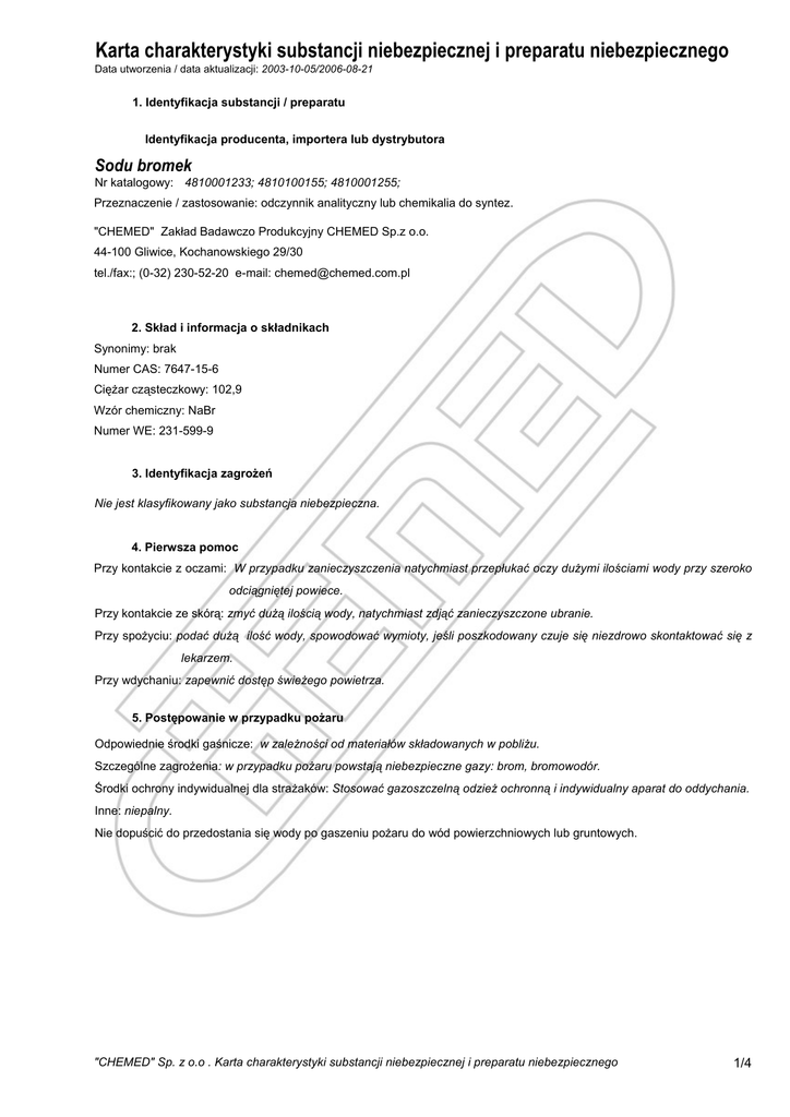 Karta charakterystyki substancji niebezpiecznej i preparatu niebezpiecznego Data utworzenia / data aktualizacji: 2003-10-05/2006-08-21 1. Identyfikacja substancji / preparatu Identyfikacja producenta, importera lub dystrybutora Sodu bromek Nr katalogowy: 4810001233; 4810100155; 4810001255; Przeznaczenie / zastosowanie: odczynnik analityczny lub chemikalia do syntez. "CHEMED" Zakład Badawczo Produkcyjny CHEMED Sp.z o.o. 44-100 Gliwice, Kochanowskiego 29/30 tel./fax:; (0-32) 230-52-20 e-mail: [email protected] 2. Skład i informacja o składnikach Synonimy: brak Numer CAS: 7647-15-6 Ciężar cząsteczkowy: 102,9 Wzór chemiczny: NaBr Numer WE: 231-599-9 3. Identyfikacja zagrożeń Nie jest klasyfikowany jako substancja niebezpieczna. 4. Pierwsza pomoc Przy kontakcie z oczami: W przypadku zanieczyszczenia natychmiast przepłukać oczy dużymi ilościami wody przy szeroko odciągniętej powiece. Przy kontakcie ze skórą: zmyć dużą ilością wody, natychmiast zdjąć zanieczyszczone ubranie. Przy spożyciu: podać dużą ilość wody, spowodować wymioty, jeśli poszkodowany czuje się niezdrowo skontaktować się z lekarzem. Przy wdychaniu: zapewnić dostęp świeżego powietrza. 5. Postępowanie w przypadku pożaru Odpowiednie środki gaśnicze: w zależności od materiałów składowanych w pobliżu. Szczególne zagrożenia: w przypadku pożaru powstają niebezpieczne gazy: brom, bromowodór. Środki ochrony indywidualnej dla strażaków: Stosować gazoszczelną odzież ochronną i indywidualny aparat do oddychania. Inne: niepalny. Nie dopuścić do przedostania się wody po gaszeniu pożaru do wód powierzchniowych lub gruntowych. "CHEMED" Sp. z o.o . Karta charakterystyki substancji niebezpiecznej i preparatu niebezpiecznego 1/4 Sodu bromek 6. Postępowanie w przypadku niezamierzonego uwolnienia do środowiska Zebrać na sucho, przekazać do likwidacji. Oczyścić zanieczyszczony teren. Nie dopuścić do dostania się do wód, ścieków i gleby. Unikać pylenia. Nie wdychać pyłów. 7. Postępowanie z substancją / preparatem i jej / jego magazynowanie Obchodzenie się z substancją: Zapewnić skuteczną wymianę powietrza (wentylacja). Postępować zgodnie z zasadami dobrej praktyki przemysłowej oraz ogólnymi zasadami bezpieczeństwa i higieny pracy z substancjami chemicznymi. Stosować środki ochrony osobistej zgodnie z pkt.8. Nie opróżniać do kanalizacji. Magazynowanie: szczelne opakowania, suche pomieszczenie. Temperatura pokojowa (wskazane od+15 do +25 °C). 8. Kontrola narażenia i środki ochrony indywidualnej Parametry kontroli (NDS, NDSCh, NDSP): nie ustalone Stosować odpowiednią wentylację wywiewną, miejscową i ogólną zapewniającą utrzymanie stężenia produktu w powietrzu poniżej określonych limitów (minimum 10-krotna wymiana powietrza na godzinę). Zaleca się wyposażenie miejsca pracy w wodny natrysk do płukania oczu oraz prysznic. Środki ochrony indywidualnej powinny być tak zaprojektowane i wykonane aby wykluczały zagrożenie i inne niedogodności w przewidywanych warunkach użytkowania, chroniące przed chemikaliami. Dz. U. nr 217, Rozporządzenie z dnia 29 listopada 2002 (poz. 1833); Dz. U. nr 80, Rozporządzenie z dnia 31 marca 2003 (poz. 725), Dz. U. nr212(poz. 1769), Rozporządzenie Ministra Gospodarki i Pracy z dnia 10 października 2005 Środki ochrony indywidualnej: ochrona dróg oddechowych: konieczna gdy występuje pylenie - respirator ochrona oczu: konieczna - okulary ochronne typu gogle ochrona rąk: konieczna – rękawice ochronne, chroniące przed chemikaliami (znak CE) ochrona ciała: ubranie ochronne środki ochronne i higieny: zmienić zanieczyszczone ubranie, wymyć ręce po pracy z tą substancją. 9. Własności fizykochemiczne Forma: ciało stałe lepkość dynamiczna: Kolor: biały lepkość kinematyczna: Zapach: bez zapachu Ciśnienie par: brak danych pH: około 5,4 ( 50 g/l H2O, 20 °C) Gęstość: 3,2 g/cm3 (20°C) Temperatura topnienia: 755°C Ciężar nasypowy: około 1750 kg/m3 Temperatura wrzenia: 1390°C Rozpuszczalność: Temperatura samozapłonu: nie dotyczy w wodzie: 905 g/l (20°C) Temperatura zapłonu: nie dotyczy w rozpuszczalnikach organicznych: etanol 22 g/l Granice wybuchowości: nie dotyczy log P(w/o): dolna: górna: "CHEMED" Sp. z o.o . Karta charakterystyki substancji niebezpiecznej i preparatu niebezpiecznego 2/4 Sodu bromek 10. Stabilność i reaktywność Warunki których należy unikać: brak Materiały których należy unikać: związki typu halogen-halogen, metale alkaiczne, silne kwasy. Niebezpieczne produkty rozkładu: brak Następne dane: czuły na światło, higroskopijny 11. Informacje toksykologiczne Informacje toksykologiczne: LD50 (doustnie, szczury): 3500 mg/kg, LD50 (skóra, królik): >2000 mg/kg. Pozostałe dane: u osób predysponowanych może wywołać alergię; spożycie: zmęczenie; spożycie dużych ilości: ataksja, wymioty, spazmy. 12. Informacje ekologiczne Toksyczność: Ryby: L. idus: LC50: 10000 mg/l, P. reticulata LC50:16000 mg/l/96h; Daphnia: Daphnia magna: EC50: 5800 mg/l/48h. Nie dopuszczać do dostania się do wód, ścieków lub gleby. 13. Postępowanie z odpadami ZBP CHEMED przyjmuje do likwidacji substancje i opakowania po tych substancjach zakupione w ZBP CHEMED. Utylizacją odpadów powinny zająć się wyspecjalizowane firmy. Opakowanie jednorazowego ubytku traktować jak odpad i przekazać odbiorcy odpadów. Sposób likwidacji zebranych odpadów uzgodnić z właściwym terenowo wydziałem ochrony środowiska. Ustawy z dnia 27.04.2001 (Dz. U. nr 62, poz. 628), z dnia 11.05.2001 (Dz. U. nr 63 poz. 638)z poźn. zm. Rozporządzenie z dnia 27.09.2001 (Dz. U. nr 112, poz. 1206) 14. Informacje o transporcie Klasa ADR i grupa pakowania: nie jest przedmiotem przepisów transportowych Numer UN: nie dotyczy Nazwa materiału (wg UN): nie dotyczy "CHEMED" Sp. z o.o . Karta charakterystyki substancji niebezpiecznej i preparatu niebezpiecznego 3/4 Sodu bromek 15. Informacje doty