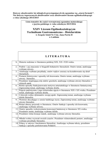 Dotyczy absolwentów lat ubiegłych przystępujących do egzaminu wg „starej formuły”. Nie dotyczy tegorocznych absolwentów oraz absolwentów liceum ogólnokształcącego z roku szkolnego 2014/2015 Lista tematów do części wewnętrznej egzaminu maturalnego z języka polskiego w roku szkolnym 2015/2016 w XXIV Liceum Ogólnokształcącym Technikum Gastronomiczno - Hotelarskim w Zespole Szkół Nr 5 im. Jana Pawła II w Lublinie LITERATURA 1. Historie rodzinne w literaturze polskiej XIX, XX i XXI wieku. 2. Podróż i jej znaczenie w biografii bohaterów literackich. Omów temat, analizując wybrane utwory. 3. Analizując wybrane przykłady, omów wpływ cenzury na kształtowanie się dzieł literackich. 4. Postacie historyczne i sposoby ich kreowania. Omów temat, analizując wybrane utwory literackie. 5. Przedstaw inspirującą rolę mitów greckich, analizując wybrane utwory literackie z różnych epok. 6. Różne sposoby funkcjonowania motywu arturiańskiego w literaturze fantastycznej. Zaprezentuj temat, analizując wybrane dzieła. 7. Pojęcie patriotyzmu i jego różnorodne ujęcia w literaturze XIX i XX wieku. Przedstaw temat, analizując wybrane dzieła. 8. Człowiek wobec dylematów swojej epoki. Zaprezentuj temat, analizując wybrane dzieła literackie. 9. Wartości decydujące o sensie ludzkiego życia. Zaprezentuj temat, analizując wybrane utwory literackie. 10. Różne obrazy przyrody w literaturze. Omów funkcje i sposoby ich kreowania, analizując wybrane utwory. 11. Omów sposoby wykorzystania konwencji baśniowej w literaturze XX wieku. Przedstaw temat, analizując wybrane dzieła. 12. Przedstaw różne kreacje matek, analizując wybrane utwory literackie. 13. Młodzi wobec wyzwań swoich czasów. Przedstaw różnorodność postaw, analizując wybrane przykłady literackie. 14. Polacy w satyrze i karykaturze literackiej. Analizując wybrane teksty, przedstaw funkcje i sposoby portretowania Polaków. 1 15. Zaprezentuj na wybranych przykładach słynne małżeństwa wykreowane w literaturze. 16. Marzenia Polaków o wolności. Przedstaw temat, analizując wybrane utwory literackie. 17. Przedstaw „dialog” człowieka z Bogiem na podstawie analizy wybranych utworów literackich. 18. Literackie obrazy i oceny rewolucji społecznej. Omów temat, wykorzystując analizę wybranych utworów. 19. Zaprezentuj funkcjonowanie motywu tańca, analizując wybrane przykłady literackie. 20. Literackie portrety idealistów i marzycieli. Scharakteryzuj bohaterów, analizując wybrane utwory. 21. Motywy katastroficzne i sposoby ich przedstawiania w literaturze. Omów temat, analizując wybrane teksty. 22. Literackie powroty do Arkadii dzieciństwa lub młodości. Omów temat, analizując wybrane utwory z różnych epok. 23. Analizując wybrane teksty, przedstaw funkcjonowanie motywu anioła w literaturze. 24. Bohater literacki poszukujący sensu życia. Omów temat, analizując wybrane utwory różnych epok. 25. Opisz i oceń relacje rodzice – dzieci, analizując wybrane utwory literackie z różnych epok. 26. Zaprezentuj funkcjonowanie motywu dworu w wybranych utworach literackich różnych epok. 27. Literackie rozmowy przyjaciół. Przedstaw temat, analizując wybrane utwory literackie. 28. Zderzenie wyobrażeń o świecie z rzeczywistością. Zaprezentuj temat, analizując wybrane dzieła literackie. 29. Dialog z tradycją romantyczną w literaturze XX wieku. Zaprezentuj temat, analizując wybrane dzieła. 30. Różne portrety Polek wykreowane przez literaturę. Omów zagadnienie na wybranych przykładach. 31. Koncepcje poety i poezji w literaturze różnych epok. Przedstaw temat, analizując wybrane utwory . 32. Wizerunek Boga w literaturze z różnych epok. Przedstaw temat, analizując wybrane dzieła. 33. Bohaterowie niepogodzeni ze światem. Scharakteryzuj ich postawy, analizując wybrane utwory literackie różnych epok. 34. Postacie wielkich wodzów i sposoby ich kreowania. Omów temat, analizując wybrane utwory literackie. 35. Powstania narodowe w literaturze. Zaprezentuj temat, analizując wybrane dzieła. 36. Mała ojczyzna. Wyjaśnij funkcję motywu, analizując wybrane teksty literackie z różnych epok. 37. Najsłynniejsze drzewa w literaturze i ich symbolika. Przedstaw na wybranych przykładach. 38. Analizując wybrane utwory z różnych epok – wykaż inspirującą rolę Biblii w dziejach literatury. 39. Motto, tytuł, ostatnia scena jako klucze do interpretacji dzieła. Przedstaw zagadnienie 2 na wybranych przykładach. 40. Przedstaw literackie obrazy miasta, analizując wybrane teksty z różnych epok. 41. Wzorce osobowe a światopogląd epoki, w której powstały. Rozważ temat, analizując wybrane utwory literackie. 42. Modlitwa jako motyw w literaturze. Przestaw temat, analizując wybrane utwory. 43. Wartości więźniów lagrów i łagrów ukazane w literaturze XX w. Przedstaw temat, analizując wybrane utwory. 44. Rola służby w utworach komediowych. Omów zagadnienie na wybranych przykładach z dwóch epok. 45. Zaprezentuj kreacje ludzi szczęśliwych, analizując wybrane utwory. 46. Koncepcja człowieka w twórczości Karola Wojtyły. Omów temat, analizując wybrane utwory. 47. Dyskusje o Polsce w wybranych utworach literackich. Przedstaw temat na podstawie dokonanych analiz. 48. Dialog pokoleń w literaturze. Omów temat, analizując wybrane utwory. 49. Trudne rozmowy w literaturze. Przedstaw temat, analizując wybrane teksty z różnych epok. 50. Oj Topos ojca w literaturze. Omów temat na podstawie utworów z różnych epok. 51. Być albo nie być? Przedstaw kreacje bohaterów, szukających odpowiedzi na po postawione w temacie pytanie. 52. Analizując wybrane teksty literackie - wyjaśnij, jaką rolę w życiu człowieka odgrywa cie ciekawość świata. 53. Literatura o mędrcach i mądrości. Przedstaw ujęcia tego motywu na podstawie analizy wybranych utworów.. 54. Zaprezentuj motyw snu w literaturze. Omów temat, analizując wybrane teksty li
