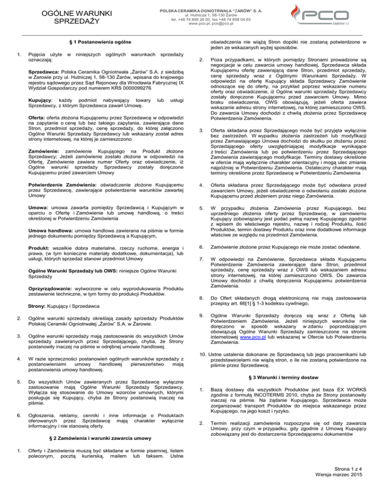OGÓLNE WARUNKI SPRZEDAŻY POLSKA CERAMIKA OGNIOTRWAŁA “ŻARÓW” S. A. ul. Hutnicza 1, 58-130 Żarów tel. +48 74 856 26 00, fax +48 74 858 04 65 www.pco.pl, [email protected] § 1 Postanowienia ogólne 1. oświadczenia nie wiążą Stron dopóki nie zostaną potwierdzone w jeden ze wskazanych wyżej sposobów. Pojęcia użyte w niniejszych ogólnych warunkach sprzedaży oznaczają: 2. Poza przypadkami, w których pomiędzy Stronami prowadzone są negocjacje w celu zawarcia umowy handlowej, Sprzedawca składa Kupującemu ofertę zawierającą dane Stron, przedmiot sprzedaży, cenę sprzedaży wraz z Ogólnymi Warunkami Sprzedaży. W odpowiedzi na ofertę Kupujący składa Sprzedawcy Zamówienie odnoszące się do oferty, na przykład poprzez wskazanie numeru oferty oraz oświadczenie, iż Ogólne warunki sprzedaży Sprzedawcy zostały doręczone Kupującemu przed zawarciem Umowy. Mimo braku oświadczenia, OWS obowiązują, jeżeli oferta zawiera wskazanie adresu strony internetowej, na której zamieszczono OWS. Do zawarcia Umowy dochodzi z chwilą złożenia przez Sprzedawcę Potwierdzenia Zamówienia. 3. Oferta składana przez Sprzedającego może być przyjęta wyłącznie bez zastrzeżeń. W wypadku złożenia zastrzeżeń lub modyfikacji przez Zamawiającego Umowa dochodzi do skutku po złożeniu przez Sprzedającego oferty uwzględniającej modyfikacje wynikające z treści Zamówienia lub po potwierdzeniu przez Sprzedającego Zamówienia zawierającego modyfikacje. Terminy dostawy określone w ofercie mają wyłącznie charakter orientacyjny i mogą ulec zmianie najpóźniej w Potwierdzeniu Zamówienia. Ostateczny charakter mają terminy określone przez Sprzedawcę w Potwierdzeniu Zamówienia Potwierdzenie Zamówienia: oświadczenie złożone Kupującemu przez Sprzedawcę, zawierające potwierdzenie warunków zawartej Umowy 4. Oferta składana przez Sprzedającego może być odwołana przed zawarciem Umowy, jeżeli oświadczenie o odwołaniu zostało złożone Kupującemu przed złożeniem przez niego Zamówienia. Umowa: umowa zawarta pomiędzy Sprzedawcą i Kupującym w oparciu o Ofertę i Zamówienie lub umowę handlową, o treści określonej w Potwierdzeniu Zamówienia 5. W przypadku złożenia Zamówienia przez Kupującego, bez uprzedniego złożenia oferty przez Sprzedawcę, w zamówieniu Kupujący zobowiązany jest podać pełną nazwę Kupującego zgodnie z wpisem do właściwego rejestru, nazwę i rodzaj Produktu, ilość Produktów, termin dostawy Produktu oraz inne dodatkowe informacje właściwe ze względu na przedmiot Zamówienia. 6. Zamówienie złożone przez Kupującego nie może zostać odwołane. 7. W odpowiedzi na Zamówienie, Sprzedawca składa Kupującemu Potwierdzenie Zamówienia zawierające dane Stron, przedmiot sprzedaży, cenę sprzedaży wraz z OWS lub wskazaniem adresu strony internetowej, na której zamieszczono OWS. Do zawarcia Umowy dochodzi z chwilą doręczenia Kupującemu potwierdzenia Zamówienia. 8. Do Ofert składanych drogą elektroniczną nie mają zastosowania przepisy art. 66[1] § 1-3 kodeksu cywilnego, 9. Ogólne Warunki Sprzedaży doręcza się wraz z Ofertą lub Potwierdzeniem Zamówienia. Jeżeli niniejszych warunków nie doręczono w sposób wskazany w zdaniu poprzedzającym obowiązują Ogólne Warunki Sprzedaży zamieszczone na stronie internetowej www.pco.pl lub wskazanej w Ofercie lub Potwierdzeniu Zamówienia. Sprzedawca: Polska Ceramika Ogniotrwała „Żarów” S.A. z siedzibą w Żarowie przy ul. Hutniczej 1, 58-130 Żarów, wpisana do krajowego rejestru sądowego przez Sąd Rejonowy dla Wrocławia Fabrycznej IX Wydział Gospodarczy pod numerem KRS 0000099276 Kupujący: każdy podmiot nabywający towary Sprzedawcy, z którym Sprzedawca zawarł Umowę. lub usługi Oferta: oferta złożona Kupującemu przez Sprzedawcę w odpowiedzi na zapytanie o cenę lub bez takiego zapytania, zawierająca dane Stron, przedmiot sprzedaży, cenę sprzedaży, do której załączono Ogólne Warunki Sprzedaży Sprzedawcy lub wskazany został adres strony internetowej, na której je zamieszczono Zamówienie: zamówienie Kupującego na Produkt złożone Sprzedawcy; Jeżeli zamówienie zostało złożone w odpowiedzi na Ofertę, Zamówienie zawiera numer Oferty oraz oświadczenie, iż Ogólne warunki sprzedaży Sprzedawcy zostały doręczone Kupującemu przed zawarciem Umowy Umowa handlowa: umowa handlowa zawierana na piśmie w formie jednego dokumentu pomiędzy Sprzedawcą a Kupującym, Produkt: wszelkie dobra materialne, rzeczy ruchome, energia i prawa, (w tym konieczne materiały dodatkowe, dokumentacja), lub usługi, których sprzedaż stanowi przedmiot Umowy Ogólne Warunki Sprzedaży lub OWS: niniejsze Ogólne Warunki Sprzedaży Oprzyrządowanie: wytworzone w celu wyprodukowania Produktu zestawienie techniczne, w tym formy do produkcji Produktów. Strony: Kupujący i Sprzedawca 2. Ogólne warunki sprzedaży określają zasady sprzedaży Produktów Polskiej Ceramiki Ogniotrwałej „Żarów” S.A. w Żarowie. 3. Ogólne warunki sprzedaży mają zastosowanie do wszystkich Umów sprzedaży zawieranych przez Sprzedającego, chyba, że Strony postanowiły inaczej na piśmie w odrębnej umowie handlowej. 4. W razie sprzeczności postanowień ogólnych warunków sprzedaży z postanowieniami umowy handlowej pierwszeństwo mają postanowienia umowy handlowej. 5. Do wszystkich Umów zawieranych przez Sprzedawcę wyłączne zastosowanie mają Ogólne Warunki Sprzedaży Sprzedawcy. Wyłącza się stosowanie do Umowy wzorców umownych, którymi posługuje się Kupujący, chyba że Strony postanowią inaczej na piśmie. 6. Ogłoszenia, reklamy, cenniki i inne informacje o Produktach oferowanych przez Sprzedawcę mają charakter wyłącznie informacyjny i nie stanowią oferty. § 2 Zamówienia i warunki zawarcia umowy 1. 10. Ustne ustalenia dokonane ze Sprzedawcą lub jego pracownikami lub przedstawicielami nie wiążą stron, o ile nie zostaną potwi