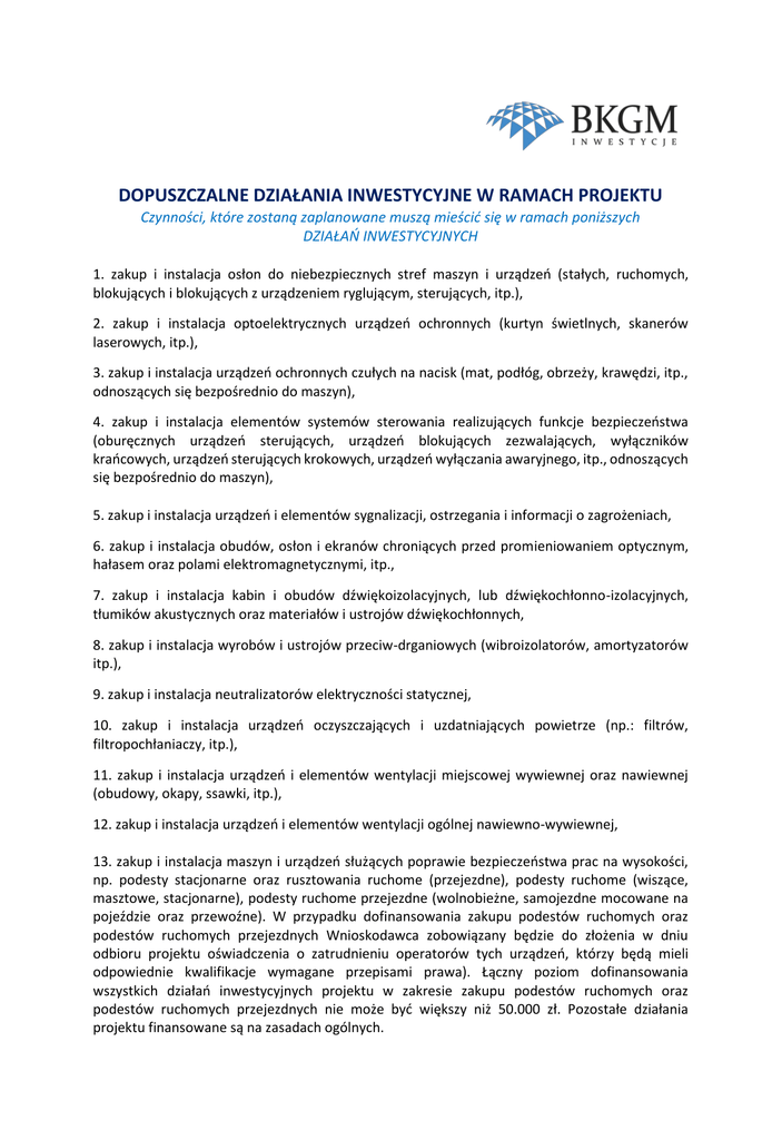 DOPUSZCZALNE DZIAŁANIA INWESTYCYJNE W RAMACH PROJEKTU Czynności, które zostaną zaplanowane muszą mieścić się w ramach poniższych DZIAŁAŃ INWESTYCYJNYCH 1. zakup i instalacja osłon do niebezpiecznych stref maszyn i urządzeń (stałych, ruchomych, blokujących i blokujących z urządzeniem ryglującym, sterujących, itp.), 2. zakup i instalacja optoelektrycznych urządzeń ochronnych (kurtyn świetlnych, skanerów laserowych, itp.), 3. zakup i instalacja urządzeń ochronnych czułych na nacisk (mat, podłóg, obrzeży, krawędzi, itp., odnoszących się bezpośrednio do maszyn), 4. zakup i instalacja elementów systemów sterowania realizujących funkcje bezpieczeństwa (oburęcznych urządzeń sterujących, urządzeń blokujących zezwalających, wyłączników krańcowych, urządzeń sterujących krokowych, urządzeń wyłączania awaryjnego, itp., odnoszących się bezpośrednio do maszyn), 5. zakup i instalacja urządzeń i elementów sygnalizacji, ostrzegania i informacji o zagrożeniach, 6. zakup i instalacja obudów, osłon i ekranów chroniących przed promieniowaniem optycznym, hałasem oraz polami elektromagnetycznymi, itp., 7. zakup i instalacja kabin i obudów dźwiękoizolacyjnych, lub dźwiękochłonno-izolacyjnych, tłumików akustycznych oraz materiałów i ustrojów dźwiękochłonnych, 8. zakup i instalacja wyrobów i ustrojów przeciw-drganiowych (wibroizolatorów, amortyzatorów itp.), 9. zakup i instalacja neutralizatorów elektryczności statycznej, 10. zakup i instalacja urządzeń oczyszczających i uzdatniających powietrze (np.: filtrów, filtropochłaniaczy, itp.), 11. zakup i instalacja urządzeń i elementów wentylacji miejscowej wywiewnej oraz nawiewnej (obudowy, okapy, ssawki, itp.), 12. zakup i instalacja urządzeń i elementów wentylacji ogólnej nawiewno-wywiewnej, 13. zakup i instalacja maszyn i urządzeń służących poprawie bezpieczeństwa prac na wysokości, np. podesty stacjonarne oraz rusztowania ruchome (przejezdne), podesty ruchome (wiszące, masztowe, stacjonarne), podesty ruchome przejezdne (wolnobieżne, samojezdne mocowane na pojeździe oraz przewoźne). W przypadku dofinansowania zakupu podestów ruchomych oraz podestów ruchomych przejezdnych Wnioskodawca zobowiązany będzie do złożenia w dniu odbioru projektu oświadczenia o zatrudnieniu operatorów tych urządzeń, którzy będą mieli odpowiednie kwalifikacje wymagane przepisami prawa). Łączny poziom dofinansowania wszystkich działań inwestycyjnych projektu w zakresie zakupu podestów ruchomych oraz podestów ruchomych przejezdnych nie może być większy niż 50.000 zł. Pozostałe działania projektu finansowane są na zasadach ogólnych. 14. zakup i instalacja urządzeń (bez własnego napędu / nie samojezdnych) służących ograniczeniu obciążenia układu mięśniowo-szkieletowego przy pracach ręcznych związanych z przemieszczaniem przedmiotów, ładunków lub materiałów np. ręczne wózki paletowe, wózki magazynowe, ręczne wózki platformowe dwunożycowe, wciągniki i żurawiki do 450 kg, 15. zakup i instalacja wózków jezdniowych podnośnikowych i innych urządzeń samojezdnych służących ograniczeniu obciążenia układu mięśniowo-szkieletowego, w przypadkach, gdy zastosowanie urządzeń przemieszczanych ręcznie, wymienionych w punkcie 14, nie zapewnia skutecznego ograniczenia tych obciążeń. Łączny poziom dofinansowania wszystkich działań inwestycyjnych projektu w zakresie zakupu wózków jezdniowych podnośnikowych i innych urządzeń samojezdnych nie może być większy niż 50.000 zł, 16. zakup i instalacja urządzeń służących poprawie bezpieczeństwa pracy w przypadku narażenia na szkodliwe czynniki biologiczne, 17. zakup środków ochrony indywidualnej (wyłącznie dla firm zatrudniających do 49 pracowników pod warunkiem przedstawienia dokumentacji potwierdzającej prawidłowe przeprowadzenie oceny ryzyka zawodowego oraz dokumentacji właściwego doboru środków ochrony indywidualnej), 18. modernizacja linii technologicznej mająca na celu poprawę bezpieczeństwa pracy z wyłączeniem zakupu maszyn produkcyjnych i ich części. W przypadku, gdy działania inwestycyjne nie dotyczą gotowego, dopuszczonego do użytkowania urządzenia, niezbędne jest dostarczenie w załączeniu do Wniosku koncepcji i projektu technicznego instalacji, systemu, urządzeń, itp. Działania inwestycyjne nie mogą dotyczyć zakupu maszyn produkcyjnych i ich części, szkoleń, działań z zakresu ppoż. Kosztem niekwalifikowalnym jest m.in.: uruchomienie, odbiór czy transport urządzenia (dostawa) na miejsce realizacji projektu. Realizacja projektu inwestycyjnego powinna przyczynić się do zredukowania niekorzystnego oddziaływania przynajmniej jednego z niżej wymienionych parametrów (z wyłączeniem projektów dotyczących zakupu środków ochrony indywidualnej): zapylenie, obciążenie układu mięśniowo - szkieletowego, hałas, wibracje, promieniowanie jonizujące i niejonizujące, mikroklimat, czynniki chemiczne, czynniki biologiczne. W przypadku zakupu urządzeń, systemów itp., należy podać typ i nazwę danego produktu oraz informacje dotyczące spełniania przez urządzenie wymagań dopuszczających je do użytkowania w Polsce (np. zgodność z dyrektywą maszynową, certyfikat CE potwierdzający wykonanie oceny zgodności). W przypadku wykazywania w budżecie zakupu „kompletu” urządzeń, systemów itp., należy wyszczególnić w załączniku składowe „kompletu”, podając parametry oraz ceny jednostkowe, pozwalające na weryfikację przez eksperta zasadności zakupu produktów. Niezbędna jest również kalkulacja cenowa uwzględniająca osobno cenę urządzenia, instalacji, maszyny itp., podaną w kwocie netto oraz brutto (kwoty koniecznie podane w złotówkach). Kalkulacja powinna zawierać składowe typu: jednostka miary (sztuka, liczba roboczogodzin) oraz osobna kalkulacja dotycząca montażu, która powinna zawiera