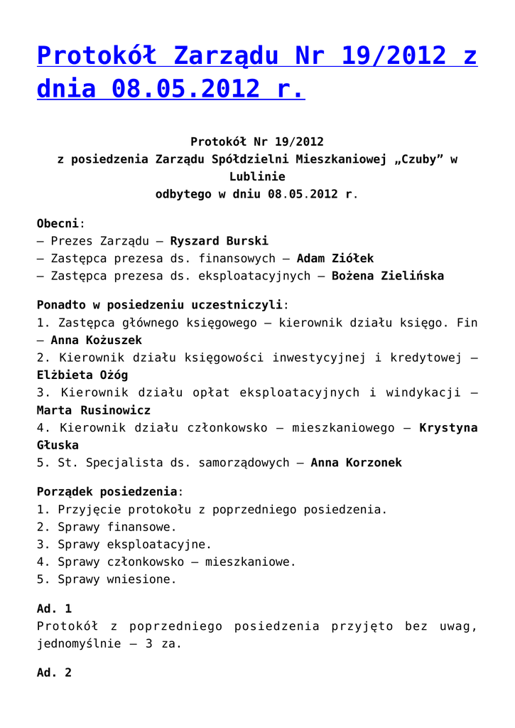Protokół Zarządu Nr 19/2012 z dnia 08.05.2012 r.
