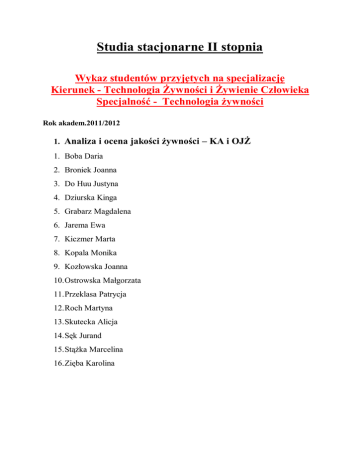 Studia stacjonarne II stopnia Wykaz studentów przyjętych na specjalizację Kierunek - Technologia Żywności i Żywienie Człowieka Specjalność - Technologia żywności Rok akadem.2011/2012 1. Analiza i ocena jakości żywności – KA i OJŻ 1. Boba Daria 2. Broniek Joanna 3. Do Huu Justyna 4. Dziurska Kinga 5. Grabarz Magdalena 6. Jarema Ewa 7. Kiczmer Marta 8. Kopala Monika 9. Kozłowska Joanna 10. Ostrowska Małgorzata 11. Przeklasa Patrycja 12. Roch Martyna 13. Skutecka Alicja 14. Sęk Jurand 15. Stążka Marcelina 16. Zięba Karolina Studia stacjonarne II stopnia Wykaz studentów przyjętych na specjalizację Kierunek - Technologia Żywności i Żywienie Człowieka Specjalność - Technologia żywności Rok akadem.2011/2012 2. Chłodnictwo i przechowalnictwo żywności –KCh i KS 1. Babiarz Donata 2. Bartoń Katarzyna 3. Grdeń Dawid 4. Kaleta Anna 5. Kozłowska Malwina 6. Krzemień Agnieszka 7. Krzystek Hubert 8. Łętocha Joanna 9. Majerczyk Mateusz 10. Mrowiec Dawid 11. Muszyński Adam 12. Pactwa Dorota 13. Piątek Irena 14. Prochownik Magdalena 15. Tytko Michał* 16. Urywasz Paulina* 17. Walczak Ewa *praca w katedrze Inżynierii Studia stacjonarne II stopnia Wykaz studentów przyjętych na specjalizację Kierunek - Technologia Żywności i Żywienie Człowieka Specjalność - Technologia żywności Rok akadem.2011/2012 5.Przetwórstwo mięsa –KPPZ 1. Biełoszejew Kinga 2. Brzozowska Joanna 3. Czubiak Dariusz 4. Kierat Anna 5. Kowalczyk Marzena 6. Krawczyk Małgorzata 7. Machura Karol 8. Mrożek Paweł 9. Pawlik Marta 10. Piekuś Małgorzata 11. Pitek Katarzyna 12. Pytel Agnieszka 13. Rodzeń paulina 14. Rok Wojciech 15. Sołtysik Tomasz 16. Śniegom Anna 17. Trojanowicz Wioleta 18. Wiktorek Ewelina 19. Ziaja Sebastian Studia stacjonarne II stopnia Wykaz studentów przyjętych na specjalizację Kierunek - Technologia Żywności i Żywienie Człowieka Specjalność - Technologia żywności Rok akadem.2011/2012 6.Przetwórstwo mleka – KPPZ 1. Bulka Maria 2. Cichoń Rafał 3. Homa Krzysztof 4. Kandora Anna 5. Kidoń Agata 6. Kiszewski Jakub* 7. Korzeniowska Joanna 8. Koziołek Magdalena 9. Kurzyk Karina 10. Lepa Łucja 11. Mańkut Dominika 12. Marcinkowska Edyta 13. Mike Agnieszka 14. Socha Monika 15. Wajdzik Gabriela 16. Winiarska Iwona 17. Zając Aneta *praca w katedrze Inżynierii Studia stacjonarne II stopnia Wykaz studentów przyjętych na specjalizację Kierunek - Technologia Żywności i Żywienie Człowieka Specjalność - Technologia żywności Rok akadem.2011/2012 7.Przetwórstwo owoców i warzyw –KSiPOW 1. Baraniecki Marcin 2. Bednarska Agnieszka 3. Buksa Justyna 4. Gałązkiewicz Katarzyna 5. Garus Natalia 6. Górska Katarzyna 7. Kobylański Łukasz 8. Koziara Izabela 9. Kurlej Agata 10. Łakoma Patrycja 11. Matejska Barbara 12. Nowicka Ewa 13. Proszek Paulina 14. Sułkowska Agnieszka 15. Świca Katarzyna 16. Tarasek Magdalena 17. Zalewska Edyta Studia stacjonarne II stopnia Wykaz studentów przyjętych na specjalizację Kierunek - Technologia Żywności i Żywienie Człowieka Specjalność - Technologia żywności Rok akadem.2011/2012 8.Technologia węglowodanów – KTW 1. Błasiak Iwona 2. Bugajska Agnieszka 3. Burza Weronika 4. Gibas Anna 5. Gonciarz Justyna 6. Góral Adriana 7. Halężlak Agnieszka 8. Janiga Izabela 9. Kidoń Gabriela 10. Kluz Katarzyna 11. Piec Justyna 12. Skóra Aneta 13. Słabiak Magda 14. Starsiak Karolina 15. Szczurak Maciej 16. Świderska Joanna 17. Wajda Beata 18. Wołowiec Magda Studia stacjonarne II stopnia Wykaz studentów przyjętych na specjalizację Kierunek - Technologia Żywności i Żywienie Człowieka Specjalność - Technologia żywności Rok akadem.2011/2012 9.Technologia fermentacji i napojów - KF i MT 1. Bijak Monika 2. Dragan Daniel 3. Kotulska Agnieszka 4. Mostek Magdalena 5. Mroczek Monika 6. Niezgoda Katarzyna 7. Nogala Renata 8. Nowak Karolina 9. Pająk Paweł 10. Pierścińska Magdalena 11. Prokopek Ewelina 12. Romankiewicz Sabina 13. Rybczyk Ewa 14. Ruchała Marzena* 15. Semik Dorota 16. Tobiasz Aleksandra 17. Turczyk Paulina 18. Stępień Anna 19. Zagórska Paulina 20. Zambrzycka Kamila *praca w katedrze Inżynierii Studia stacjonarne II stopnia Wykaz studentów przyjętych na specjalizację Kierunek - Technologia Żywności i Żywienie Człowieka Specjalność - Technologia żywności Rok akadem.2011/2012 10.Przetwórstwo zbóż– KTW 1. Abram Monika 2. Bierlet Mariola 3. Borczyk Katarzyna 4. Cygan Katarzyna* 5. Chwała Izabela 6. Gałczyńska Joanna 7. Kensy Katarzyna 8. Kęder Edyta 9. Kreft Joanna 10. Natanek Anna* 11. Rdest Kinga 12. Sikora Dominika 13. Smoter Artur 14. Sroka Patrycja 15. Szajewska Paulina 16. Zielińska Karolina *praca w katedrze Inżynierii Studia stacjonarne II stopnia Wykaz studentów przyjętych na specjalizację Kierunek - Technologia Żywności i Żywienie Człowieka Specjalność - Technologia żywności Rok akadem.2011/2012 11. Żywność prozdrowotna –KS i POW 1. Byczyńska Joanna 2. Dydak Martyna 3. Dźwigal Justyna 4. Gumieniak Sylwia 5. Janczyk Paulina 6. Jarecka Jolanta 7. Kopacz Małgorzata 8. Kornaś Karolina 9. Ligas Natalia 10. Miśtal Patrycja 11. Mroczka Katarzyna 12. Musielak Natalia 13. Natkaniec Małgorzata 14. Pasternak Edyta 15. Pater Roksana 16. Pietraszko Marta 17. Skalska Małgorzata 18. Wilk Katarzyna