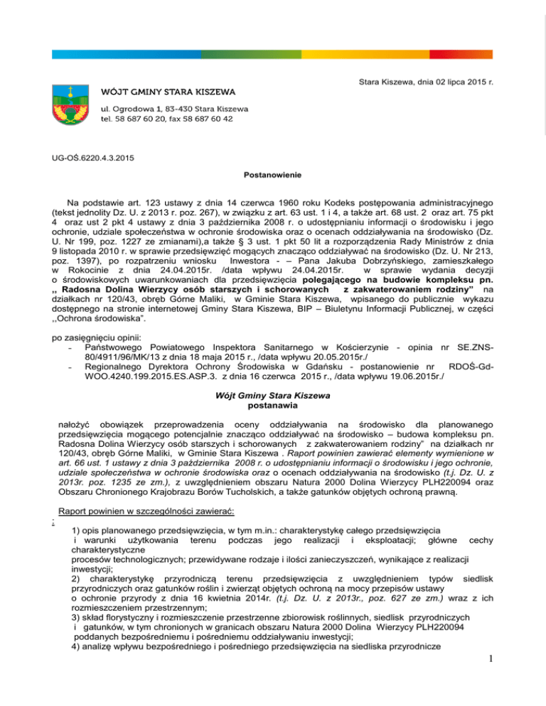 Stara Kiszewa, dnia 02 lipca 2015 r. UG-OŚ.6220.4.3.2015 Postanowienie Na podstawie art. 123 ustawy z dnia 14 czerwca 1960 roku Kodeks postępowania administracyjnego (tekst jednolity Dz. U. z 2013 r. poz. 267), w związku z art. 63 ust. 1 i 4, a także art. 68 ust. 2 oraz art. 75 pkt 4 oraz ust 2 pkt 4 ustawy z dnia 3 października 2008 r. o udostępnianiu informacji o środowisku i jego ochronie, udziale społeczeństwa w ochronie środowiska oraz o ocenach oddziaływania na środowisko (Dz. U. Nr 199, poz. 1227 ze zmianami),a także § 3 ust. 1 pkt 50 lit a rozporządzenia Rady Ministrów z dnia 9 listopada 2010 r. w sprawie przedsięwzięć mogących znacząco oddziaływać na środowisko (Dz. U. Nr 213, poz. 1397), po rozpatrzeniu wniosku Inwestora - – Pana Jakuba Dobrzyńskiego, zamieszkałego w Rokocinie z dnia 24.04.2015r. /data wpływu 24.04.2015r. w sprawie wydania decyzji o środowiskowych uwarunkowaniach dla przedsięwzięcia polegającego na budowie kompleksu pn. ,, Radosna Dolina Wierzycy osób starszych i schorowanych z zakwaterowaniem rodziny” na działkach nr 120/43, obręb Górne Maliki, w Gminie Stara Kiszewa, wpisanego do publicznie wykazu dostępnego na stronie internetowej Gminy Stara Kiszewa, BIP – Biuletynu Informacji Publicznej, w części ,,Ochrona środowiska”. po zasięgnięciu opinii: ˗ Państwowego Powiatowego Inspektora Sanitarnego w Kościerzynie - opinia nr SE.ZNS80/4911/96/MK/13 z dnia 18 maja 2015 r., /data wpływu 20.05.2015r./ ˗ Regionalnego Dyrektora Ochrony Środowiska w Gdańsku - postanowienie nr RDOŚ-GdWOO.4240.199.2015.ES.ASP.3. z dnia 16 czerwca 2015 r., /data wpływu 19.06.2015r./ Wójt Gminy Stara Kiszewa postanawia nałożyć obowiązek przeprowadzenia oceny oddziaływania na środowisko dla planowanego przedsięwzięcia mogącego potencjalnie znacząco oddziaływać na środowisko – budowa kompleksu pn. Radosna Dolina Wierzycy osób starszych i schorowanych z zakwaterowaniem rodziny” na działkach nr 120/43, obręb Górne Maliki, w Gminie Stara Kiszewa . Raport powinien zawierać elementy wymienione w art. 66 ust. 1 ustawy z dnia 3 października 2008 r. o udostępnianiu informacji o środowisku i jego ochronie, udziale społeczeństwa w ochronie środowiska oraz o ocenach oddziaływania na środowisko (t.j. Dz. U. z 2013r. poz. 1235 ze zm.), z uwzględnieniem obszaru Natura 2000 Dolina Wierzycy PLH220094 oraz Obszaru Chronionego Krajobrazu Borów Tucholskich, a także gatunków objętych ochroną prawną. Raport powinien w szczególności zawierać: : 1) opis planowanego przedsięwzięcia, w tym m.in.: charakterystykę całego przedsięwzięcia i warunki użytkowania terenu podczas jego realizacji i eksploatacji; główne cechy charakterystyczne procesów technologicznych; przewidywane rodzaje i ilości zanieczyszczeń, wynikające z realizacji inwestycji; 2) charakterystykę przyrodniczą terenu przedsięwzięcia z uwzględnieniem typów siedlisk przyrodniczych oraz gatunków roślin i zwierząt objętych ochroną na mocy przepisów ustawy o ochronie przyrody z dnia 16 kwietnia 2014r. (t.j. Dz. U. z 2013r., poz. 627 ze zm.) wraz z ich rozmieszczeniem przestrzennym; 3) skład florystyczny i rozmieszczenie przestrzenne zbiorowisk roślinnych, siedlisk przyrodniczych i gatunków, w tym chronionych w granicach obszaru Natura 2000 Dolina Wierzycy PLH220094 poddanych bezpośredniemu i pośredniemu oddziaływaniu inwestycji; 4) analizę wpływu bezpośredniego i pośredniego przedsięwzięcia na siedliska przyrodnicze 1 i gatunki podlegające ochronie na terenie obszaru Natura 2000 Dolina Wierzycy PLH220094; 5) analizę bezpośredniego i pośredniego oddziaływania przedsięwzięcia na siedliska przyrodnicze, na gatunki roślin i zwierząt objęte ochroną prawną; 6) charakterystykę oddziaływania przedsięwzięcia na środowisko ( należy zwrócić szczególną uwagę na analizę możliwych pośrednich oddziaływań w postaci: intensyfikacji zagospodarowania terenu, rozwoju infrastruktury towarzyszącej, nasilonej antropopresji i penetracji terenu etc. ) 7) ocenę skumulowanego oddziaływania planowanego zamierzenia oraz znajdujących się w sąsiedztwie inwestycji o takiej samej bądź podobnej działalności, na siedliska przyrodnicze, gatunki roślin oraz zwierząt podlegających ochronie obszaru Natura 2000 Dolina Wierzycy PLH220094 oraz na siedliska przyrodnicze, na gatunki roślin i zwierząt objęte ochroną prawną; 8) wskazanie działań eliminujących i minimalizujących ewentualne niekorzystne oddziaływanie na przedmioty ochrony w granicach ww. obszaru Natura 2000 oraz na siedliska przyrodnicze, na gatunki roślin i zwierząt objęte ochroną prawną; 9) analizę oddziaływania przedsięwzięcia na środowisko gruntowo – wodne, w tym m.in. wpływ realizacji i eksploatacji planowanej biologicznej oczyszczalni ścieków na warunki gruntowowodne na przedmiotowym terenie wraz ze wskazaniem odbiornika ścieków oczyszczonych; 10) analizę wpływu przedsięwzięcia na możliwość nieosiągnięcia celów środowiskowych zawartych w planie gospodarowania wodami na obszarze dorzecza stosownie do treści art. 81 ust. 3 ww. ustawy z dnia 3 października 2008r. o udostępnianiu informacji o środowisku i jego ochronie, udziale społeczeństwa w ochronie środowiska oraz o ocenach oddziaływania na środowisko, w tym: a. określenie jednolitej części wód powierzchniowych (JCWP) i podziemnych (JCWPd) zlokalizowanych na obszarze przedmiotowej inwestycji, b. przedstawienia celów środowiskowych wynikających z planu gospodarowania wodami na obszarze dorzecza, ustalonych dla ww. JCWP i JCWPd, c. określenie wpływu przedsięwzięcia na możliwość nieosiągnięcia celów środowiskowych zawartych w planie gospodarowania wodami na obszarze dorzecza wraz z uzasadnieniem. 11) analizę oddziaływania planowanego przedsięwzięcia na klimat i jego zmiany (mitygacja, czyli łagodzenie przez przedsięwzięcie zmian klimatu) oraz wp