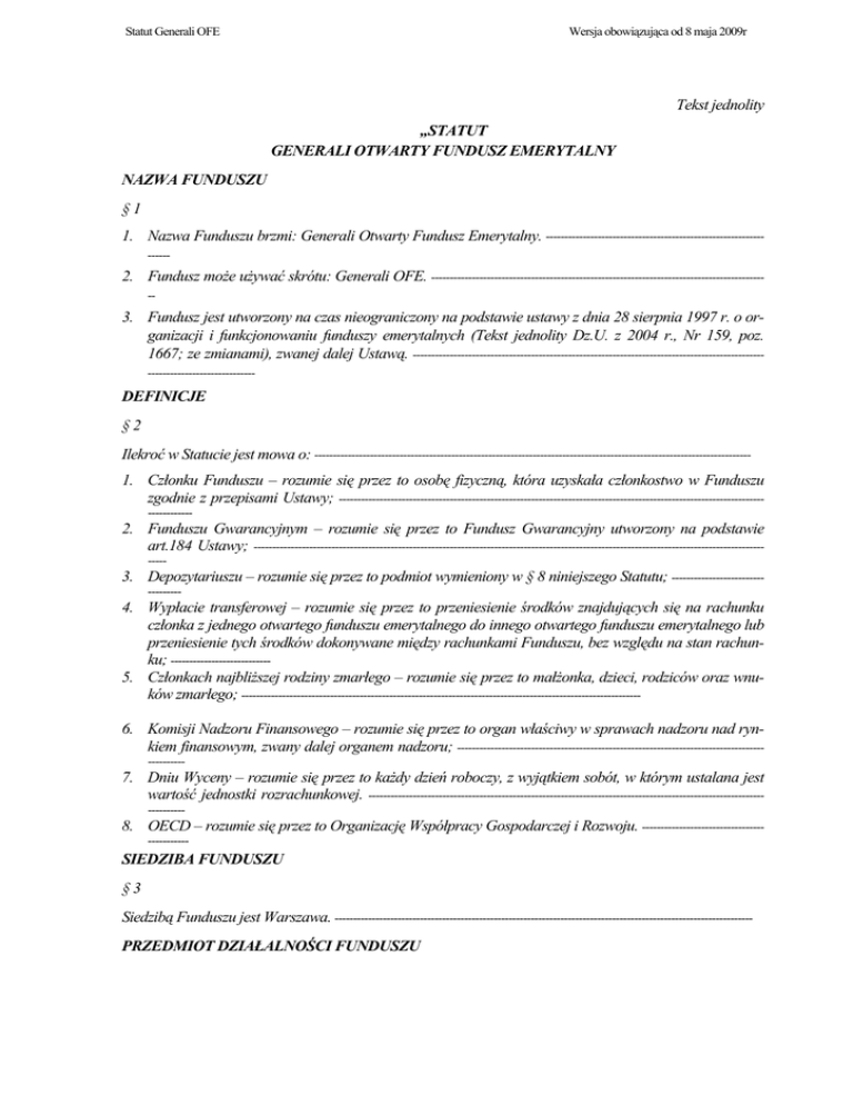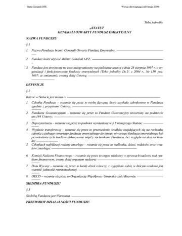 Statut Generali OFE Wersja obowiązująca od 8 maja 2009r Tekst jednolity „STATUT GENERALI OTWARTY FUNDUSZ EMERYTALNY NAZWA FUNDUSZU §1 1. Nazwa Funduszu brzmi: Generali Otwarty Fundusz Emerytalny. ---------------------------------------------------------------- 2. Fundusz może używać skrótu: Generali OFE. ------------------------------------------------------------------------------------------- 3. Fundusz jest utworzony na czas nieograniczony na podstawie ustawy z dnia 28 sierpnia 1997 r. o organizacji i funkcjonowaniu funduszy emerytalnych (Tekst jednolity Dz.U. z 2004 r., Nr 159, poz. 1667; ze zmianami), zwanej dalej Ustawą. --------------------------------------------------------------------------------------------------------------------------- DEFINICJE §2 Ilekroć w Statucie jest mowa o: ---------------------------------------------------------------------------------------------------------------------1. Członku Funduszu – rozumie się przez to osobę fizyczną, która uzyskała członkostwo w Funduszu zgodnie z przepisami Ustawy; ------------------------------------------------------------------------------------------------------------------------------ 2. Funduszu Gwarancyjnym – rozumie się przez to Fundusz Gwarancyjny utworzony na podstawie art.184 Ustawy; ---------------------------------------------------------------------------------------------------------------------------------------------- 3. Depozytariuszu – rozumie się przez to podmiot wymieniony w § 8 niniejszego Statutu; --------------------------------- 4. Wypłacie transferowej – rozumie się przez to przeniesienie środków znajdujących się na rachunku członka z jednego otwartego funduszu emerytalnego do innego otwartego funduszu emerytalnego lub przeniesienie tych środków dokonywane między rachunkami Funduszu, bez względu na stan rachunku; --------------------------5. Członkach najbliższej rodziny zmarłego – rozumie się przez to małżonka, dzieci, rodziców oraz wnuków zmarłego; -----------------------------------------------------------------------------------------------------------6. Komisji Nadzoru Finansowego – rozumie się przez to organ właściwy w sprawach nadzoru nad rynkiem finansowym, zwany dalej organem nadzoru; -------------------------------------------------------------------------------------------- 7. Dniu Wyceny – rozumie się przez to każdy dzień roboczy, z wyjątkiem sobót, w którym ustalana jest wartość jednostki rozrachunkowej. -------------------------------------------------------------------------------------------------------------------- 8. OECD – rozumie się przez to Organizację Współpracy Gospodarczej i Rozwoju. ------------------------------------------- SIEDZIBA FUNDUSZU §3 Siedzibą Funduszu jest Warszawa. ----------------------------------------------------------------------------------------------------------------PRZEDMIOT DZIAŁALNOŚCI FUNDUSZU . §4 Przedmiotem działalności Funduszu jest gromadzenie środków pieniężnych i ich lokowanie, z przeznaczeniem na wypłatę członkom Funduszu po osiągnięciu przez nich wieku emerytalnego i wypłata okresowych emerytur kapitałowych, o których mowa w ustawie z dnia 21 listopada 2008r. o emeryturach kapitałowych (Dz. U. Nr 228, poz. 1507) zwanej dalej „ustawą o emeryturach kapitałowych”. ------------------------------------------------------------------------------ ORGAN FUNDUSZU §5 1. Fundusz jest osobą prawną. ------------------------------------------------------------------------------------------------------------------2. Organem Funduszu jest powszechne towarzystwo emerytalne, działające pod firmą: Generali Powszechne Towarzystwo Emerytalne Spółka Akcyjna, zwane dalej Towarzystwem. ----------------------------------------------------- 3. Siedzibą Towarzystwa jest Warszawa. ---------------------------------------------------------------------------------------------------4. Adres Towarzystwa: Warszawa, ul. Postępu 15B. ------------------------------------------------------------------------------------- TOWARZYSTWO §6 1. Kapitał zakładowy Towarzystwa wynosi 145.500.000,- /sto czterdzieści pięć milionów pięćset tysięcy/ złotych i dzieli się na 14.550,- /czternaście tysięcy pięćset pięćdziesiąt/ akcji imiennych o wartości nominalnej 10.000,- /dziesięć tysięcy/ złotych każda, w tym: ----------------------------------------------------------------------------- A) 1.677 /jeden tysiąc sześćset siedemdziesiąt siedem/ akcji założycielskich serii A oznaczonych numerami od numeru 1 /jeden/ do numeru 1.677 /jeden tysiąc sześćset siedemdziesiąt siedem/, ------------------------------------------ B) 2.373 /dwa tysiące trzysta siedemdziesiąt trzy/ akcje serii B oznaczone numerami od numeru 1 /jeden/ do numeru 2.373 /dwa tysiące trzysta siedemdziesiąt trzy/, -------------------------------------------------------------------------- C) 10.000 /dziesięć tysięcy/ akcji serii C oznaczonych numerami od numeru 1 /jeden/ do numeru 10.000 /dziesięć tysięcy/, --------------------------------------------------------------------------------------------------------------------------------------------- D) 500 /pięćset/ akcji serii D oznaczonych numerami od numeru 1 /jeden/ do numeru 500 /pięćset/. --------------- 2. Akcjonariuszami Towarzystwa są: ---------------------------------------------------------------------------------------------------------1) Generali Towarzystwo Ubezpieczeń Spółka Akcyjna, z siedzibą w Warszawie, -------------------------------------- 2) Generali PPF Holding B.V. z siedzibą w Amsterdamie, Holandia. ---------------------------------------------------------- 3. Akcjonariusze Towarzystwa posiadają następującą liczbę akcji: ----------------------------------------------------------------- 1) Generali Towarzystwo Ubezpieczeń Spółka Akcyjna posiada wszystkie akcje serii A, B i C, -------------