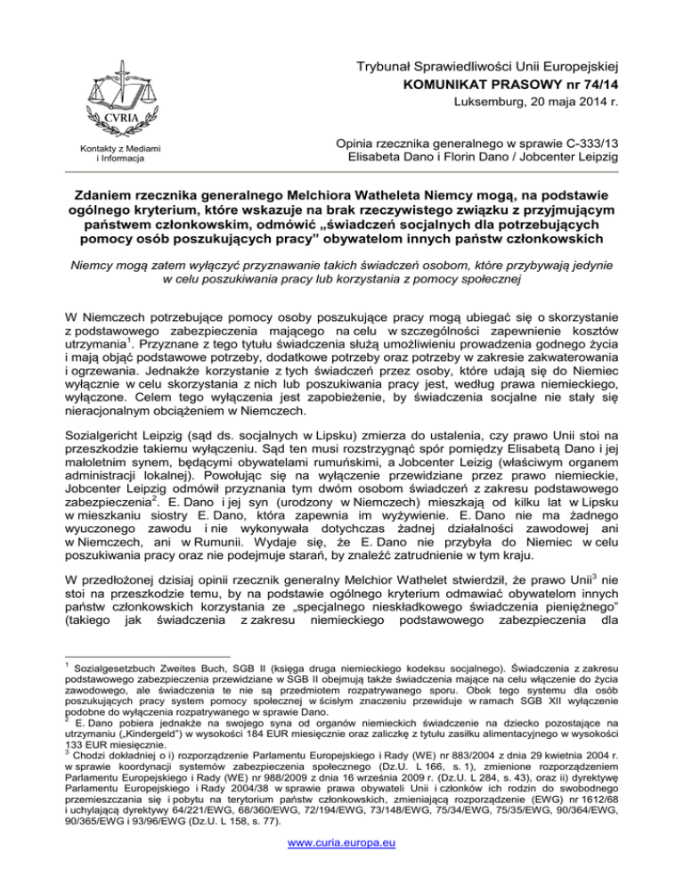 Trybunał Sprawiedliwości Unii Europejskiej KOMUNIKAT PRASOWY nr 74/14 Luksemburg, 20 maja 2014 r. Kontakty z Mediami i Informacja Opinia rzecznika generalnego w sprawie C-333/13 Elisabeta Dano i Florin Dano / Jobcenter Leipzig Zdaniem rzecznika generalnego Melchiora Watheleta Niemcy mogą, na podstawie ogólnego kryterium, które wskazuje na brak rzeczywistego związku z przyjmującym państwem członkowskim, odmówić „świadczeń socjalnych dla potrzebujących pomocy osób poszukujących pracy” obywatelom innych państw członkowskich Niemcy mogą zatem wyłączyć przyznawanie takich świadczeń osobom, które przybywają jedynie w celu poszukiwania pracy lub korzystania z pomocy społecznej W Niemczech potrzebujące pomocy osoby poszukujące pracy mogą ubiegać się o skorzystanie z podstawowego zabezpieczenia mającego na celu w szczególności zapewnienie kosztów utrzymania1. Przyznane z tego tytułu świadczenia służą umożliwieniu prowadzenia godnego życia i mają objąć podstawowe potrzeby, dodatkowe potrzeby oraz potrzeby w zakresie zakwaterowania i ogrzewania. Jednakże korzystanie z tych świadczeń przez osoby, które udają się do Niemiec wyłącznie w celu skorzystania z nich lub poszukiwania pracy jest, według prawa niemieckiego, wyłączone. Celem tego wyłączenia jest zapobieżenie, by świadczenia socjalne nie stały się nieracjonalnym obciążeniem w Niemczech. Sozialgericht Leipzig (sąd ds. socjalnych w Lipsku) zmierza do ustalenia, czy prawo Unii stoi na przeszkodzie takiemu wyłączeniu. Sąd ten musi rozstrzygnąć spór pomiędzy Elisabetą Dano i jej małoletnim synem, będącymi obywatelami rumuńskimi, a Jobcenter Leizig (właściwym organem administracji lokalnej). Powołując się na wyłączenie przewidziane przez prawo niemieckie, Jobcenter Leipzig odmówił przyznania tym dwóm osobom świadczeń z zakresu podstawowego zabezpieczenia2. E. Dano i jej syn (urodzony w Niemczech) mieszkają od kilku lat w Lipsku w mieszkaniu siostry E. Dano, która zapewnia im wyżywienie. E. Dano nie ma żadnego wyuczonego zawodu i nie wykonywała dotychczas żadnej działalności zawodowej ani w Niemczech, ani w Rumunii. Wydaje się, że E. Dano nie przybyła do Niemiec w celu poszukiwania pracy oraz nie podejmuje starań, by znaleźć zatrudnienie w tym kraju. W przedłożonej dzisiaj opinii rzecznik generalny Melchior Wathelet stwierdził, że prawo Unii3 nie stoi na przeszkodzie temu, by na podstawie ogólnego kryterium odmawiać obywatelom innych państw członkowskich korzystania ze „specjalnego nieskładkowego świadczenia pieniężnego” (takiego jak świadczenia z zakresu niemieckiego podstawowego zabezpieczenia dla 1 Sozialgesetzbuch Zweites Buch, SGB II (księga druga niemieckiego kodeksu socjalnego). Świadczenia z zakresu podstawowego zabezpieczenia przewidziane w SGB II obejmują także świadczenia mające na celu włączenie do życia zawodowego, ale świadczenia te nie są przedmiotem rozpatrywanego sporu. Obok tego systemu dla osób poszukujących pracy system pomocy społecznej w ścisłym znaczeniu przewiduje w ramach SGB XII wyłączenie podobne do wyłączenia rozpatrywanego w sprawie Dano. 2 E. Dano pobiera jednakże na swojego syna od organów niemieckich świadczenie na dziecko pozostające na utrzymaniu („Kindergeld”) w wysokości 184 EUR miesięcznie oraz zaliczkę z tytułu zasiłku alimentacyjnego w wysokości 133 EUR miesięcznie. 3 Chodzi dokładniej o i) rozporządzenie Parlamentu Europejskiego i Rady (WE) nr 883/2004 z dnia 29 kwietnia 2004 r. w sprawie koordynacji systemów zabezpieczenia społecznego (Dz.U. L 166, s. 1), zmienione rozporządzeniem Parlamentu Europejskiego i Rady (WE) nr 988/2009 z dnia 16 września 2009 r. (Dz.U. L 284, s. 43), oraz ii) dyrektywę Parlamentu Europejskiego i Rady 2004/38 w sprawie prawa obywateli Unii i członków ich rodzin do swobodnego przemieszczania się i pobytu na terytorium państw członkowskich, zmieniającą rozporządzenie (EWG) nr 1612/68 i uchylającą dyrektywy 64/221/EWG, 68/360/EWG, 72/194/EWG, 73/148/EWG, 75/34/EWG, 75/35/EWG, 90/364/EWG, 90/365/EWG i 93/96/EWG (Dz.U. L 158, s. 77). www.curia.europa.eu potrzebujących pomocy osób poszukujących pracy4), pod warunkiem że przyjęte kryterium (jak na przykład powód wjazdu wnioskodawcy na terytorium państwa członkowskiego) może wskazywać na brak rzeczywistego związku z przyjmującym państwem członkowskim i ma tym samym na celu zapobieżenie nieracjonalnemu obciążeniu dla krajowego systemu pomocy społecznej. Rzecznik generalny przypomniał, że prawo Unii5 upoważnia obywateli Unii i członków ich rodzin do przebywania w państwie członkowskim innym niż państwo, którego są obywatelami, przez okres trzech miesięcy dopóty, dopóki nie staną się nieracjonalnym obciążeniem dla systemu pomocy społecznej w przyjmującym państwie członkowskim. Gdy osoby takie pragną pozostać przez okres przekraczający trzy miesiące, muszą posiadać wystarczające zasoby, aby nie stanowić obciążenia dla systemu pomocy społecznej przyjmującego państwa członkowskiego. Wynika z tego nieuchronnie, że może dochodzić do nierównego traktowania przy przyznawaniu świadczeń z zakresu pomocy społecznej innych obywateli Unii względem obywateli przyjmującego państwa członkowskiego. Ustawodawstwo odmawiające możliwości korzystania ze świadczeń z zakresu podstawowego zabezpieczenia osobom, które w ogóle nie zamierzając się zintegrować na rynku pracy, przybywają do Niemiec wyłącznie w celu skorzystania z niemieckiego systemu pomocy społecznej, jest zgodne, zdaniem rzecznika generalnego M. Watheleta, z wolą prawodawcy Unii. Takie wyłączenie pozwala zapobiec, aby osoby, które korzystają ze swobody przemieszczania bez woli integracji, nie stanowiły obciążenia dla systemu pomocy społecznej. Jest ono ponadto zgodne z przyznaną państwom członkowskim w tym zakresie swobodą uznania. Innymi s