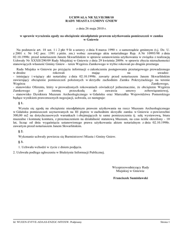 UCHWAŁA NR XLVII/388/10 RADY MIASTA I GMINY GNIEW z dnia 26 maja 2010 r. w sprawie wyrażenia zgody na obciążenie nieodpłatnie prawem użytkowania pomieszczeń w zamku w Gniewie Na podstawie art. 18 ust. 1 i 2 pkt 9 lit a ustawy z dnia 8 marca 1990 r. o samorządzie gminnym (t.j. Dz. U. z 2001 r. Nr 142 poz. 1591 z późn. zm.) wobec zawartego aktu notarialnego Rep. A Nr 10993/98 z dnia 02.10.1998r. przed notariuszem Janem Skwarlińskim w sprawie ustanowienia użytkowania w związku z realizacją Uchwały Nr XXXII/290/09 Rady Miejskiej w Gniewie z dnia 29 kwietnia 2009r. w sprawie zbycia nieruchomości stanowiących własność Gminy Gniew – teren Wzgórza Zamkowego w trybie rokowań po drugim przetargu Rada Miejska w Gniewie po przyjęciu informacji o zakończeniu postępowania przetargowego prowadzonego w drodze rokowań mając na uwadze: - istniejący i wiążący akt notarialny z dnia 02.10.1998r. zawarty przed notariuszem Janem Skwarlińskim zawierający obciążenie pomieszczeń położonych w skrzydle zachodnim Zamku Pokrzyżackiego na terenie Wzgórza Zamkowego, - stanowisko Oferenta, który w prowadzonych rokowaniach oświadczył jednoznacznie, że obciążenie Wzgórza Zamkowego jest istotną przeszkodą do zawarcia umowy zobowiązaniowej, - stanowisko Dyrektora Muzeum Archeologicznego w Gdańsku oraz Marszałka Województwa Pomorskiego będące wynikiem prawomocnych negocjacji, uchwala, co następuje: § 1. Wyraża się zgodę na obciążenie nieodpłatnym prawem użytkowania na rzecz Muzeum Archeologicznego w Gdańsku pomieszczeń usytuowanych na III piętrze w zachodnim skrzydle zamku w Gniewie o powierzchni 300,00 m2 na dotychczasowych warunkach i obejmujących te same pomieszczenia tj. salę wystawową, biura muzealne i komnatę komtura, z przeznaczeniem na działalność statutową Muzeum, na czas ściśle określony - 10 lat, licząc od dnia wygaśnięcia ustanowionego prawa użytkowania aktem notarialnym z dnia 02.10.1998r. zawartym przed notariuszem Janem Skwarlińskim. § 2. Wykonanie uchwały powierza się Burmistrzowi Miasta i Gminy Gniew. § 3. 1. Uchwała wchodzi w życie z dniem podjęcia. 2. Uchwała podlega ogłoszeniu w Biuletynie Informacji Publicznej. Wiceprzewodniczący Rady Miejskiej w Gniewie Franciszek Sumisławski Id: WUEEN-EVFVE-ADAAS-ENZGC-MTOXW. Podpisany Strona 1 Uzasadnienie W dniu 02.10.1998r aktem notarialnym Rep. A Nr 10993/98 przed notariuszem Janem Skwarlińskim Spółka „Zamek w Gniewie” ustanowiła nieodpłatne prawo użytkowania pomieszczeń położonych w skrzydle zachodnim Zamku Pokrzyżackiego na terenie Wzgórza Zamkowego na rzecz Muzeum Archeologicznego w Gdańsku na czas nieokreślony. Użytkowanie wygasa w przypadku zrzeczenia się użytkowania przez Muzeum Archeologiczne w Gdańsku złożone na piśmie z podpisem notarialnie poświadczonym. Wykonując Uchwałę Nr XXXII/290/09 Rady Miejskiej w Gniewie z dnia 29 kwietnia 2009r. w sprawie zbycia nieruchomości stanowiących własność Gminy Gniew – teren Wzgórza Zamkowego w trybie rokowań po drugim przetargu, została wszczęta procedura mająca na celu wyłonienie nabywcy dla przedmiotowych nieruchomości. Do rokowań przystąpił jeden oferent, który spełnił wszystkie wymogi formalne zawarte w ogłoszeniu. W trakcie prowadzonych rokowań oferent wyraził zastrzeżenia co do użytkowania pomieszczeń Zamku przez Muzeum Archeologiczne w Gdańsku, kwestionując jej bezterminowy charakter. Jednocześnie podkreślił, że jest gotowy kontynuować umowę użytkowania w przypadku sprecyzowania terminu jej obowiązywania. Albowiem obciążenie w tym stanie prawnym jest istotną przeszkodą do zawarcia umowy zobowiązaniowej. Dlatego też Burmistrz Miasta i Gminy Gniew podjął rozmowy z Dyrektorem Muzeum Archeologicznego w Gdańsku oraz Marszałkiem Województwa Pomorskiego. Wielokrotne rozmowy, zmiany treści oświadczenia o zrzeczeniu się prawa użytkowania ustanowionego w w/w akcie notarialnym w konsekwencji zaowocowały porozumieniem w sprawie zmiany oświadczenia o zrzeczeniu się prawa użytkowania ustanawiającego prawo użytkowania na rzecz Muzeum Archeologicznego w Gdańsku pomieszczeń usytuowanych na III piętrze w zachodnim skrzydle zamku w Gniewie o powierzchni nie mniejszej niż 300 m2 na dotychczasowych warunkach i obejmujących te same pomieszczenia tj. salę wystawową, biura muzealne i komnatę komtura z przeznaczeniem na działalność statutową Muzeum, na czas 10 lat, licząc od dnia wygaśnięcia ustanowionego prawa użytkowania aktem notarialnym z dnia 02.10.1998r. przed notariuszem Janem Skwarlińskim. Mając na uwadze powyższe zasadnym jest podjęcie niniejszej uchwały. Id: WUEEN-EVFVE-ADAAS-ENZGC-MTOXW. Podpisany Strona 1