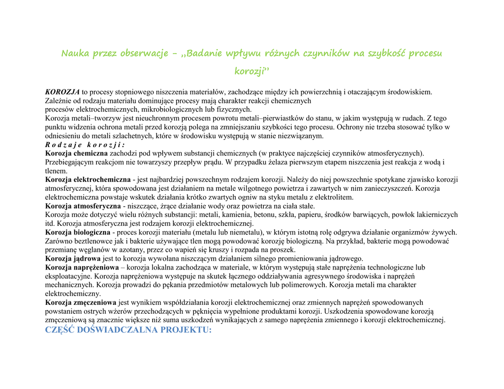 Nauka przez obserwacje - „Badanie wpływu różnych czynników na szybkość procesu korozji” KOROZJA to procesy stopniowego niszczenia materiałów, zachodzące między ich powierzchnią i otaczającym środowiskiem. Zależnie od rodzaju materiału dominujące procesy mają charakter reakcji chemicznych procesów elektrochemicznych, mikrobiologicznych lub fizycznych. Korozja metali–tworzyw jest nieuchronnym procesem powrotu metali–pierwiastków do stanu, w jakim występują w rudach. Z tego punktu widzenia ochrona metali przed korozją polega na zmniejszaniu szybkości tego procesu. Ochrony nie trzeba stosować tylko w odniesieniu do metali szlachetnych, które w środowisku występują w stanie niezwiązanym. Rodzaje korozji: Korozja chemiczna zachodzi pod wpływem substancji chemicznych (w praktyce najczęściej czynników atmosferycznych). Przebiegającym reakcjom nie towarzyszy przepływ prądu. W przypadku żelaza pierwszym etapem niszczenia jest reakcja z wodą i tlenem. Korozja elektrochemiczna - jest najbardziej powszechnym rodzajem korozji. Należy do niej powszechnie spotykane zjawisko korozji atmosferycznej, która spowodowana jest działaniem na metale wilgotnego powietrza i zawartych w nim zanieczyszczeń. Korozja elektrochemiczna powstaje wskutek działania krótko zwartych ogniw na styku metalu z elektrolitem. Korozja atmosferyczna - niszczące, żrące działanie wody oraz powietrza na ciała stałe. Korozja może dotyczyć wielu różnych substancji: metali, kamienia, betonu, szkła, papieru, środków barwiących, powłok lakierniczych itd. Korozja atmosferyczna jest rodzajem korozji elektrochemicznej. Korozja biologiczna - proces korozji materiału (metalu lub niemetalu), w którym istotną rolę odgrywa działanie organizmów żywych. Zarówno beztlenowce jak i bakterie używające tlen mogą powodować korozję biologiczną. Na przykład, bakterie mogą powodować przemianę węglanów w azotany, przez co wapień się kruszy i rozpada na proszek. Korozja jądrowa jest to korozja wywołana niszczącym działaniem silnego promieniowania jądrowego. Korozja naprężeniowa – korozja lokalna zachodząca w materiale, w którym występują stałe naprężenia technologiczne lub eksploatacyjne. Korozja naprężeniowa występuje na skutek łącznego oddziaływania agresywnego środowiska i naprężeń mechanicznych. Korozja prowadzi do pękania przedmiotów metalowych lub polimerowych. Korozja metali ma charakter elektrochemiczny. Korozja zmęczeniowa jest wynikiem współdziałania korozji elektrochemicznej oraz zmiennych naprężeń spowodowanych powstaniem ostrych wżerów przechodzących w pęknięcia wypełnione produktami korozji. Uszkodzenia spowodowane korozją zmęczeniową są znacznie większe niż suma uszkodzeń wynikających z samego naprężenia zmiennego i korozji elektrochemicznej. CZĘŚĆ DOŚWIADCZALNA PROJEKTU: Cel: Badanie wpływu różnych czynników na szybkość procesu korozji. Opis doświadczenia: Na 5 szalkach Petriego umieściliśmy po kawałku drutu żelaznego. Pierwszą przechowywaliśmy w pomieszczeniu, drugą na zewnątrz, natomiast do pozostałych wlaliśmy kolejno roztwory o odczynie kwaśnym (wodny roztwór kwasu solnego o niewielkim stężeniu), zasadowym (wodny roztwór zasady sodowej o niewielkim stężeniu), oraz wodny roztwór soli kuchennej. Szalki pozostawiliśmy na kilka dni, obserwując zmiany jakie w nich zachodziły. Dzień pierwszy: KWAS SÓL ZASADA W POMIESZCZENIU NA ZEWNĄTRZ Stopniowo obserwowaliśmy niszczenie powierzchni drutów żelaznych i postępującą korozję, która zachodziła w szalkach z różną szybkością i intensywnością. Dzień drugi: KWAS W pomieszczeniu Na zewnątrz Dzień piąty: Na zewnątrz W pomieszczeniu Dzień dwunasty: W pomieszczeniu Na zewnątrz Pierwsze oznaki korozji zaobserwowaliśmy w szalce z roztworem soli, natomiast najbardziej intensywnie zachodziła w roztworze kwasu solnego. Najwolniej postępowało niszczenie żelaza w szalce bez roztworu przechowywanej w pomieszczeniu. WNIOSEK: Żelazo ulega korozji pod wpływem kwasów, soli, zasad, a także czynników atmosferycznych. Proces ten można spowolnić lub ograniczyć jego zakres ograniczając dostęp wyżej wymienionych czynników do powierzchni metalu. SPOSOBY ZAPOBIEGANIA KOROZJI: Ochrona katodowa – jedna z elektrochemicznych metod ochrony metali przed korozją elektrochemiczną, która polega na tym, że do chronionej konstrukcji dołącza się zewnętrzną anodę. Powierzchnia chronionego metalu staje się katodą – elektrodą, na której zachodzą reakcje redukcji depolaryzatora, a nie zachodzi utlenianie metalu, czyli jego korozja. Ochrona katodowa galwaniczna (protektorowa)     W przypadku galwanicznej ochrony katodowej, są używane wymienne kształtki, wykonane z materiału o niskim potencjale, montowane bezpośrednio na chronionej konstrukcji. W otoczeniu styku na powierzchni chronionej zachodzą reakcje katodowe, np. redukcja tlenu. Chroniony metal nie koroduje dzięki korozji protektora. Anody galwaniczne muszą się charakteryzować wystarczająco niskim potencjałem i brakiem tendencji do polaryzacji . Stosuje się np. anody magnezowe, cynkowe, aluminiowe. Do czystych metali są wprowadzane dodatki stopowe, zmniejszające skłonność do pasywacji i szybkość korozji własnej oraz zwiększające równomierność roztwarzania. Powłoki metaliczne i warstwy metalu na powierzchni wyrobu, służące do jego ochrony przed korozją lub do celów ozdobnych. Nakłada się je różnymi metodami technologicznymi: elektrolitycznie - pokrywanie złotem, srebrem, miedzią, niklem, chromem, cyną, cynkiem. ogniowo - powlekanie metalu w kąpielach stopionego metalu ochronnego (cynk, cyna, ołów, glin). chemicznie - poprzez bezprądowe kąpiele lub natrysk soli wraz z reduktorem. platerowanie - nakładanie powłok z platery z użyciem nacisku (srebro, miedź, glin). Powłoki niemetaliczne - wywoływane są na powierzchni 