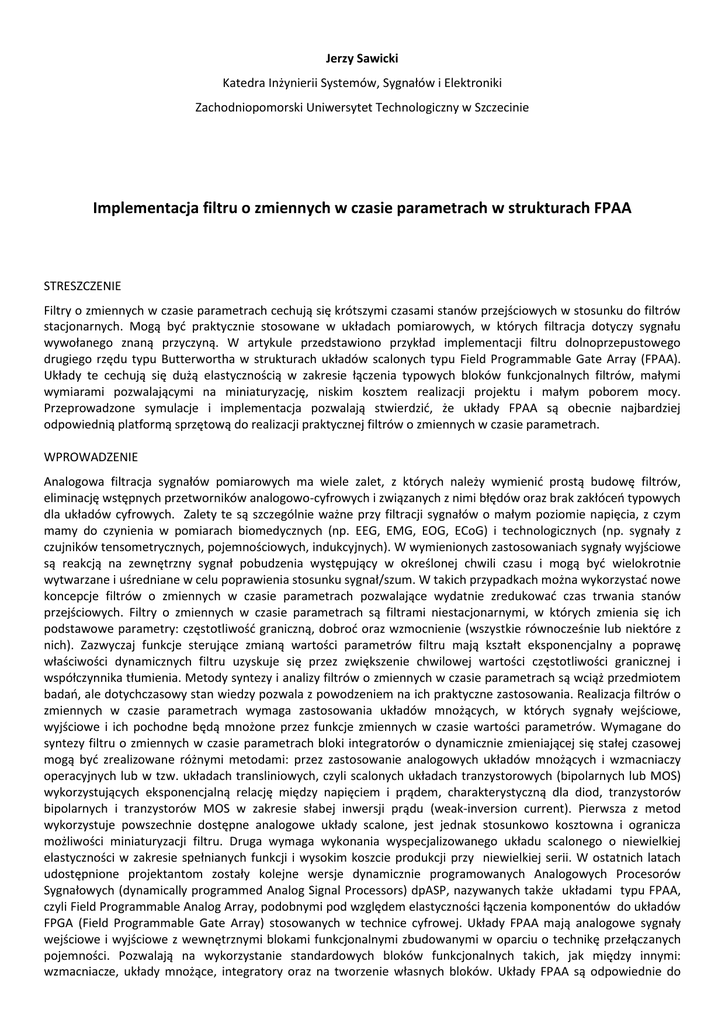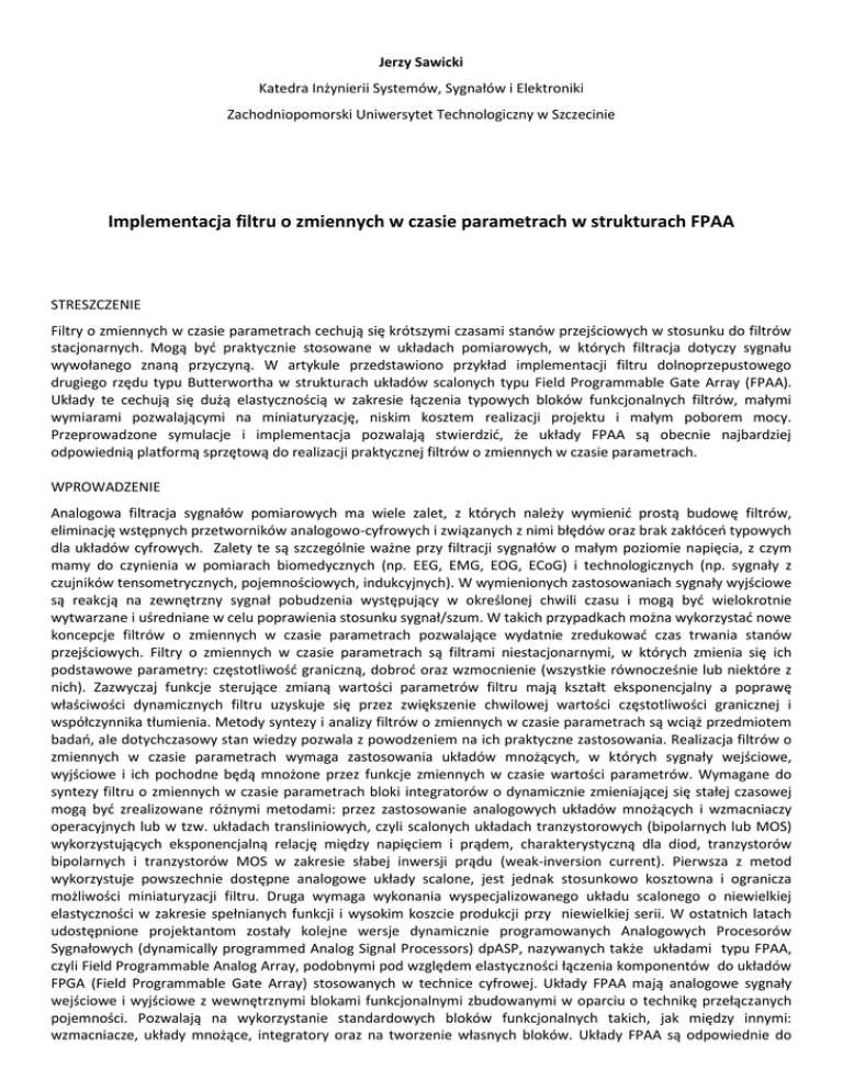 Jerzy Sawicki Katedra Inżynierii Systemów, Sygnałów i Elektroniki Zachodniopomorski Uniwersytet Technologiczny w Szczecinie Implementacja filtru o zmiennych w czasie parametrach w strukturach FPAA STRESZCZENIE Filtry o zmiennych w czasie parametrach cechują się krótszymi czasami stanów przejściowych w stosunku do filtrów stacjonarnych. Mogą być praktycznie stosowane w układach pomiarowych, w których filtracja dotyczy sygnału wywołanego znaną przyczyną. W artykule przedstawiono przykład implementacji filtru dolnoprzepustowego drugiego rzędu typu Butterwortha w strukturach układów scalonych typu Field Programmable Gate Array (FPAA). Układy te cechują się dużą elastycznością w zakresie łączenia typowych bloków funkcjonalnych filtrów, małymi wymiarami pozwalającymi na miniaturyzację, niskim kosztem realizacji projektu i małym poborem mocy. Przeprowadzone symulacje i implementacja pozwalają stwierdzić, że układy FPAA są obecnie najbardziej odpowiednią platformą sprzętową do realizacji praktycznej filtrów o zmiennych w czasie parametrach. WPROWADZENIE Analogowa filtracja sygnałów pomiarowych ma wiele zalet, z których należy wymienić prostą budowę filtrów, eliminację wstępnych przetworników analogowo-cyfrowych i związanych z nimi błędów oraz brak zakłóceń typowych dla układów cyfrowych. Zalety te są szczególnie ważne przy filtracji sygnałów o małym poziomie napięcia, z czym mamy do czynienia w pomiarach biomedycznych (np. EEG, EMG, EOG, ECoG) i technologicznych (np. sygnały z czujników tensometrycznych, pojemnościowych, indukcyjnych). W wymienionych zastosowaniach sygnały wyjściowe są reakcją na zewnętrzny sygnał pobudzenia występujący w określonej chwili czasu i mogą być wielokrotnie wytwarzane i uśredniane w celu poprawienia stosunku sygnał/szum. W takich przypadkach można wykorzystać nowe koncepcje filtrów o zmiennych w czasie parametrach pozwalające wydatnie zredukować czas trwania stanów przejściowych. Filtry o zmiennych w czasie parametrach są filtrami niestacjonarnymi, w których zmienia się ich podstawowe parametry: częstotliwość graniczną, dobroć oraz wzmocnienie (wszystkie równocześnie lub niektóre z nich). Zazwyczaj funkcje sterujące zmianą wartości parametrów filtru mają kształt eksponencjalny a poprawę właściwości dynamicznych filtru uzyskuje się przez zwiększenie chwilowej wartości częstotliwości granicznej i współczynnika tłumienia. Metody syntezy i analizy filtrów o zmiennych w czasie parametrach są wciąż przedmiotem badań, ale dotychczasowy stan wiedzy pozwala z powodzeniem na ich praktyczne zastosowania. Realizacja filtrów o zmiennych w czasie parametrach wymaga zastosowania układów mnożących, w których sygnały wejściowe, wyjściowe i ich pochodne będą mnożone przez funkcje zmiennych w czasie wartości parametrów. Wymagane do syntezy filtru o zmiennych w czasie parametrach bloki integratorów o dynamicznie zmieniającej się stałej czasowej mogą być zrealizowane różnymi metodami: przez zastosowanie analogowych układów mnożących i wzmacniaczy operacyjnych lub w tzw. układach transliniowych, czyli scalonych układach tranzystorowych (bipolarnych lub MOS) wykorzystujących eksponencjalną relację między napięciem i prądem, charakterystyczną dla diod, tranzystorów bipolarnych i tranzystorów MOS w zakresie słabej inwersji prądu (weak-inversion current). Pierwsza z metod wykorzystuje powszechnie dostępne analogowe układy scalone, jest jednak stosunkowo kosztowna i ogranicza możliwości miniaturyzacji filtru. Druga wymaga wykonania wyspecjalizowanego układu scalonego o niewielkiej elastyczności w zakresie spełnianych funkcji i wysokim koszcie produkcji przy niewielkiej serii. W ostatnich latach udostępnione projektantom zostały kolejne wersje dynamicznie programowanych Analogowych Procesorów Sygnałowych (dynamically programmed Analog Signal Processors) dpASP, nazywanych także układami typu FPAA, czyli Field Programmable Analog Array, podobnymi pod względem elastyczności łączenia komponentów do układów FPGA (Field Programmable Gate Array) stosowanych w technice cyfrowej. Układy FPAA mają analogowe sygnały wejściowe i wyjściowe z wewnętrznymi blokami funkcjonalnymi zbudowanymi w oparciu o technikę przełączanych pojemności. Pozwalają na wykorzystanie standardowych bloków funkcjonalnych takich, jak między innymi: wzmacniacze, układy mnożące, integratory oraz na tworzenie własnych bloków. Układy FPAA są odpowiednie do implementacji filtrów o zmiennych w czasie parametrach, dając elastyczną mikroelektroniczną platformę sprzętową o małych wymiarach i małym zapotrzebowaniu na energię. Mogą być stosowane bezpośrednio przy sensorze tworząc wydajny układ filtracji i kondycjonowania sygnału pomiarowego. FILTR O ZMIENNYCH W CZASIE PARAMETRACH Do badań symulacyjnych i implementacji w strukturach FPAA wybrano filtr dolnoprzepustowy drugiego rzędu typu Butterwortha o zmiennych w czasie dwóch parametrach: częstotliwości granicznej i współczynniku tłumienia. Filtr jest opisany równaniem różniczkowym: y 2 y 0 y 0 x i transmitancją: K (s) 2 0 s2 s 2 0 2 0 Analizy filtrów o zmiennych parametrach wskazują, że zwiększenie wartości parametrów ω0 powoduje skrócenie czasu trwania stanów przejściowych, a zwiększenie wartości współczynnika ξ zmniejsza wielkość przeregulowania w odpowiedzi skokowej. Przyjęto zatem, że zmianom w czasie będą podlegać wartości częstotliwości granicznej ω0 oraz współczynnika tłumienia ξ. Sygnałem wejściowym do badań odpowiedzi filtru będzie skok jednostkowy. Przyjęto następujące zakresy zmian i końcowe wartości parametrów: 0 d (0) 3 oraz 1.5 oraz 1 0 (0) d 1 2 Przyjęto, że zmiany wartości parametrów ω0 i ξ w funkcji czasu będą się odbywać zgodnie z odpowiedzią skokową generatora funkcji, którym może być u