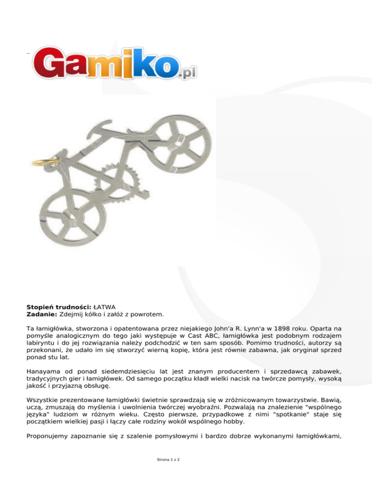 Stopień trudności: ŁATWA Zadanie: Zdejmij kółko i załóż z powrotem. Ta łamigłówka, stworzona i opatentowana przez niejakiego John'a R. Lynn'a w 1898 roku. Oparta na pomyśle analogicznym do tego jaki występuje w Cast ABC, łamigłówka jest podobnym rodzajem labiryntu i do jej rozwiązania należy podchodzić w ten sam sposób. Pomimo trudności, autorzy są przekonani, że udało im się stworzyć wierną kopię, która jest równie zabawna, jak oryginał sprzed ponad stu lat. Hanayama od ponad siedemdziesięciu lat jest znanym producentem i sprzedawcą zabawek, tradycyjnych gier i łamigłówek. Od samego początku kładł wielki nacisk na twórcze pomysły, wysoką jakość i przyjazną obsługę. Wszystkie prezentowane łamigłówki świetnie sprawdzają się w zróżnicowanym towarzystwie. Bawią, uczą, zmuszają do myślenia i uwolnienia twórczej wyobraźni. Pozwalają na znalezienie "wspólnego języka" ludziom w różnym wieku. Często pierwsze, przypadkowe z nimi "spotkanie" staje się początkiem wielkiej pasji i łączy całe rodziny wokół wspólnego hobby. Proponujemy zapoznanie się z szalenie pomysłowymi i bardzo dobrze wykonanymi łamigłówkami, Strona 1 z 2 których rozwiązanie zapewni godziny fantastycznej zabawy. Uwaga! Wszystkie łamigłówki można rozwiązać BEZ UŻYCIA SIŁY. Zawartość pudełka: 1 szt. łamigłówki Wiek 8+ Liczba graczy 1 Czas gry 30 - 60 minut Instrukcja polska Wydanie angielskie Producent Hanayama Strona 2 z 2