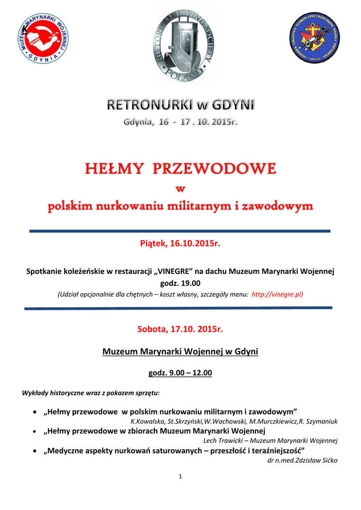 K HEŁMY PRZEWODOWE w polskim nurkowaniu militarnym i zawodowym Piątek, 16.10.2015r. Spotkanie koleżeńskie w restauracji „VINEGRE” na dachu Muzeum Marynarki Wojennej godz. 19.00 (Udział opcjonalnie dla chętnych – koszt własny, szczegóły menu: http://vinegre.pl) Sobota, 17.10. 2015r. Muzeum Marynarki Wojennej w Gdyni godz. 9.00 – 12.00 Wykłady historyczne wraz z pokazem sprzętu: „Hełmy przewodowe w polskim nurkowaniu militarnym i zawodowym” K.Kowalska, St.Skrzyński,W.Wachowski, M.Murczkiewicz,R. Szymaniuk „Hełmy przewodowe w zbiorach Muzeum Marynarki Wojennej Lech Trawicki – Muzeum Marynarki Wojennej „Medyczne aspekty nurkowań saturowanych – przeszłość i teraźniejszość” dr n.med.Zdzisław Sićko 1 Ośrodek Szkolenia Nurków i Płetwonurków WP na Oksywiu godz. 13.00 – 15.00 Zwiedzanie Ośrodka Szkolenia Nurków i Płetwonurków Pokaz amerykańskiego hełmu Kirby-Morgan 37 w działaniu pod wodą Muzeum Marynarki Wojennej w Gdyni godz. 16.00 – 17.30 1. Pokazy hełmów nurkowych w działaniu Zanurzenie nurków w kontenerze z wodą — podwodna relacja TV, dokumentacja foto Prezentowane hełmy Polski hełm dzwonowy prof. Wojtusiaka i amerykański hełm SNEAD 3 Niemiecki hełm 3-bolcowy Dreager lub/i angielski hełm Siebe - Gorman godz.17.30 2. Zwiedzanie Muzeum Marynarki Wojennej z pracownikiem MMW Uwaga: HDS Poland zapewnia transport autokarowy uczestników spotkania na trasie: Muzeum Marynarki Wojennej – Port Wojenny na Oksywiu - Muzeum Marynarki Wojennej 2