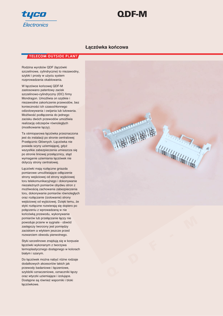 QDF-M ¸àczówka koƒcowa Rodzina wyrobów QDF (∏àczówki szczelinowe, cylindryczne) to niezawodny, szybki i prosty w u˝yciu system rozprowadzania okablowania. W ∏àczówce koƒcowej QDF-M zastosowano patentowy zacisk szczelinowo-cylindryczny (IDC) firmy Mondragon. Umo˝liwia on szybkie i niezawodne zakoƒczenie przewodów, bez koniecznoÊci ich czasoch∏onnego odizolowywania i owijania lub lutowania. Mo˝liwoÊç pod∏àczenia do jednego zacisku dwóch przewodów umo˝liwia realizacj´ odczepów równoleg∏ych (mostkowanie ∏àczy). Ta oÊmioparowa ∏àczówka przeznaczona jest do instalacji po stronie centralowej Prze∏àcznic G∏ównych. ¸àczówka nie posiada szyny uziemiajàcej, gdy˝ wszystkie zabezpieczenia umieszcza si´ po stronie liniowej prze∏àcznicy, stàd wymaganie uziemiania ∏àczówek nie dotyczy strony centralowej. ¸àczówki majà roz∏àczne gniazda pomiarowe umo˝liwiajàce od∏àczenie strony wejÊciowej od strony wyjÊciowej toru telekomunikacyjnego i dokonywanie niezale˝nych pomiarów obydwu stron z mo˝liwoÊcià zachowania zabezpieczenia toru, dokonywanie pomiarów równoleg∏ych oraz roz∏àczanie (izolowanie) strony wejÊciowej od wyjÊciowej. Dzi´ki temu, ˝e styki roz∏àczne rozwierajà si´ dopiero po po∏àczeniu z wprowadzanà w nie koƒcówkà przewodu, wykonywanie pomiarów lub prze∏àczanie ∏àczy nie powoduje przerw w sygnale - obwód zast´pczy tworzony jest pomi´dzy zaciskiem a wtykiem jeszcze przed rozwarciem obwodu pierwotnego. - Styki szczelinowe znajdujà si´ w korpusie ∏àczówki wykonanym z tworzywa termoplastycznego dost´pnego w kolorach bia∏ym i szarym. Do ∏àczówek mo˝na nabyç ró˝ne rodzaje dodatkowych akcesoriów takich jak przewody badaniowe i ∏àczeniowe, szyldziki oznaczeniowe, oznaczniki ∏àczy oraz wtyczki uziemiajàce i izolujàce. Dost´pne sà równie˝ wsporniki i bloki ∏àczówkowe. F D Q M QDF-M Zamawianie Opis Pakowanie ¸àczówka (bia∏a) ¸àczówka (szara) Szyldzik (bia∏y) Szyldzik (szary) Prowadnik przewodów (prawy) 10 szt./opak. 10 szt./opak. 100 szt./opak. 100 szt./opak. 25 szt./opak. Numeracja 0-7 0-7 Symbol Wyrobu QDF-M0 QDF-M0-G QDF-MD QDF-MD-G QDF-MRWGW Numer PCN 379809-000 121505-000 351803-000 057319-000 583541-000 Wymiary 105 mm XXXXXX 54.01 mm Widok boczny ∏àczówki 17.2 mm 90.05 mm Szyldzik Specyfikacje Korpus ∏àczówki Parametry elektryczne Tworzywo termoplastyczne poliw´glanowe/poliestrowe o klasie palnoÊci V0 wed∏ug UL94 (samogasnàce), wsp. tlenowy 29,5 Rezystancja izolacji: >1000 GΩ przy 500 V pr. st. OdpornoÊç napi´ciowa: 2000 V pr. zm. przez 5 minut Wytrzyma∏oÊç na obcià˝enie pràdem: ∏àcznie 20 A, 10 A po ka˝dej stronie do ziemi bez odkszta∏ceƒ ∏àczówki Przes∏uchy (Êrednie): -100 dB przy 20 kHz -70 dB przy 2,048 Mb/s Rezystancja styku: maksymalnie 7 mΩ (w∏àcznie z rezystancjà dwóch styków cylindrycznych, rezystancjà styku roz∏àcznego pomi´dzy stykami cylindrycznymi, rezystancjà styku przewodów) Maksymalna zmiana rezystancji styku po badaniach klimatycznych ∆R: 2,5 mΩ na styk Zaciski szczelinowo-cylindryczne Utwardzany fosforobràz z pow∏okà antykorozyjnà. Ârednice ˝y∏ przewodów Drut: 0,4 do 0,9 mm Linka: 0,4 do 0,64 mm Uwaga: W wypadku pod∏àczania do jednego zacisku dwóch przewodów muszà one mieç takà samà Êrednic´. Ârednice ˝y∏ izolowanych Wraz z izolacjà od 0,81 do 1,50 mm Trwa∏oÊç Co najmniej 200 w∏àczeƒ i 200 wy∏àczeƒ. Tyco, Raychem i QDF sà znakami handlowymi Tyco International. Pokazane tu w celach ilustracyjnych informacje, rysunki i schematy sà wed∏ug nas wiarygodne. Jednak˝e firma Tyco Electronics nie gwarantuje ich dok∏adnoÊci i kompletnoÊci oraz nie bierze na siebie odpowiedzialnoÊci zwiàzanej z ich u˝yciem. Zobowiàzania firmy Tyco Electronics mogà byç jedynie takie, jakie zosta∏y wyspecyfikowane w ”Standard Terms and Conditions of Sale” firmy Tyco Electronics dla niniejszego wyrobu i w ˝adnym przypadku firma Tyco Electronics nie b´dzie odpowiedzialna za jakiekolwiek przypadkowe, bezpoÊrednie lub wynikowe uszkodzenia powsta∏e w nast´pstwie sprzeda˝y, odsprzeda˝y, u˝ycia lub nieprawid∏owego u˝ycia tego wyrobu. U˝ytkownicy wyrobów firmy Tyco Electronics powinni sami dokonaç oszacowania w celu okreÊlenia przydatnoÊci ka˝dego takiego wyrobu do konkretnego zastosowania. Tyco Electronics Raychem NV Raychem Polska Sp. z o.o. Telecom Outside Plant Diestsesteenweg 692 3010 Kessel-Lo, Belgium Tel.: 32-16-351 011 Fax: 32-16-351 697 www.tycoelectronics.com Ul. Post´pu 2 02-676 Warszawa Tel.: 48-22- 549 07 20 Fax: 48-22- 549 07 21 [email protected] TC 625/M/DS/PO/1 03/00