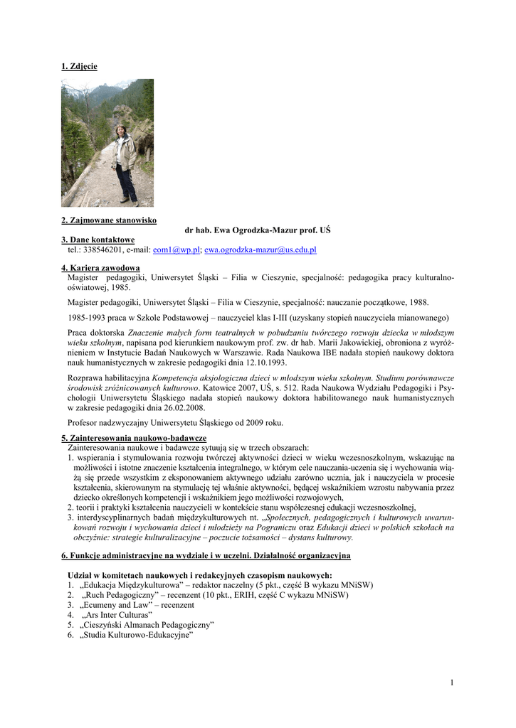 1 1. Zdjęcie 2. Zajmowane stanowisko dr hab. Ewa Ogrodzka