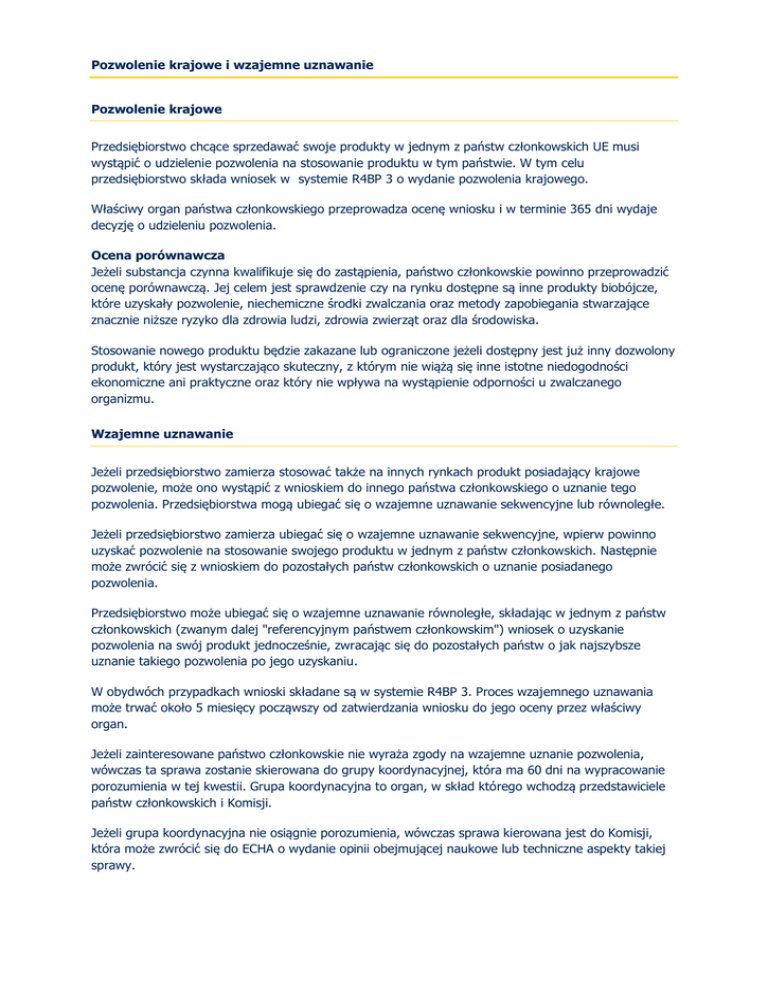 Pozwolenie krajowe i wzajemne uznawanie Pozwolenie krajowe Przedsiębiorstwo chcące sprzedawać swoje produkty w jednym z państw członkowskich UE musi wystąpić o udzielenie pozwolenia na stosowanie produktu w tym państwie. W tym celu przedsiębiorstwo składa wniosek w systemie R4BP 3 o wydanie pozwolenia krajowego. Właściwy organ państwa członkowskiego przeprowadza ocenę wniosku i w terminie 365 dni wydaje decyzję o udzieleniu pozwolenia. Ocena porównawcza Jeżeli substancja czynna kwalifikuje się do zastąpienia, państwo członkowskie powinno przeprowadzić ocenę porównawczą. Jej celem jest sprawdzenie czy na rynku dostępne są inne produkty biobójcze, które uzyskały pozwolenie, niechemiczne środki zwalczania oraz metody zapobiegania stwarzające znacznie niższe ryzyko dla zdrowia ludzi, zdrowia zwierząt oraz dla środowiska. Stosowanie nowego produktu będzie zakazane lub ograniczone jeżeli dostępny jest już inny dozwolony produkt, który jest wystarczająco skuteczny, z którym nie wiążą się inne istotne niedogodności ekonomiczne ani praktyczne oraz który nie wpływa na wystąpienie odporności u zwalczanego organizmu. Wzajemne uznawanie Jeżeli przedsiębiorstwo zamierza stosować także na innych rynkach produkt posiadający krajowe pozwolenie, może ono wystąpić z wnioskiem do innego państwa członkowskiego o uznanie tego pozwolenia. Przedsiębiorstwa mogą ubiegać się o wzajemne uznawanie sekwencyjne lub równoległe. Jeżeli przedsiębiorstwo zamierza ubiegać się o wzajemne uznawanie sekwencyjne, wpierw powinno uzyskać pozwolenie na stosowanie swojego produktu w jednym z państw członkowskich. Następnie może zwrócić się z wnioskiem do pozostałych państw członkowskich o uznanie posiadanego pozwolenia. Przedsiębiorstwo może ubiegać się o wzajemne uznawanie równoległe, składając w jednym z państw członkowskich (zwanym dalej "referencyjnym państwem członkowskim") wniosek o uzyskanie pozwolenia na swój produkt jednocześnie, zwracając się do pozostałych państw o jak najszybsze uznanie takiego pozwolenia po jego uzyskaniu. W obydwóch przypadkach wnioski składane są w systemie R4BP 3. Proces wzajemnego uznawania może trwać około 5 miesięcy począwszy od zatwierdzania wniosku do jego oceny przez właściwy organ. Jeżeli zainteresowane państwo członkowskie nie wyraża zgody na wzajemne uznanie pozwolenia, wówczas ta sprawa zostanie skierowana do grupy koordynacyjnej, która ma 60 dni na wypracowanie porozumienia w tej kwestii. Grupa koordynacyjna to organ, w skład którego wchodzą przedstawiciele państw członkowskich i Komisji. Jeżeli grupa koordynacyjna nie osiągnie porozumienia, wówczas sprawa kierowana jest do Komisji, która może zwrócić się do ECHA o wydanie opinii obejmującej naukowe lub techniczne aspekty takiej sprawy.
