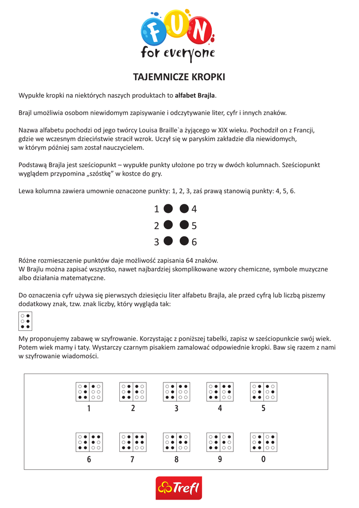 U F N TAJEMNICZE KROPKI Wypukłe kropki na niektórych naszych produktach to alfabet Brajla. Brajl umożliwia osobom niewidomym zapisywanie i odczytywanie liter, cyfr i innych znaków. Nazwa alfabetu pochodzi od jego twórcy Louisa Braille`a żyjącego w XIX wieku. Pochodził on z Francji, gdzie we wczesnym dzieciństwie stracił wzrok. Uczył się w paryskim zakładzie dla niewidomych, w którym później sam został nauczycielem. Podstawą Brajla jest sześciopunkt – wypukłe punkty ułożone po trzy w dwóch kolumnach. Sześciopunkt wyglądem przypomina „szóstkę” w kostce do gry. Lewa kolumna zawiera umownie oznaczone punkty: 1, 2, 3, zaś prawą stanowią punkty: 4, 5, 6. 1 4 2 3 5 6 Różne rozmieszczenie punktów daje możliwość zapisania 64 znaków. W Brajlu można zapisać wszystko, nawet najbardziej skomplikowane wzory chemiczne, symbole muzyczne albo działania matematyczne. Do oznaczenia cyfr używa się pierwszych dziesięciu liter alfabetu Brajla, ale przed cyfrą lub liczbą piszemy dodatkowy znak, tzw. znak liczby, który wygląda tak: My proponujemy zabawę w szyfrowanie. Korzystając z poniższej tabelki, zapisz w sześciopunkcie swój wiek. Potem wiek mamy i taty. Wystarczy czarnym pisakiem zamalować odpowiednie kropki. Baw się razem z nami w szyfrowanie wiadomości. 1 2 3 4 5 6 7 8 9 0