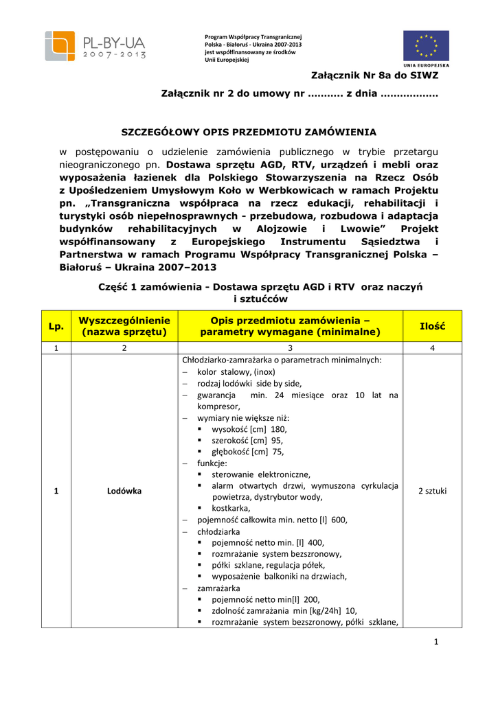 [Wpisz tekst] Program Współpracy Transgranicznej Polska - Białoruś - Ukraina 2007-2013 jest współfinansowany ze środków Unii Europejskiej Załącznik Nr 8a do SIWZ Załącznik nr 2 do umowy nr ……….. z dnia ……………… SZCZEGÓŁOWY OPIS PRZEDMIOTU ZAMÓWIENIA w postępowaniu o udzielenie zamówienia publicznego w trybie przetargu nieograniczonego pn. Dostawa sprzętu AGD, RTV, urządzeń i mebli oraz wyposażenia łazienek dla Polskiego Stowarzyszenia na Rzecz Osób z Upośledzeniem Umysłowym Koło w Werbkowicach w ramach Projektu pn. „Transgraniczna współpraca na rzecz edukacji, rehabilitacji i turystyki osób niepełnosprawnych - przebudowa, rozbudowa i adaptacja budynków rehabilitacyjnych w Alojzowie i Lwowie” Projekt współfinansowany z Europejskiego Instrumentu Sąsiedztwa i Partnerstwa w ramach Programu Współpracy Transgranicznej Polska – Białoruś – Ukraina 2007–2013 Część 1 zamówienia - Dostawa sprzętu AGD i RTV oraz naczyń i sztućców Lp. Wyszczególnienie (nazwa sprzętu) 1 1 Opis przedmiotu zamówienia – parametry wymagane (minimalne) Ilość 2 3 4 Lodówka Chłodziarko-zamrażarka o parametrach minimalnych: kolor stalowy, (inox) rodzaj lodówki side by side, gwarancja min. 24 miesiące oraz 10 lat na kompresor, wymiary nie większe niż: wysokość [cm] 180, szerokość [cm] 95, głębokość [cm] 75, funkcje: sterowanie elektroniczne, alarm otwartych drzwi, wymuszona cyrkulacja powietrza, dystrybutor wody, kostkarka, pojemność całkowita min. netto [l] 600, chłodziarka pojemność netto min. [l] 400, rozmrażanie system bezszronowy, półki szklane, regulacja półek, wyposażenie balkoniki na drzwiach, zamrażarka pojemność netto min[l] 200, zdolność zamrażania min [kg/24h] 10, rozmrażanie system bezszronowy, półki szklane, 2 sztuki 1 [Wpisz tekst] 2 Kuchnia gazowo/elektryczna 3 Kuchenka mikrofalowa Program Współpracy Transgranicznej Polska - Białoruś - Ukraina 2007-2013 jest współfinansowany ze środków Unii Europejskiej ilość szuflad / klapek 2, rodzaj szuflad / klapek front przezroczysty, wyposażenie balkoniki na drzwiach, energia zużycie energii max [kwh/24h] 1.050, zużycie energii [kwh/rok] 390, klasa energetyczna a++, techniczne poziom hałasu max [db] 45, oświetlenie wnętrza led, waga [kg] max 150. Kuchnia gazowo/elektryczna o parametrach minimalnych: Kolor płyty Inox, Rodzaj piekarnika Elektryczny, Gwarancja min. 24 miesiące, Front Lustrzany, Pokrywa Szklana, Wysokość min [cm] 80, Szerokość min [cm] 55, Głębokość min [cm] 55, Funkcje minimum: Programowanie Programator elektroniczny, Termoregulator [st. C] Od min 50 do 250, Zapalarka gazu w pokrętle, Zastosowane technologie Programator sensorowy Ts, Płyta Ilość pól grzejnych 4, Piekarnik: Grill TAK, Wymuszony obieg powietrza, Rożen obrotowy, Klasa energetyczna A++, Zabezpieczenie przeciwwypływowe , Pojemność piekarnika [l] min 60, Czyszczenie piekarnika Emalia łatwoczyszcząca, Prowadnice Drabinkowe, Konstrukcja Szuflada na prowadnicach rolkowych. Kuchenka mikrofalowa o parametrach minimalnych: kolor srebrny, załączone wyposażenie ociekacz na wodę, ociekacz oleju, gwarancja min. 24 miesiące, programator sterowanie elektroniczne, wyświetlacz elektroniczny, zegar czasu rzeczywistego, minutnik , 3 sztuki 2 sztuki 2 [Wpisz tekst] Program Współpracy Transgranicznej Polska - Białoruś - Ukraina 2007-2013 jest współfinansowany ze środków Unii Europejskiej 4 Pralka 5 Zmywarka funkcje minimum: grill halogenowy, pokrętło jog, automatyczne ważenie, zabezpieczenie przed dziećmi, funkcja samooczyszczania, minutnik, sygnał końca pracy, gotowanie na parze, rozmrażanie, automatyczne programy gotowania, opcje gotowania kombinowanego, min.: 3 stopnie gotowania wieloetapowego, gotowanie ekspresowe, możliwość podgrzewania na 2 poziomach, moc mikrofali min [w] 900, moc grilla min [w] 800, przestrzenna emisja fal, pojemność min. [l] 23, wykonanie wnętrza stal nierdzewna, ceramiczne dno komory. Pralka automatyczna o minimalnych parametrach: Gwarancja min. 24 miesiące, min. 10 lat gwarancji na silnik, Wymiary max.: Wysokość [cm] 85, Szerokość [cm] 60, Głębokość [cm] 60, Wirowanie: Prędkość min. [obr/min] 1400, Funkcje Wyświetlacz elektroniczny, Sterowanie Elektroniczne, Automatyka wagowa, Opóźniony start, Zużycie: Energii max [kWh/rok] 160 Wody [litr/rok] 10600, Klasa energetyczna min. A+++, Klasa wirowania min. B, Programy techniczne: Wsad [kg] min. 8, Poziom hałasu podczas prania [dB] max 55, Poziom hałasu podczas wirowania [dB] max 75. Zmywarka o minimalnych parametrach gwarancja min. 24 miesiące, komunikacja wyświetlacz elektroniczny, sygnał dźwiękowy informujący o zakończeniu zmywania, wskaźniki detergentów braku soli, braku nabłyszczacza, funkcje sterowanie elektroniczne, programy - ilość min. 6, temperatury - ilość 5, zakres min. [st. c] 35/45/50/65/75, kosz górny kosz regulowana wysokość, składane 1 sztuka 1 sztuka 3 [Wpisz tekst] Program Współpracy Transgranicznej Polska - Białoruś - Ukraina 2007-2013 jest współfinansowany ze środków Unii Europejskiej 6 Telewizor 7 Wieża (sprzęt audio) elementy, dolny kosz składane elementy, parametry klasa energetyczna min a+++, klasa efektywności zmywania min. a, klasa efektywności suszenia min. a, techniczne pojemność [kpl.] min 13, zabezpieczenie przeciwwypływowe , zabezpieczenia przed dziećmi. Telewizor o przekątnej ekranu min. 50 cali i parametrach minimalnych: Typ telewizora LED, Obraz 3D, Technologia 3D: Aktywna, Zgodność z wymogami odbioru cyfrowej telewizji naziemnej, Załączone wyposażenie min. Pilot, Podstawa, Kabel zasilający, Baterie do pilota, 2 pary okularów 3D, Przedłużacz podczerwieni, Gwarancja min. 24 miesiące, Format HD: min. Full HD, Rozdzielczość min. 1920 x 1080, System fonii min. Stereo, Moc głośników min. 40W Ilość głośników min. 4 głośniki + Subwoofer, Tuner analogowy , Tuner cyfro