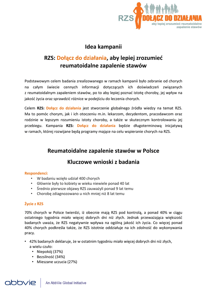 Idea kampanii RZS: Dołącz do działania, aby lepiej zrozumieć reumatoidalne zapalenie stawów Podstawowym celem badania zrealizowanego w ramach kampanii było zebranie od chorych na całym świecie cennych informacji dotyczących ich doświadczeń związanych z reumatoidalnym zapaleniem stawów, po to aby lepiej poznać istotę choroby, jej wpływ na jakość życia oraz sprawdzić różnice w podejściu do leczenia chorych. Celem RZS: Dołącz do działania jest stworzenie globalnego źródła wiedzy na temat RZS. Ma to pomóc chorym, jak i ich otoczeniu m.in. lekarzom, decydentom, pracodawcom oraz rodzinie w lepszym rozumieniu istoty choroby, a także w skutecznym kontrolowaniu jej przebiegu. Kampania RZS: Dołącz do działania będzie długoterminową inicjatywą w ramach, której rozwijane będą programy mające na celu wspieranie chorych na RZS. Reumatoidalne zapalenie stawów w Polsce Kluczowe wnioski z badania Respondenci: • W badaniu wzięło udział 400 chorych • Głównie były to kobiety w wieku niewiele ponad 40 lat • Średnio pierwsze objawy RZS zauważyli ponad 9 lat temu • Chorobę zdiagnozowano u nich mniej niż 8 lat temu Życie z RZS 70% chorych w Polsce twierdzi, iż obecnie mają RZS pod kontrolą, a ponad 40% w ciągu ostatniego tygodnia miało więcej dobrych dni niż złych. Jednak przeważająca większość badanych uważa, że RZS negatywnie wpływa na ogólną jakość ich życia. Co więcej ponad 40% chorych podkreśla także, że RZS istotnie oddziałuje na ich zdolność do wykonywania pracy. • 42% badanych deklaruje, że w ostatnim tygodniu miało więcej dobrych dni niż złych, a wielu czuło: • Niepokój (37%) • Bezsilność (34%) • Mieszane uczucia (27%) • 97% uważa, że RZS ma negatywny wpływ na ich ogólne samopoczucie, możliwość wykonywania codziennych czynności oraz realizację życiowych pasji. • 45% twierdzi, że RZS ma negatywny wpływ na ich pracę/karierę lub zdolność do wykonywania pracy zawodowej – wśród tych respondentów są osoby, które: • Są ogólnie mniej produktywne w pracy (56%) • Musiały wziąć dni wolne (53%) • Musiały ujawnić swój stan zdrowia pracodawcy (35%). • 82% badanych zgadza się z twierdzeniem, że RZS stanowi istotne obciążenie finansowe dla chorego. Wiedza o RZS Zdecydowana większość chorych w Polsce korzysta ze źródeł informacji, aby poszerzyć swoją wiedzę temat RZS – najczęściej są to portale internetowe oraz pracownicy służby zdrowia. Większość uważa, że wie dużo na temat leczenia RZS, a 90% dobrze rozumie, dlaczego ważne jest leczenie choroby. Jednocześnie prawie 70% błędnie twierdzi, że RZS jest pod kontrolą dopóki nie czują żadnego bólu, a tylko 3 osoby na 5 wie, że uszkodzenia stawów spowodowane przez chorobę są nieodwracalne. • • • • • 99% chorych na RZS korzysta z następujących źródeł informacji, aby lepiej poznać swoją chorobę. • pracownicy służby zdrowia (72%) • portale internetowe o zdrowiu (49%) • wiedza innych chorych na RZS (49%) • wiedza organizacjach wspierających osoby z RZS (27%) Prawie połowa chorych (49 %) uważa, że reumatolog jest ich głównym źródłem informacji na temat lecenia RZS. 77% badanych twierdzi, że posiada dużą lub przeciętną wiedzę na temat leczenia RZS. 90% zgadza się ze stwierdzeniem, że dobrze rozumie, dlaczego leczenie RZS jest ważne. Co więcej, aż 69% chorych błędnie twierdzi, że tak długo jak nie odczuwają bólu, ich RZS jest pod kontrolą. Zaangażowanie w działania społeczności Prawie 50% badanych przyznaje, że kontaktuje się z innymi chorymi i czerpie wiedzę z ich doświadczeń, a tylko 30% uczestniczy w działaniach organizacji na rzecz chorych reumatycznie. Większość chorych (85%) zgadza się, co do tego, że osoby spoza społeczności chorych na RZS nie mają pojęcia, jak żyje się z tą chorobą. Jednocześnie ponad połowa wierzy, że życie z RZS mogłoby być łatwiejsze, gdyby ich bliscy wykazywali większe zrozumienie. • 65% chorych rozmawia z reumatologiem o swoich doświadczeniach związanych z RZS • Za osoby, z którymi chory najczęściej rozmawia na temat radzenia sobie z chorobą dające mu jednocześnie największe wsparcie uznawani są członkowie rodziny (49%), reumatolodzy (41%) i przyjaciele (17%). • 54% badanych zgadza się z twierdzeniem, że życie z RZS mogłoby być łatwiejsze, gdyby ich bliscy wykazywali większe zrozumienie • Tylko 29% badanych uczestniczy w organizacjach działających na rzecz chorych na RZS lub w grupach wsparcia. Współpraca z lekarzem Około 81% chorych pozostaje obecnie pod opieką reumatologa, który jest dla chorych głównym przedstawicielem służby zdrowia odpowiedzialnym za leczenie RZS. Jednak niecałe 60% badanych twierdzi, iż odwiedza reumatologa regularnie, a mniej niż 1/3 (31%) stwierdza, że ich RZS jest dobrze leczone. Chociaż większość pacjentów wie, że leczenie uszkodzeń stawów jest istotne, to tylko niecałe 30% chorych traktuje zapobieganie temu procesowi jako swój najważniejszy cel w leczeniu RZS. • Prawie 80% chorych zgadza się ze stwierdzeniem, że lekarz wyjaśnił im, że chorobę najlepiej leczy się, gdy jest wcześnie zdiagnozowana zanim dojdzie do uszkodzenia stawów. • Tylko 28% chorych stwierdza, że zapobieganie dalszym uszkodzeniom stawów jest dla nich najważniejszym celem w leczeniu RZS. • Spośród badanych, którzy konsultują się z wieloma pracownikami służby zdrowia, dla 74% reumatolog jest ich głównym lekarzem zajmującym się leczeniem RZS. • 59% respondentów przyznaje, że regularnie odwiedza reumatologa. Plan leczenia choroby Ponad 80% chorych zgadza się z twierdzeniem, że posiadanie planu leczenia choroby jest kluczowym aspektem leczenia RZS, lecz mniej niż połowa badanych posiada obecnie taki plan realizowany wspólnie z lekarzem. Osoby, które go prowadzą prawie dwukrotnie częściej czują opty