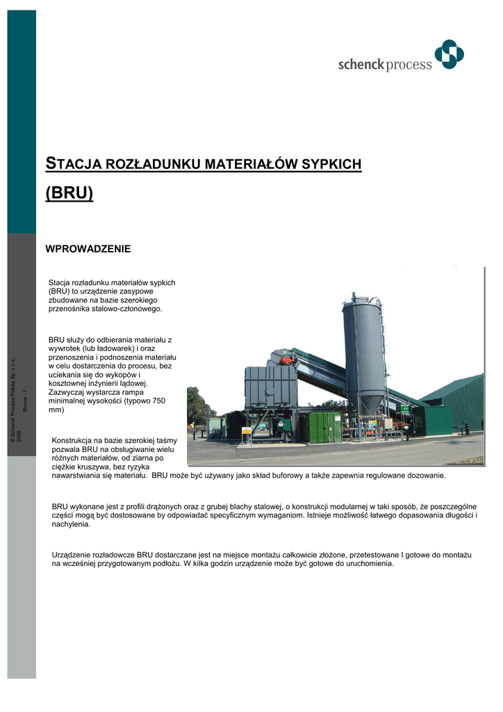 STACJA ROZŁADUNKU MATERIAŁÓW SYPKICH (BRU) WPROWADZENIE © Schenck Process Polska Sp. z o.o. 2008 Strona - 1 - Stacja rozładunku materiałów sypkich (BRU) to urządzenie zasypowe zbudowane na bazie szerokiego przenośnika stalowo-członowego. BRU słuŜy do odbierania materiału z wywrotek (lub ładowarek) i oraz przenoszenia i podnoszenia materiału w celu dostarczenia do procesu, bez uciekania się do wykopów i kosztownej inŜynierii lądowej. Zazwyczaj wystarcza rampa minimalnej wysokości (typowo 750 mm) Konstrukcja na bazie szerokiej taśmy pozwala BRU na obsługiwanie wielu róŜnych materiałów, od ziarna po cięŜkie kruszywa, bez ryzyka nawarstwiania się materiału. BRU moŜe być uŜywany jako skład buforowy a takŜe zapewnia regulowane dozowanie. BRU wykonane jest z profili drąŜonych oraz z grubej blachy stalowej, o konstrukcji modularnej w taki sposób, Ŝe poszczególne części mogą być dostosowane by odpowiadać specyficznym wymaganiom. Istnieje moŜliwość łatwego dopasowania długości i nachylenia. Urządzenie rozładowcze BRU dostarczane jest na miejsce montaŜu całkowicie złoŜone, przetestowane I gotowe do montaŜu na wcześniej przygotowanym podłoŜu. W kilka godzin urządzenie moŜe być gotowe do uruchomienia. OPIS Odbiera większość materiałów dostarczanych cięŜarówkami lub koparkami; stanowi kosz wyładowczy i dozownik w jednym. BRU zaprojektowane jest do montaŜu naziemnego z minimalnymi wymaganiami budowlanymi . MoŜe być wyposaŜony w opcjonalną obudowę platerowaną Bezstopniowy napęd hydrauliczny i zintegrowany system sterowania pozwala na dostosowanie szybkości rozładunku do moŜliwości kursowania cięŜarówek. W zaleŜności od właściwości materiału, wydajność rozładunku moŜe przekraczać 500 ton na godzinę. © Schenck Process Polska Sp. z o.o. 2008 Strona - 2 - TYPOWE PRODUKTY • Kruszywa • świr • Tlenki metali • Produkty rolne • Glina • Rudy • Karmy zwierzęce • Węgiel • Granulki • Bazalt, kamień • Ziarna kakao • Koks naftowy • Cement, Klinkier • Nawozy • Wapno palone • ZboŜa • Gips • Piach • Glinka biała • Wapień • Wióry drewna DANE TECHNICZNE Ogólne Typowe długości urządzenia: 7.5m, 10m, 12.5m, 15m lub 17.5m. Nachylenia: 10°, 15°, 20° lub 25°. ZaleŜnie od charakterystyki produktu, pojemność magazynowania około 30m3. Wymagana jest rampa minimalnej wysokości 750 mm, by koniec wywrotki znajdował się powyŜej końcówki dozownika. Podstawa konstrukcji Podstawa urządzenia BRU wykonana jest z 6mm płyt z miękkiej stali odpowiednio usztywnionej profilami stalowymi oraz podpór . Wlot zabezpieczony jest odpowiednimi wzmocnieniami a optymalne ładowanie zapewnione jest przez lej rozładowczy odpowiedni do materiału. Materiał dostaje się na taśmę przenośnika z panelami bocznymi i regulowanymi listwami burtowymi Dozownik Łańcuch 152 mm dwucięgnowy drabinowy łańcuch przenośnikowy wykonany z wysoko rozciągliwej stali z pełnymi rozpórkami i tulejami łączącymi i z 89mm utwardzanymi rolkami poruszającymi się po odpornej na zuŜycie bieŜni manganowej. W kaŜdym momencie łańcuch ma połączenie z uchem montaŜowej listwy wsporczej taśmy. Projektowy współczynnik bezpieczeństwa łańcucha 10:1 Centralna manganowa szyna ślizgowa biegnie wzdłuŜ urządzenia dostarczając pośredniego wsparcia dla listew wsporczych taśmy w przypadku ekstremalnych przeciąŜeń. © Schenck Process Polska Sp. z o.o. 2008 Strona - 3 - Taśma 2600 mm szerokości przenośnik taśmowy odpowiedni do charakterystyk produktów. Cały profil jest wulkanizowany wokół kaŜdego brzegu przenośnika dostarczając powierzchni styku dla regulowanego uszczelnienia materiału i usztywniając brzegi taśmy. Taśma jest pewnie zamocowana odpornymi na korozję elementami do listew wsporczych. Wał napędowy i zwrotny. Wał napędowy jest wykonany wysoko rozciągliwej stali a wał zwrotny jest wykonany ze stali miękkiej. Wał napędowy jest mocowany na cokole łoŜyskowym, wał zwrotny na zespole łoŜysk absorbujących Napęd. Bezstopniowy hydrauliczny system napędowy składa się z silnika elektrycznego (IP55), bezpośrednio zasprzęglonej przekładni, zespołu pompy hydraulicznej zmontowanego wału. Obwód hydrauliczny zawiera urządzenie blokady ruchu wstecznego regulowany zawód bezpieczeństwa zabezpieczający system przed przeciąŜeniem. Zmienna prędkość jest uzyskiwana poprzez regulację przepływu oleju hydraulicznego w zespole pompy hydraulicznej, co wiąŜe przepływ z Ŝądaną prędkością taśmy. Wymagana prędkość taśmy jest ustawiana przez regulację zaworu przepływowego podczas uruchomienia i w zasadzie nie jest zmieniana podczas pracy. Zesyp wylotowy Zesyp rozładowczy z wylotem kołnierzowym jest wykonany z płyt ze stali miękkiej, które mogą być obłoŜone jako opcja. Bezpieczeństwo i wyposaŜenie kontrolne. Następujące zespoły są dostarczane wstępnie podłączone do lokalnego panelu sterowniczego: • Monitor obrotów wału zwrotnego • Wyłącznik przekroczenia poziomu materiału w zesypie • Przycisk zatrzymania awaryjnego • Detektor niskiego poziomu oleju hydraulicznego i wyłącznik • Detektor wysokiej temperatury oleju hydraulicznego i wyłącznik . Miejscowy Elektryczny Panel Sterowania Urządzenie wyposaŜone w naścienny Panel Sterowania przystosowany do zasilania trójfazowego zapewnia automatyczne sterowanie silnikiem hydraulicznym i elektrozaworem urządzenia BRU. © Schenck Process Polska Sp. z o.o. 2008 Strona - 4 - Panel posiada przekaźnik bezpieczeństwa załączany za pomocą przycisku zlokalizowanego drzwiczkach do monitorowania wejść bezpieczeństwa i przycisków zatrzymania awaryjnego.. Na panelu zamontowane są:- • Izolowana rączka blokady drzwi • Przycisk wyłączania awaryjnego • Lampka zasilania • Przycisk zasilania • Zatrzaskowy przycisk awaryjny • Przycisk startu silnika hydraulicznego Urz