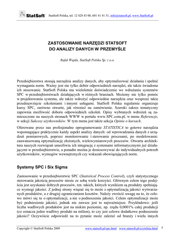 StatSoft Polska, tel. 12 428 43 00, 601 41 41 51, [email protected], www.StatSoft.pl ZASTOSOWANIE NARZĘDZI STATSOFT DO ANALIZY DANYCH W PRZEMYŚLE Rafał Wajda, StatSoft Polska Sp. z o.o. Przedsiębiorstwa stosują narzędzia analizy danych, aby optymalizować działania i spełnić wymagania norm. Ważny jest nie tylko dobór odpowiednich narzędzi, ale także świadome ich stosowanie. StatSoft Polska ma wieloletnie doświadczenie we wdrażaniu systemów SPC w przedsiębiorstwach działających w różnych branżach. Możemy nie tylko pomóc w projektowaniu systemu, ale także wdrożyć odpowiednie narzędzia oraz wesprzeć takie przedsięwzięcie szkoleniami i innymi usługami. StatSoft Polska regularnie organizuje kursy SPC, zarówno otwarte, jak również na zamówienie. Szeroki zakres tematyczny zapewnia możliwość doboru odpowiednich szkoleń. Opisy wybranych wdrożeń są zamieszczone na naszych stronach WWW w portalu www.SPC.com.pl, w menu Referencje, w sekcji Sukcesy użytkowników. W tym menu jest także sekcja Opinie o kursach. Oferowane przez nas profesjonalne oprogramowanie STATISTICA to gotowe narzędzia wspomagające praktycznie każdy aspekt analizy danych: od wprowadzania danych z urządzeń pomiarowych, poprzez monitorowanie i sterowanie procesami, po modelowanie: zaawansowaną optymalizację złożonych, wielowymiarowych procesów. Otwarta architektura naszych rozwiązań umożliwia ich integrację z systemami informatycznymi już działającymi w przedsiębiorstwie, a ponadto można je dostosowywać do indywidualnych potrzeb użytkowników, wymogów wewnętrznych czy wskazań obowiązujących norm. Systemy SPC i Six Sigma Zastosowanie w przedsiębiorstwie SPC (Statistical Process Control), czyli statystycznego sterowania jakością procesów niesie ze sobą wiele korzyści. Głównym celem tego podejścia jest uzyskanie dobrych procesów, tzn. takich, których wynikiem są produkty spełniające wymogi jakości. Z jednej strony wiązać się to może z optymalizacją jakości wytwarzanych produktów, a z drugiej ograniczaniem kosztów. Należy zwrócić uwagę na to, że celowo mówi się tu o optymalizacji, a nie o podnoszeniu jakości. Celem optymalizacji może być podniesienie jakości, jednak nie zawsze jest to najważniejsze. Przykładowo: jeśli liczba wadliwych produktów jest na niskim poziomie, np. rzędu 0,0001% całej produkcji (co oznacza jeden wadliwy produkt na milion), to czy jest celowe dodatkowe podnoszenie jakości? Oczywiście odpowiedź na to pytanie może zależeć od branży i wielu innych Copyright © StatSoft Polska 2009 www.statsoft.pl/spc.html www.statsoft.pl/czytelnia.html 5 StatSoft Polska, tel. 12 428 43 00, 601 41 41 51, [email protected], www.StatSoft.pl czynników, jednak z reguły okaże się, że koszty związane z podniesieniem jakości będą zbyt wysokie w porównaniu z kosztami obsłużenia reklamacji i po prostu nie będzie to opłacalne. Stosując narzędzia SPC, można dopasować jakość produktów do potrzeb i wymagań odbiorców tak, aby nie była ani za wysoka (bo wiąże się to zazwyczaj z dużymi kosztami na etapie produkcji), ani za niska (bo wtedy koszty reklamacji będą zbyt wysokie). Podstawową korzyścią z zastosowania SPC jest polepszenie jakości produkcji i uzyskanie stabilnych i przewidywalnych procesów. Źródłem oszczędności jest uniknięcie wytwarzania wadliwych produktów i zmniejszenie (czasem do zera) kosztów kontroli odbiorczej, a wszystko to bez kosztownych inwestycji w nowy park maszynowy. Korzyści z SPC wiążą się także z możliwością monitorowania procesów produkcyjnych. Cechą systemu produkcyjnego jest zazwyczaj złożoność i zależność od wielu czynników, zarówno technicznych, jak i osobowych. Narzędzia SPC pozwalają obserwować procesy i wychwytywać nietypowe zdarzenia lub zmiany trendów, które mogą sygnalizować rozregulowania lub wręcz przyszłe awarie. O wiele łatwiej i szybciej (a często także taniej) jest wyeliminować źródło rozregulowania, niż usuwać jego skutki. Przykładem firmy, w której (podobnie jak w wielu innych) wdrożenie systemu SPC (a konkretnie STATISTICA Enterprise/QC) przyniosło mierzalne korzyści, jest firma Steelcase1. Wprowadzone zmiany okazały się sukcesem. Jedną z wielu korzyści było to, że średnia grubość warstwy malarskiej (lakier, farba itp. na malowanych elementach zestawów biurowych) zmalała o 40% i w znaczący sposób zmniejszyła się zmienność tego procesu. Nowy proces malowania nadal dostarczał klientom elementy o wystarczającym pokryciu, jednak przy znacznie mniejszych kosztach dla firmy. Dzięki temu w pierwszym roku po wprowadzeniu tych usprawnień w każdej z linii lakierniczych, firma zaoszczędziła materiały o wartości trzykrotnie przewyższającej wszystkie wydatki na oprogramowanie STATISTICA Enterprise/QC, jego implementację oraz szkolenia pracowników. Niewątpliwą zaletą nowoczesnego systemu SPC jest możliwość automatyzacji wielu czynności, takich jak np. zbieranie pomiarów czy generowanie raportów, z wykorzystaniem narzędzi informatycznych. Planowane wdrożenie nowoczesnego systemu SPC wiąże się często z niechęcią ze strony pracowników, ponieważ obawiają się oni zwolnień. Jest wiele przykładów tego, że takie obawy są nieuzasadnione. Jednym z nich jest firma TBMECA, w której przejście od kart kontrolnych wypełnianych na papierze do informatycznego systemu SPC zaowocowało spadkiem czasu poświęcanego na samo zbieranie pomiarów średnio aż o 40%, co przekładało się na ponad 6 godzin czasu zaoszczędzonego w ciągu każdej doby! Co więcej, nikt nie został zwolniony z powodu wprowadzenia systemu, a osoby związane z nadzorowaniem procesów produkcyjnych mają teraz znacznie więcej czasu na analizę zbieranych danych, optymalizację procesów, zapobieganie rozregulowaniom itd.2 1 Steelcase jest firmą działającą w branży meblarskiej. Więcej informacji o 
