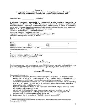 Umowa nr o przystąpieniu do realizacji programu ochrony zasobów genetycznych świń rasy puławskiej u hodowcy nie spełniającego warunków MŚP zawarta w dniu r. pomiędzy: I. Polskim Związkiem Hodowców i Producentów Trzody Chlewnej „POLSUS” w Warszawie, ul. Ryżowa 90, 02-495 Warszawa, wpisanym do rejestru przedsiębiorców Krajowego Rejestru Sądowego prowadzonego przez Sąd Rejonowy w dla M. St. Warszawy, XIII Wydział Gospodarczy Krajowego Rejestru Sądowego pod numerem KRS 0000104403, NIP 526-17-18-940, Regon 000872680, reprezentowanym przez: Tadeusza Blicharskiego – Dyrektora Biura oraz Katarzynę Bartnicką – Główną Księgową na podstawie pełnomocnictwa udzielonego przez Prezydium Z.G. zwanym w dalszej części umowy „POLSUS” a II. Adres: PESEL: NIP: PESEL: NIP: Nr gospodarstwa w systemie IRZ (IACS): reprezentowanym przez: KRS: KRS: KRS: KRS: 1 1. 2. zwanym w dalszej części umowy „Hodowcą” zwanymi również łącznie „Stronami”. §1 Przedmiot umowy Przedmiotem umowy jest prowadzenie przez POLSUS oceny wartości użytkowej świń rasy puławskiej objętych Programem ochrony zasobów genetycznych świń rasy puławskiej. §2 Oświadczenie Hodowcy Hodowca oświadcza, że: 1. Nie spełnia wymogów MŚP w rozumieniu przepisów załącznika I do rozporządzenia Komisji (UE) nr 702/2014 z dnia 25 czerwca 2014 r. uznające niektóre kategorie pomocy w sektorach rolnym i leśnym oraz na obszarach wiejskich za zgodne z rynkiem wewnętrznym w zastosowaniu art. 107 i 108 Traktatu o funkcjonowaniu Unii Europejskiej (Dz. Urz. UE L 193 z 1.07.2014, str. 1), tj. nie spełnia równocześnie trzech warunków: a) zatrudnia mniej niż 250 pracowników b) roczny obrót przedsiębiorstwa nie przekracza 50 mln EUR lub jego całkowity bilans roczny nie przekracza 43 mln EUR c) mniej niż 25% kapitału lub praw głosu, poza przypadkiem określonym w ust. 2 akapicie 2 tego załącznika, kontroluje bezpośrednio lub pośrednio, wspólnie lub indywidualnie, co najmniej jeden organ państwowy. 2. Zobowiązuje się do powiadamia POLSUS o zmianie statusu MŚP; 1 Dla Hodowców będących osobami fizycznymi podać PESEL, NIP; dla Hodowców nie będących osobami fizycznymi podać NIP, KRS 1 3. Zapoznał się z Programem ochrony zasobów genetycznych świń rasy puławskiej stanowiącym załącznik 1 do umowy, zwanym dalej Programem i przystępuje do jego realizacji; 4. Posiada stado świń rasy puławskiej o liczebności: loch i knurów; 5. Stado objęte jest oceną wartości użytkowej prowadzoną przez upoważniony podmiot; 6. Wyraża zgodę i upoważnia POLSUS oraz Instytut Zootechniki PIB do nieograniczonego przetwarzania danych osobowych (imię i nazwisko, dokładny adres korespondencyjny, numer telefonu, informacje o stadzie podstawowym, wyniki oceny wartości użytkowej i hodowlanej) poprzez ich utrwalanie, przechowywanie, opracowywanie i udostępniania dla celów statystycznych, informacyjnych, hodowlanych i sprawozdawczych oraz publikacji własnych; 7. Został powiadomiony o przysługującym mu prawie do wglądu do danych przechowywanych w bazach POLSUS i Instytutu Zootechniki PIB oraz do ich poprawiania. §3 Obowiązki Hodowcy Hodowca zobowiązuje się do: 1. Utrzymywania stada świń rasy puławskiej o liczebności nie mniejszej niż loch.; 2. Przestrzegania zasad określonych w Programie; 3. Poddawania zwierząt ocenie wartości użytkowej oraz wpisom do ksiąg hodowlanych dokonywanych przez POLSUS; 4. Odchowu czystorasowego materiału hodowlanego zgodnie z założeniami Programu; 5. Prowadzenia wymaganych zapisów hodowlanych oraz przestrzegania zaleceń wydanych ustnie lub pisemnie przez POLSUS, przedstawiciela Instytutu Zootechniki PIB lub osobę kontrolującą; 6. Udostępniania, na podstawie odrębnego porozumienia uzgodnionego z POLSUS, zwierząt do celów badawczych przy zachowaniu obowiązujących przepisów weterynaryjnych; 7. Przekazywania informacji dotyczących liczebności, warunków i kosztów utrzymania stada oraz innych danych o stadzie do Krajowej bazy danych o zasobach genetycznych zwierząt gospodarskich prowadzonej w Instytucie Zootechniki PIB; 8. Zapewnienia zwierzętom odpowiednich warunków utrzymania. §4 Obowiązki POLSUS POLSUS zobowiązuje się do: 1. Kwalifikacji zwierząt do uczestnictwa w Programie; 2. Prowadzenia ewidencji zwierząt i prac hodowlanych w stadzie zgodnie z założeniami Programu; 3. Zapewnienia fachowej pomocy i doradztwa w zakresie utrzymania i prowadzenia stada uczestniczącego w Programie. §5 Wynagrodzenie za usługi 1. Z tytułu wykonania przez POLSUS czynności wynikających z niniejszej umowy, Hodowca zobowiązuje się do zapłaty na rzecz POLSUS wynagrodzenia: a) za ocenę wartości użytkowej loch, ocenę wartości użytkowej loszek i knurków (potomstwa ocenianych loch): - w stadach rasy puławskiej - 23,00 zł netto miesięcznie za 1 lochę. b) za ocenę budowy knurków i loszek przy kwalifikacji/wpisie do ksiąg/rejestru loszek i knurów - 6,00 zł netto za 1 sztukę; 2 za dokonanie wpisu do ksiąg - 1,00 zł netto od sztuki; za wydanie zaświadczenia wpisu do księgi - 10,00 zł netto za 1 sztukę; za wydanie świadectwa hodowlanego - 16,00 zł netto za 1 sztukę; za wydanie rodowodu eksportowego - 16,00 zł netto za 1 sztukę; za wystawienie Certyfikatu dopuszczenia knura do rozrodu w stadzie objętym oceną wartości użytkowej - 100,00 zł netto za 1 sztukę. W przypadku zmiany wysokości stawek określonych w ust. 1 umowy, POLSUS nie później niż na 14 (czternaście) dni przed rozpoczęciem kolejnego okresu rozliczeniowego doręczy Hodowcy za poświadczeniem przez niego odbioru, podpisany aneks dotyczący zmiany wysokości opłat obowiązujących w nowym okresie rozliczeniowym. Zwrot przez Hodowcę podpisanego aneksu w terminie 14 (czternastu) dni od dnia doręczenia, będzie oznaczać zmianę warunków umowy w zakresie objętym aneksem. Nowe stawki wynagrodzenia będą wówczas obowiązywać od począt
