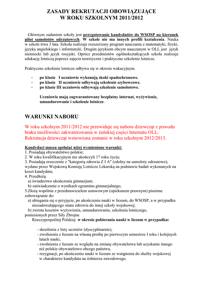 ZASADY REKRUTACJI OBOWIĄZUJĄCE W ROKU SZKOLNYM 2011/2012 Głównym zadaniem szkoły jest przygotowanie kandydatów do WSOSP na kierunek pilot samolotów odrzutowych. W szkole nie ma innych profili kształcenia. Nauka w szkole trwa 3 lata. Szkoła realizuje rozszerzony program nauczania z matematyki, fizyki, języka angielskiego i informatyki. Drugim językiem obcym nauczanym w OLL jest język niemiecki lub język rosyjski. Oprócz przedmiotów ogólnokształcących szkoła realizuje edukację lotniczą poprzez zajęcia teoretyczne i praktyczne szkolenie lotnicze. Praktyczne szkolenie lotnicze odbywa się w okresie wakacyjnym. - po klasie I uczniowie wykonują skoki spadochronowe. po klasie II uczniowie odbywają szkolenie szybowcowe. po klasie III uczniowie odbywają szkolenie samolotowe. Uczniowie mają zagwarantowany bezpłatny internat, wyżywienie, umundurowanie i szkolenie lotnicze. WARUNKI NABORU W roku szkolnym 2011/2012 nie przewiduje się naboru dziewcząt z powodu braku możliwości zakwaterowania w żeńskiej części Internatu OLL. Rekrutacja dziewcząt wznowiona zostanie w roku szkolnym 2012/2013. Kandydaci musza spełniać niżej wymienione warunki: 1. Posiadają obywatelstwo polskie; 2. W roku kwalifikacyjnym nie ukończyli 17 roku życia; 3. Posiadają orzeczenie z "kategorią zdrowia Z I A" (zdolny na samoloty odrzutowe), wydane przez Wojskową Komisję Lotniczo Lekarską na podstawie badań wykonanych na koszt kandydata; 4. Przedłożą: a) świadectwo ukończenia gimnazjum; b) zaświadczenie o wynikach egzaminu gimnazjalnego; 5.Złożą wspólnie z przedstawicielem ustawowym (opiekunem prawnym) pisemne zobowiązanie do: a) ubiegania się o przyjęcie, po ukończeniu nauki w liceum, do WSOSP, a w przypadku niezadowalającego stanu zdrowia do innej szkoły wojskowej; b) zwrotu kosztów wyżywienia, umundurowania, szkolenia lotniczego, poniesionych przez Siły Zbrojne Rzeczypospolitej Polskiej w okresie pobierania nauki w liceum w przypadku: - skreślenia z listy uczniów (dyscyplinarnie), - zwolnienia z liceum na własną prośbę po pierwszym semestrze I roku i kolejnych latach nauki, - zwolnienia z liceum ze względu na zmianę obywatelstwa lub uzyskanie innego niż polskie obywatelstwo obcego państwa, - rezygnacji, po ukończeniu nauki w liceum ze wstąpienia do służby wojskowej w charakterze kandydata na żołnierza zawodowego. REKRUTACJA W terminie od 1 listopada do 30 kwietnia roku szkolnego poprzedzającego naukę w klasie I należy przesłać na adres OLL: 1) podanie o przyjęcie do szkoły, 2) życiorys, 3) potwierdzoną przez macierzystą szkołę kserokopię świadectwa ukończenia II klasy gimnazjum. Kandydaci do Liceum Lotniczego winni spełniać podstawowe wymogi zdrowotne: 1) prawidłowa budowa ciała (wzrost 160-185 cm; waga – wskaźnik BMI 20-30); 2) wyleczone uzębienie (obecność 2 ognisk próchnicy wymaga leczenia); 3) pełna drożność dróg oddechowych (infekcja z katarem wymaga wyleczenia, prosta przegroda nosa, brak zmian w zatokach przynosowych); 4) płynna, wyraźna mowa (kandydaci z zaburzeniami mowy lub w trakcie leczenia zaburzeń mowy nie będą przyjmowani); 5) pełna ostrość wzroku (wady refrakcji, zez, niezdolność rozróżniania barw eliminują z dalszych badań); 6) doskonały słuch – nieprawidłowy wynik audiogramu dyskwalifikuje; 7) układ kostno-stawowy oceniony w rtg kręgosłupa – skrzywienia i wady kręgosłupa eliminują z dalszych badań; 8) układ sercowo-naczyniowy oceniony w badaniach EKG i ECHO-2D serca: zaburzenia rytmu, przewodzenia oraz wady serca stanowią p/wskazanie do dalszych badań. Kandydat zostanie powiadomiony o terminie badań lotniczo-lekarskich, które odbywają się w 6 Szpitalu Wojskowym (6 SzW) w Dęblinie. Badania trwają 3 dni. W trakcie badań nie zapewniamy wyżywienia i zakwaterowania. Kandydat zgłasza się na badania wypoczęty i na czczo. Badania lekarskie kandydata do OLL, zgodnie z § 1 ust. 1pkt. 3 Regulaminu Rekrutacji w Ogólnokształcącym Liceum Lotniczym, stanowiącego załącznik Nr 12 Statutu OLL, wykonywane są na koszt kandydata. Według cennika 6 SzW w Dęblinie koszt badań kandydata do OLL wynosi 786 zł. Kandydat zgłasza się na badania z rodzicem (opiekunem) i legitymacją szkolną. Rodzaj badania Cena badania Laboratorium(OB, morfologia krwi, analiza moczu) 25 zł RTG klatki piersiowej(duże zdjęcie) 26 zł RTG zatok 20 zł RTG kręgosłupa (5 zdjęć) 100 zł Audiogram 30 zł Próby obrotowe 20 zł EKG 15 zł ECHO-2D serca 75 zł EEG 85 zł KNC (3500m) 175 zł Neurolog 34 zł Chirurg 34 zł Psycholog 45 zł Stomatolog 34 zł Okulista 34 zł Laryngolog 34 zł RAZEM 786 zł W przypadku braku możliwości stawienia się w wyznaczonym terminie (nie wyleczone uzębienie, przeziębienie, katar, itp.) kandydat telegraficznie lub telefonicznie powiadamia najpóźniej na 2 dni przed datą rozpoczęcia badań sekretariat OLL. Tylko kandydaci, którzy w wyniku badań otrzymają kategorię zdrowia Z I A przystępują do następnego etapu rekrutacji i składają w sekretariacie OLL: świadectwo ukończenia gimnazjum, zaświadczenie o wynikach egzaminu gimnazjalnego.Kategoria zdrowia Z1A jest najwyższą kategoria zdrowia, bez najmniejszych uchybień. Przy ustaleniu liczby punktów dla kandydata z grupą zdrowia Z I A szkolna komisja rekrutacyjno-kwalifikacyjna uwzględnia kryteria określone przez Lubelskiego Kuratora Oświaty: Kandydat ubiegający się o przyjęcie do klasy pierwszej może otrzymać w postępowaniu rekrutacyjno-kwalifikacyjnym maksymalnie 200 punktów, w tym: 1) 100 punktów za wyniki uzyskane z części humanistycznej i matematycznoprzyrodniczej egzaminu gimnazjalnego; 2) 80 punktów za oceny z języka polskiego, matematyki, fizyki i języka angielskiego, otrzymane na świadectwie ukończenia gimnazjum, zgodnie z zasadą: - 20 punktów ocena: celujący, - 18 punktów ocena: bardzo dobry, - 15 punktów ocena: dobry, - 8 punktów ocena: dostateczny, - 2 punk
