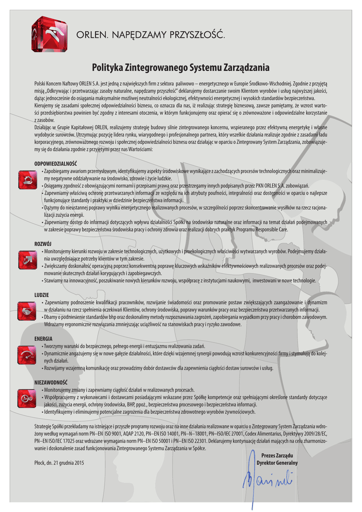 Polityka Zintegrowanego Systemu Zarządzania Polski Koncern Naftowy ORLEN S.A. jest jedną z największych firm z sektora paliwowo – energetycznego w Europie Środkowo-Wschodniej. Zgodnie z przyjętą misją „Odkrywając i przetwarzając zasoby naturalne, napędzamy przyszłość” deklarujemy dostarczanie swoim Klientom wyrobów i usług najwyższej jakości, dążąc jednocześnie do osiągania maksymalnie możliwej neutralności ekologicznej, efektywności energetycznej i wysokich standardów bezpieczeństwa. Kierujemy się zasadami społecznej odpowiedzialności biznesu, co oznacza dla nas, iż realizując strategię biznesową, zawsze pamiętamy, że wzrost wartości przedsiębiorstwa powinien być zgodny z interesami otoczenia, w którym funkcjonujemy oraz opierać się o zrównoważone i odpowiedzialne korzystanie z zasobów. Działając w Grupie Kapitałowej ORLEN, realizujemy strategię budowy silnie zintegrowanego koncernu, wspieranego przez efektywną energetykę i własne wydobycie surowców. Utrzymując pozycję lidera rynku, wiarygodnego i profesjonalnego partnera, który wszelkie działania realizuje zgodnie z zasadami ładu korporacyjnego, zrównoważonego rozwoju i społecznej odpowiedzialności biznesu oraz działając w oparciu o Zintegrowany System Zarządzania, zobowiązujemy się do działania zgodnie z przyjętymi przez nas Wartościami: ODPOWIEDZIALNOŚĆ • Zapobiegamy awariom przemysłowym, identyfikujemy aspekty środowiskowe wynikające z zachodzących procesów technologicznych oraz minimalizujemy negatywne oddziaływanie na środowisko, zdrowie i życie ludzkie. • Osiągamy zgodność z obowiązującymi normami i przepisami prawa oraz przestrzegamy innych podpisanych przez PKN ORLEN S.A. zobowiązań. • Zapewniamy właściwą ochronę przetwarzanych informacji ze względu na ich atrybuty poufności, integralności oraz dostępności w oparciu o najlepsze funkcjonujące standardy i praktyki w dziedzinie bezpieczeństwa informacji. • Dążymy do nieustannej poprawy wyniku energetycznego realizowanych procesów, w szczególności poprzez skoncentrowanie wysiłków na rzecz racjonalizacji zużycia energii. • Zapewniamy dostęp do informacji dotyczących wpływu działalności Spółki na środowisko naturalne oraz informacji na temat działań podejmowanych w zakresie poprawy bezpieczeństwa środowiska pracy i ochrony zdrowia oraz realizacji dobrych praktyk Programu Responsible Care. ROZWÓJ • Monitorujemy kierunki rozwoju w zakresie technologicznych, użytkowych i proekologicznych właściwości wytwarzanych wyrobów. Podejmujemy działania uwzględniające potrzeby klientów w tym zakresie. • Zwiększamy doskonałość operacyjną poprzez konsekwentną poprawę kluczowych wskaźników efektywnościowych realizowanych procesów oraz podejmowanie skutecznych działań korygujących i zapobiegawczych. • Stawiamy na innowacyjność, poszukiwanie nowych kierunków rozwoju, współpracę z instytucjami naukowymi, inwestowani w nowe technologie. LUDZIE • Zapewniamy podnoszenie kwalifikacji pracowników, rozwijanie świadomości oraz promowanie postaw zwiększających zaangażowanie i dynamizm w działaniu na rzecz spełnienia oczekiwań Klientów, ochrony środowiska, poprawy warunków pracy oraz bezpieczeństwa przetwarzanych informacji. • Dbamy o podniesienie standardów bhp oraz doskonalimy metody rozpoznawania zagrożeń, zapobiegania wypadkom przy pracy i chorobom zawodowym. Wdrażamy ergonomiczne rozwiązania zmniejszając uciążliwość na stanowiskach pracy i ryzyko zawodowe. ENERGIA • Tworzymy warunki do bezpiecznego, pełnego energii i entuzjazmu realizowania zadań. • Dynamicznie angażujemy się w nowe gałęzie działalności, które dzięki wzajemnej synergii powodują wzrost konkurencyjności firmy i stymulują do kolejnych działań. • Rozwijamy wzajemną komunikację oraz prowadzimy dobór dostawców dla zapewnienia ciągłości dostaw surowców i usług. NIEZAWODNOŚĆ • Monitorujemy zmiany i zapewniamy ciągłość działań w realizowanych procesach. • Współpracujemy z wykonawcami i dostawcami posiadającymi wskazane przez Spółkę kompetencje oraz spełniającymi określone standardy dotyczące jakości, zużycia energii, ochrony środowiska, BHP, ppoż., bezpieczeństwa procesowego i bezpieczeństwa informacji. • Identyfikujemy i eliminujemy potencjalne zagrożenia dla bezpieczeństwa zdrowotnego wyrobów żywnościowych. Strategię Spółki przekładamy na istniejące i przyszłe programy rozwoju oraz na inne działania realizowane w oparciu o Zintegrowany System Zarządzania wdrożony według wymagań norm PN–EN ISO 9001, AQAP 2120, PN–EN ISO 14001, PN–N–18001, PN–ISO/IEC 27001, Codex Alimentarius, Dyrektywy 2009/28/EC, PN–EN ISO/IEC 17025 oraz wdrażane wymagania norm PN–EN ISO 50001 i PN–EN ISO 22301. Deklarujemy kontynuację działań mających na celu zharmonizowanie i doskonalenie zasad funkcjonowania Zintegrowanego Systemu Zarządzania w Spółce. Prezes Zarządu Płock, dn. 21 grudnia 2015 Dyrektor Generalny
