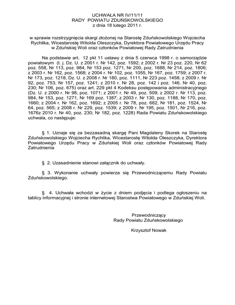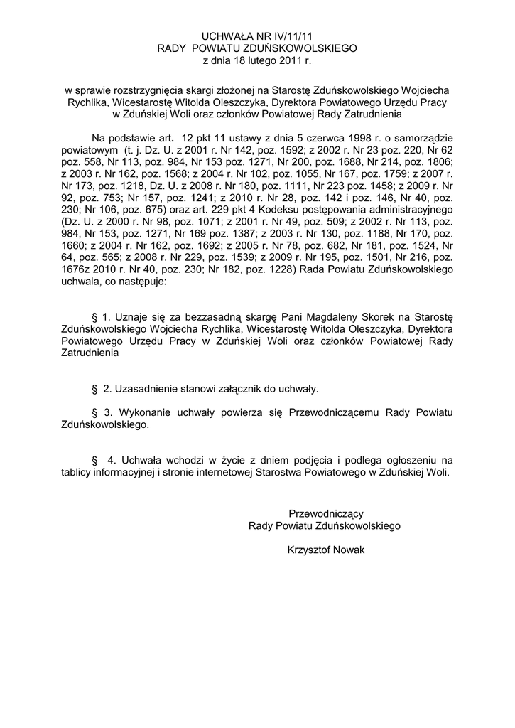 UCHWAŁA NR IV/11/11 RADY POWIATU ZDUŃSKOWOLSKIEGO z dnia 18 lutego 2011 r. w sprawie rozstrzygnięcia skargi złożonej na Starostę Zduńskowolskiego Wojciecha Rychlika, Wicestarostę Witolda Oleszczyka, Dyrektora Powiatowego Urzędu Pracy w Zduńskiej Woli oraz członków Powiatowej Rady Zatrudnienia Na podstawie art. 12 pkt 11 ustawy z dnia 5 czerwca 1998 r. o samorządzie powiatowym (t. j. Dz. U. z 2001 r. Nr 142, poz. 1592; z 2002 r. Nr 23 poz. 220, Nr 62 poz. 558, Nr 113, poz. 984, Nr 153 poz. 1271, Nr 200, poz. 1688, Nr 214, poz. 1806; z 2003 r. Nr 162, poz. 1568; z 2004 r. Nr 102, poz. 1055, Nr 167, poz. 1759; z 2007 r. Nr 173, poz. 1218, Dz. U. z 2008 r. Nr 180, poz. 1111, Nr 223 poz. 1458; z 2009 r. Nr 92, poz. 753; Nr 157, poz. 1241; z 2010 r. Nr 28, poz. 142 i poz. 146, Nr 40, poz. 230; Nr 106, poz. 675) oraz art. 229 pkt 4 Kodeksu postępowania administracyjnego (Dz. U. z 2000 r. Nr 98, poz. 1071; z 2001 r. Nr 49, poz. 509; z 2002 r. Nr 113, poz. 984, Nr 153, poz. 1271, Nr 169 poz. 1387; z 2003 r. Nr 130, poz. 1188, Nr 170, poz. 1660; z 2004 r. Nr 162, poz. 1692; z 2005 r. Nr 78, poz. 682, Nr 181, poz. 1524, Nr 64, poz. 565; z 2008 r. Nr 229, poz. 1539; z 2009 r. Nr 195, poz. 1501, Nr 216, poz. 1676z 2010 r. Nr 40, poz. 230; Nr 182, poz. 1228) Rada Powiatu Zduńskowolskiego uchwala, co następuje: § 1. Uznaje się za bezzasadną skargę Pani Magdaleny Skorek na Starostę Zduńskowolskiego Wojciecha Rychlika, Wicestarostę Witolda Oleszczyka, Dyrektora Powiatowego Urzędu Pracy w Zduńskiej Woli oraz członków Powiatowej Rady Zatrudnienia § 2. Uzasadnienie stanowi załącznik do uchwały. § 3. Wykonanie uchwały powierza się Przewodniczącemu Rady Powiatu Zduńskowolskiego. § 4. Uchwała wchodzi w życie z dniem podjęcia i podlega ogłoszeniu na tablicy informacyjnej i stronie internetowej Starostwa Powiatowego w Zduńskiej Woli. Przewodniczący Rady Powiatu Zduńskowolskiego Krzysztof Nowak UZASADNIENIE Pani Magdalena Skorek od dnia 04.01.2007 roku była zarejestrowana w Powiatowym Urzędzie Pracy w Zduńskiej Woli w charakterze osoby bezrobotnej. Jako bezrobotna, złożyła w dniu 06.11.2007 r. wniosek o przyznanie z Funduszu Pracy jednorazowo środków na podjęcie działalności gospodarczej o charakterze „ Wykonywanie usług fryzjerskich, tlenoterapia i kosmetyka ”. W wyżej wymienionym wniosku Pani Magdalena Skorek oświadczyła, iż nie podejmie i nie zarejestruje działalności gospodarczej do momentu podpisania umowy o przyznanie jednorazowo środków na podjęcie działalności gospodarczej. W dniu 18.12.2007 r., w siedzibie Powiatowego Urzędu Pracy w Zduńskiej Woli zawarta została umowa nr DRP.RRP 5531/173/AM/EFS 1.3/2007 pomiędzy Starostą Zduńskowolskim ( w imieniu którego działał, z upoważnienia, Zastępca Dyrektora Powiatowego Urzędu Pracy w Zduńskiej Woli ) a Panią Magdaleną Skorek. Środki na podjęcie działalności gospodarczej zostały wypłacone w dniu 18.12.2007 roku w kwocie 12.000,00 zł. Pani Magdalena Skorek zobowiązała się również do rozpoczęcia działalności gospodarczej i zgłoszenia jej do ZUS oraz do Urzędu Skarbowego w terminie do dnia 18.02.2008 roku. Zainteresowana zobowiązała się także do rozliczenia w kwocie brutto kwoty 12.000,00 zł i dostarczenia rozliczenia do siedziby Powiatowego Urzędu Pracy w Zduńskiej Woli w terminie do dwóch miesięcy od dnia podjęcia działalności gospodarczej. W tym samym terminie zainteresowana zobowiązała się dostarczyć zaświadczenie o wpisie do ewidencji działalności gospodarczej oraz zaświadczenie o zgłoszeniu działalności do ZUS i Urzędu Skarbowego. W ramach umowy, o której mowa powyżej zainteresowana zobowiązała się również do prowadzenia działalności gospodarczej przez nieprzerwany okres wynoszący co najmniej 12 miesięcy. Umowa przewidywała, że w przypadku niedotrzymania warunków umowy Starosta zastrzega sobie prawo jej wypowiedzenia, a bezrobotny obowiązany będzie wówczas do zwrotu wypłaconej mu kwoty wraz z odsetkami, w ciągu 30 dni od dnia otrzymania wezwania do zapłaty. Zainteresowana w dniu 28.12.2007 roku złożyła oświadczenie, w którym potwierdziła, że przyznane jej środki na podjęcie działalności gospodarczej zostały zaksięgowane na jej koncie bankowym w dniu 18.12.2007 roku. W dniu 15.04.2008 roku do Powiatowego Urzędu Pracy w Zduńskiej Woli wpłynęło rozliczenie środków przyznanych jednorazowo na podjęcie działalności gospodarczej, podpisane przez Panią Magdalenę Skorek. Zainteresowana dostarczyła wówczas m.in. faktury potwierdzające dokonanie wydatków związanych z podjęciem działalności gospodarczej, a także wpis do ewidencji działalności gospodarczej. Niektóre z faktur nie mogły jednakże zostać uznane jako rozliczenie środków wydatkowanych zgodnie z umową nr DRP.RRP 5531/173/AM/EFS 1.3/2007, gdyż potwierdzały dokonanie zakupów na towary niewyszczególnione we wniosku Pani Magdaleny Skorek z dnia 06.11.2007 roku, bądź zakupy dokonane przed podpisaniem umowy co było sprzeczne z obowiązującymi przepisami. Z treści zaświadczenia o wpisie do ewidencji działalności gospodarczej, dołączonego do rozliczenia wydatkowanych środków wynikało, że Pani Magdalena Skorek w dniu 06.11.2007 roku dokonała wpisu do ewidencji działalności gospodarczej, w którym zgłosiła, iż działalność gospodarczą będzie prowadziła od dnia 15.12.2007 r. czyli przed podpisaniem umowy z Powiatowym Urzędem Pracy w Zduńskiej Woli co również oznaczało naruszeniem przepisów. W dniu 14.10.2008 r. zostało wystosowane pismo do Pani Magdaleny Skorek stanowiące wypowiedzenie umowy nr DRP.RRP 5531/173/AM/EFS1.3/2007. Z pisma tego wynikało, że umowa zostaje wypowiedziana z dniem 14.10.2008 roku z uwagi na niedotrzymanie przez Panią Magdalenę Skorek warunków, takich jak: dostarczenie rozliczenia wydatkowanych środków w terminie dwóch miesięcy od dnia podjęcia działalności gospodarc