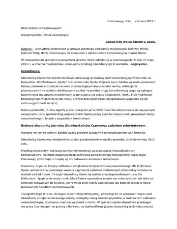 Czarnowąsy, dnia czerwca 2011 r. Rada Sołecka w Czarnowąsach Stowarzyszenie „Nasze Czarnowąsy” Zarząd Dróg Wojewódzkich w Opolu. Dotyczy: konsultacji społecznych w sprawie przebiegu obwodnicy miejscowości Dobrzeń Wielki, Dobrzeń Mały, Borki i Czarnowąsy do połączenia z infrastrukturą komunikacyjną miasta Opola. W nawiązaniu do spotkania w powyższej sprawie, które odbyło się w Czarnowąsach, w dniu 17 maja 2011 r., w imieniu mieszkańców, opiniujemy przebieg obwodnicy wg III wariantu – negatywnie. Uzasadnienie. Mieszkańcy Czarnowąs bardzo dotkliwie odczuwają wzmożony ruch komunikacyjny w kierunku na Namysłów i do Elektrowni „Opole” oraz w kierunku Opola. Objawia się to bardzo wysokim poziomem hałasu, zarówno w dzień jak i w nocy przekraczającym dopuszczalne normy, wibracjami przenoszonymi na obiekty zlokalizowane wzdłuż i w pobliżu drogi, konsekwencją czego są pękające budynki oraz znacznymi utrudnieniami w poruszaniu się pieszo i pojazdami. (korki, brak możliwości bezkolizyjnego włączenia się do ruchu, a wręcz brak możliwości jakiegokolwiek włączenia się do ruchu w godzinach szczytu). Należy podkreślić, iż ulica Jagiełły w Czarnowąsach już w 2005 roku charakteryzowała się najwyższym natężeniem ruchu spośród dróg wojewódzkich Opolszczyzny i jest to miejsce wielu poważnych kolizji samochodowych, łącznie z wypadkiem śmiertelnym. Budowa obwodnicy jest więc dla mieszkańców Czarnowąs zadaniem priorytetowym. Niestety nie jest to jedyny i bardzo ważny problem związany z zamieszkiwaniem tych terenów. Mieszkańcy Czarnowąs wielokrotnie już byli poszkodowani w wyniku powodzi, ostatnio w maju 2010 roku. Przebieg obwodnicy i realizacja tej ważnej inwestycji, poprawiającej niewątpliwie ruch komunikacyjny, nie może pogorszyć bezpieczeństwa powodziowego mieszkańców dużej części Czarnowąs, powodując iż znajdą się oni całkowicie na terenie zalewowym. Uważamy, że po raz kolejny zadbano o zwiększenie bezpieczeństwa powodziowego dla Elektrowni Opole, jednocześnie powodując większe zagrożenie zalaniem oddzielonych obwodnicą terenów na wschód od Elektrowni. Ta część obwodnicy stanie się wałem przeciwpowodziowym, ale dla Elektrowni. Spiętrzenie wody z rzeki Mała Panew spowoduje zalanie nas mieszkańców i nie tylko na terenach zalewanych do tej pory, ale również tych, którzy zamieszkują lub będą mieszkać w nowo budowanych osiedlach mieszkaniowych. Topografia tego terenu, istniejące słupy trakcji elektrycznej, powodują to, że wysokość nasypu pod obwodnicę, w rejonie pierwszego ronda, pomiędzy stacją kontroli pojazdów, a budowanym zakładem samochodowym, przekroczy znacznie wysokość 1 metra. W tym też rejonie obwodnica przebiegać ma przez Czarnowąsy i na granicy z Borkami, co dyskwalifikuje ją jako obwodnicę tych miejscowości. Przewidywana budowa mostu na rzece Mała Panew, w proponowanym miejscu zmniejszy koryto rzeki, co ma znaczenie dla bezpieczeństwa powodziowego i będzie tzw. „wąskim gardłem” dla nurtu tej rzeki. Droga zjazdowa do stacji LOTOS jest drogą prowadzącą do Elektrowni, niespełniającą podstawowych parametrów dla ruchu ciężkich pojazdów z popiołami i opałem ekologicznym. Droga ta, w założeniach była tymczasową, na czas budowy Elektrowni, jest w związku z powyższym ciągle uszkodzona i bardzo dla wszystkich uciążliwa. Na takie rozwiązania i taki przebieg obwodnicy mieszkańcy nie wyrażą nigdy zgody!!! Realizacja III wariantu przebiegu obwodnicy musi być poprzedzona podwyższeniem i naprawą istniejących wałów i budową nowych wałów chroniących nas przed wodami Małej Panwi i za torami wzdłuż Odry. Budowa obwodnicy i jej przebieg powinny rozwiązać problem komunikacyjny, nie pogarszając jednocześnie naszego zabezpieczenia powodziowego, a uważamy wręcz, że tak kosztowna inwestycja powinna nasze bezpieczeństwo powodziowe poprawić. Uważamy również, iż inwestycje powyższe powinny być skoordynowane, zwłaszcza, iż dla obu, inwestorem, zgodnie z jego kompetencjami, jest samorząd województwa Opolskiego. Mieszkańcy świadomi są, że nie jest możliwe bezkolizyjnie zrealizowanie obu inwestycji, a zwłaszcza tej, dotyczącej budowy obwodnicy. Biorąc jednak pod uwagę fakt, iż mieszkamy już w strefie uciążliwej ze względu na lokalizację Elektrowni Opole i przewidywaną jej rozbudowę – projektanci powinni uwzględnić tą strefę przy projektowaniu przebiegu obwodnicy, a nie tylko planując dogodne dojazdy do Elektrowni! Bardzo dużą uciążliwością stanie się dla mieszkańców zamknięcie ulicy Bocznej i najkrótszej drogi dotarcia do ważnych, z punktu widzenia ich bezpieczeństwa miejsc takich jak lekarz itp. Rolnicy stracą dojazd do pól zlokalizowanych na południe od torów kolejowych. Przedstawiając powyższe problemy związane z proponowanym przebiegiem obwodnicy w wersji III, wnioskujemy o ponowną analizę ukształtowania terenu i przygotowanie nowego wariantu przebiegu obwodnicy z uwzględnieniem powyższych uwag, a zwłaszcza bezpieczeństwa powodziowego mieszkańców Czarnowąs. Do wiadomości: 1. 2. 3. 4. 5. 6. Antoni Konopka- Członek Zarządu Województwa Opolskiego Henryk Wróbel- Wójt Gminy Dobrzeń Wielki Transprojekt Sp. Z o.o. ul. Staromiejska 6, 40-013 Katowice Redakcja NTO Redakcja Echa Gmin Opolskich Redakcja „ Beczki”