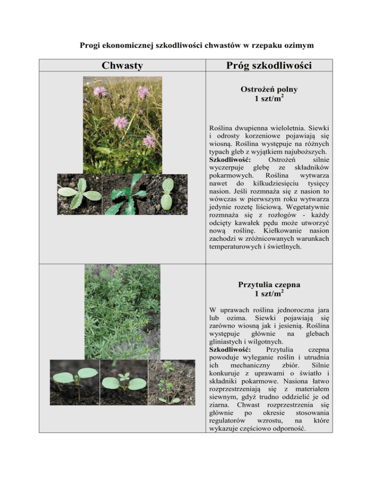 Progi ekonomicznej szkodliwości chwastów w rzepaku ozimym Chwasty Próg szkodliwości Ostrożeń polny 1 szt/m2 Roślina dwupienna wieloletnia. Siewki i odrosty korzeniowe pojawiają się wiosną. Roślina występuje na różnych typach gleb z wyjątkiem najuboższych. Szkodliwość: Ostrożeń silnie wyczerpuje glebę ze składników pokarmowych. Roślina wytwarza nawet do kilkudziesięciu tysięcy nasion. Jeśli rozmnaża się z nasion to wówczas w pierwszym roku wytwarza jedynie rozetę liściową. Wegetatywnie rozmnaża się z rozłogów - każdy odcięty kawałek pędu może utworzyć nową roślinę. Kiełkowanie nasion zachodzi w zróżnicowanych warunkach temperaturowych i świetlnych. Przytulia czepna 1 szt/m2 W uprawach roślina jednoroczna jara lub ozima. Siewki pojawiają się zarówno wiosną jak i jesienią. Roślina występuje głównie na glebach gliniastych i wilgotnych. Szkodliwość: Przytulia czepna powoduje wyleganie roślin i utrudnia ich mechaniczny zbiór. Silnie konkuruje z uprawami o światło i składniki pokarmowe. Nasiona łatwo rozprzestrzeniają się z materiałem siewnym, gdyż trudno oddzielić je od ziarna. Chwast rozprzestrzenia się głównie po okresie stosowania regulatorów wzrostu, na które wykazuje częściowo odporność. Rumianek pospolity 3 szt/m2 Roślina jednoroczna, jara. Siewki pojawiają się wiosną. Rumianek pospolity występuje głównie na glebach gliniastych, żyznych, lekko kwaśnych. Szkodliwość: Chwast konkuruje z gatunkami uprawnymi średnio lub silnie o składniki pokarmowe. Nasiona chwastu charakteryzują się zróżnicowanym okresem spoczynku i dużą zdolnością kiełkowania, mogą więc kiełkować przez cały rok. Siewki jesienne mogą zimować w postaci rozety. Rumian polny 3 szt/m2 Roślina jednoroczna, jara i ozima. Siewki pojawiają się głównie jesienią oraz wiosną. Występuje na różnych typach gleb, na całym obszarze kraju. Szkodliwość: Rumian polny rośnie dobrze zwłaszcza na glebach piaszczystych, kwaśnych, ubogich w składniki pokarmowe. Jedna roślina wytwarza kilka tysięcy nasion o zróżnicowanej wielkości i okresie spoczynku. Rumian polny oddziałuje jako naturalny insektycyd. Chwasty dwuliścienne ( bez dominacji jednego gatunku) - jesienią 20 szt/m2 - wiosną 30 szt/m Chwasty jednoliścienne i samosiewy zbóż 10-15% pokrycia gleby