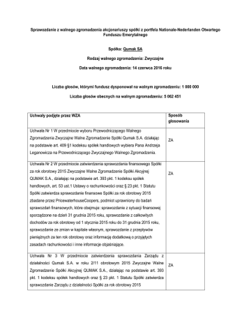 Sprawozdanie z walnego zgromadzenia akcjonariuszy spółki z portfela Nationale-Nederlanden Otwartego Funduszu Emerytalnego Spółka: Qumak SA Rodzaj walnego zgromadzenia: Zwyczajne Data walnego zgromadzenia: 14 czerwca 2016 roku Liczba głosów, którymi fundusz dysponował na walnym zgromadzeniu: 1 000 000 Liczba głosów obecnych na walnym zgromadzeniu: 5 062 451 Uchwały podjęte przez WZA Sposób głosowania Uchwała Nr 1 W przedmiocie wyboru Przewodniczącego Walnego Zgromadzenia Zwyczajne Walne Zgromadzenie Spółki Qumak S.A. działając ZA na podstawie art. 409 §1 kodeksu spółek handlowych wybiera Pana Andrzeja Leganowicza na Przewodniczącego Zwyczajnego Walnego Zgromadzenia. Uchwała Nr 2 W przedmiocie zatwierdzenia sprawozdania finansowego Spółki za rok obrotowy 2015 Zwyczajne Walne Zgromadzenie Spółki Akcyjnej ZA QUMAK S.A., działając na podstawie art. 393 pkt. 1 kodeksu spółek handlowych, art. 53 ust.1 Ustawy o rachunkowości oraz § 23 pkt. 1 Statutu Spółki zatwierdza sprawozdanie finansowe Spółki za rok obrotowy 2015 zbadane przez PricewaterhouseCoopers, podmiot uprawniony do badań sprawozdań finansowych, które obejmuje: sprawozdanie z sytuacji finansowej sporządzone na dzień 31 grudnia 2015 roku, sprawozdanie z całkowitych dochodów za rok obrotowy od 1 stycznia 2015 roku do 31 grudnia 2015 roku, sprawozdanie ze zmian w kapitale własnym, sprawozdanie z przepływów pieniężnych za ten rok obrotowy oraz informację dodatkową o przyjętych zasadach rachunkowości i inne informacje objaśniające. Uchwała Nr 3 W przedmiocie zatwierdzenia sprawozdania Zarządu z działalności Qumak S.A. w roku 2/11 obrotowym 2015 Zwyczajne Walne Zgromadzenie Spółki Akcyjnej QUMAK S.A., działając na podstawie art. 393 pkt. 1 kodeksu spółek handlowych oraz § 23 pkt. 1 Statutu Spółki zatwierdza sprawozdanie Zarządu z działalności Spółki za rok obrotowy 2015 ZA Uchwała Nr 4 W przedmiocie zatwierdzenia skonsolidowanego sprawozdania finansowego Grupy Kapitałowej Qumak za rok obrotowy 2015 Zwyczajne ZA Walne Zgromadzenie Spółki Akcyjnej QUMAK S.A., działając na podstawie art. 55 i art. 63c ust 4 Ustawy o rachunkowości zatwierdza skonsolidowane sprawozdanie finansowe Grupy Kapitałowej Qumak za rok obrotowy 2015 zbadane przez PricewaterhouseCoopers, podmiot uprawniony do badań sprawozdań finansowych, które obejmuje: skonsolidowane sprawozdanie z sytuacji finansowej sporządzone na dzień 31 grudnia 2015 roku, skonsolidowane sprawozdanie z całkowitych dochodów za rok obrotowy od 1 stycznia 2015 roku do 31 grudnia 2015 roku, skonsolidowane sprawozdanie ze zmian w kapitale własnym, skonsolidowane sprawozdanie z przepływów pieniężnych za ten rok obrotowy oraz informację dodatkową o przyjętych zasadach rachunkowości i inne informacje objaśniające. Uchwała Nr 5 W przedmiocie zatwierdzenia sprawozdania Zarządu jednostki dominującej z działalności Grupy Kapitałowej Qumak w roku obrotowym 2015 ZA Zwyczajne Walne Zgromadzenie Spółki Akcyjnej QUMAK S.A., zatwierdza sprawozdanie Zarządu jednostki dominującej z działalności Grupy Kapitałowej Qumak za rok obrotowy 2015. Uchwała Nr 6 W przedmiocie zatwierdzenia sprawozdań Rady Nadzorczej za rok obrotowy 2015 Zwyczajne Walne Zgromadzenie Spółki QUMAK S.A z ZA siedzibą w Warszawie po zapoznaniu się z treścią sprawozdania Rady Nadzorczej za 2015 rok, zawierającego sprawozdanie z działalności Rady Nadzorczej Spółki za 2015 rok oraz sprawozdania z wyników oceny sprawozdania finansowego Spółki i sprawozdania Zarządu z działalności Spółki w roku obrotowym 2015, a także wniosku Zarządu dotyczącego pokrycia straty za rok obrotowy 2015, niniejszym, działając w ramach art. 395 § 5 kodeksu spółek handlowych, zatwierdza wyżej opisane Sprawozdanie Uchwała Nr 7 W przedmiocie pokrycia straty za rok obrotowy 2015 Walne Zgromadzenie Spółki Akcyjnej QUMAK S.A. działając na podstawie art. 395 § 2 ZA pkt. 2 kodeksu spółek handlowych oraz § 23 pkt. 1 Statutu Spółki, po zapoznaniu się z wnioskiem Zarządu postanawia o pokryciu straty za rok obrotowy 2015 w kwocie 9 839 809,96 zł (słownie: dziewięć milionów osiemset trzydzieści dziewięć tysięcy osiemset dziewięć złotych dziewięćdziesiąt sześć groszy) z kapitałów zapasowych. Uchwała Nr 8 W przedmiocie udzielenia absolutorium Wiceprezesowi Zarządu Spółki Panu Jackowi Suchenkowi Zwyczajne Walne Zgromadzenie Spółki ZA Akcyjnej QUMAK S.A. działając na podstawie art. 393 pkt. 1 kodeksu spółek handlowych oraz § 23 pkt. 1 Statutu Spółki postanawia udzielić absolutorium Wiceprezesowi Zarządu Panu Jackowi Suchenkowi z wykonania przez niego 4/11 obowiązków w okresie od 1 stycznia do 31 grudnia 2015 roku. Uchwała Nr 9 W przedmiocie udzielenia absolutorium Wiceprezesowi Zarządu Spółki Panu Wojciechowi Strusińskiemu Zwyczajne Walne Zgromadzenie ZA Spółki Akcyjnej QUMAK S.A. działając na podstawie art. 393 pkt. 1 kodeksu spółek handlowych oraz § 23 pkt. 1 Statutu Spółki postanawia udzielić absolutorium Wiceprezesowi Zarządu, Panu Wojciechowi Strusińskiemu z wykonania przez niego obowiązków w okresie od 11 czerwca do 31 grudnia 2015 roku Uchwała Nr 10 W przedmiocie udzielenia absolutorium Wiceprezesowi Zarządu Spółki Panu Markowi Tiahnybokowi Zwyczajne Walne Zgromadzenie Spółki ZA Akcyjnej QUMAK S.A. działając na podstawie art. 393 pkt. 1 kodeksu spółek handlowych oraz § 23 pkt. 1 Statutu Spółki postanawia udzielić absolutorium Wiceprezesowi Zarządu, Panu Markowi Tiahnybokowi z wykonania przez niego obowiązków w okresie od 3 listopada do 31 grudnia 2015 roku. Uchwała Nr 11 W przedmiocie udzielenia absolutorium Przewodniczącemu Rady Nadzorczej Spółki Panu Markowi Michałowskiemu Zwyczajne Walne ZA Zgromadzenie Spółki Akcyjnej QUMAK S.A. działając na podstawie art. 393 5/11 pkt. 1 kodeksu spółek handlowych oraz § 23 pkt. 1 Statutu Spółki postanawia udzieli