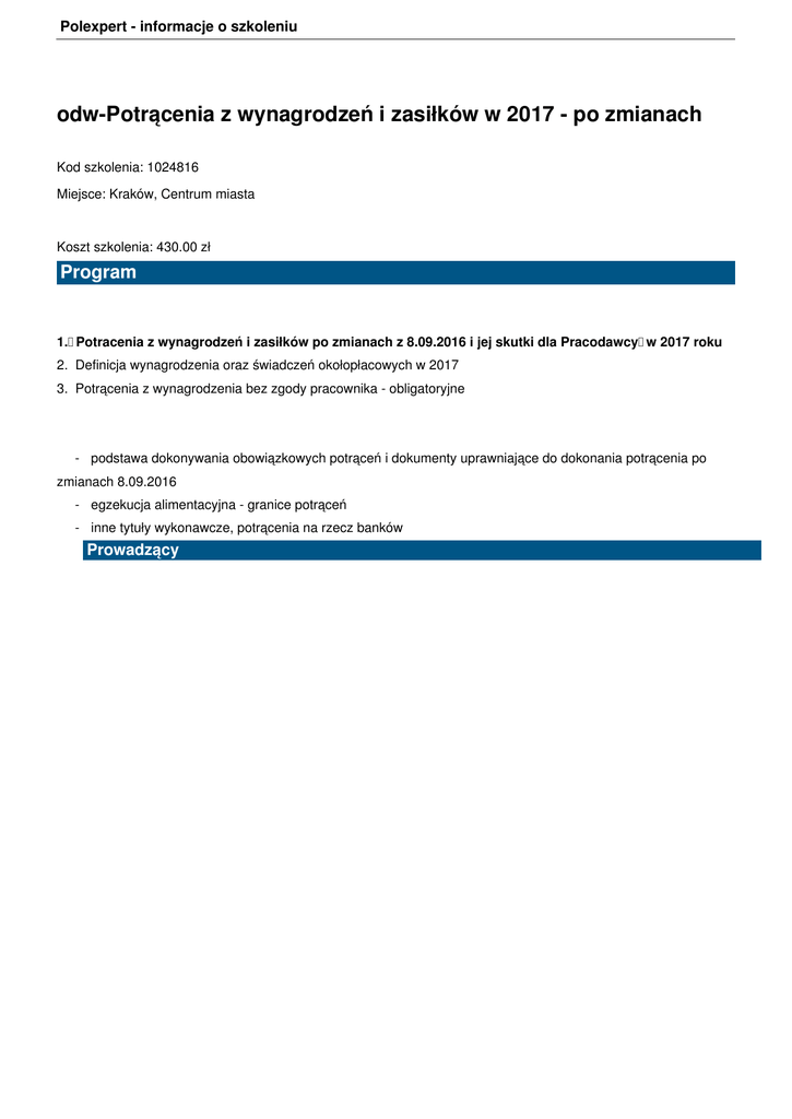 Polexpert - informacje o szkoleniu odw-Potrącenia z wynagrodzeń i zasiłków w 2017 - po zmianach Kod szkolenia: 1024816 Miejsce: Kraków, Centrum miasta Koszt szkolenia: 430.00 zł Program 1. Potracenia z wynagrodzeń i zasiłków po zmianach z 8.09.2016 i jej skutki dla Pracodawcy w 2017 roku 2. Definicja wynagrodzenia oraz świadczeń okołopłacowych w 2017 3. Potrącenia z wynagrodzenia bez zgody pracownika - obligatoryjne - podstawa dokonywania obowiązkowych potrąceń i dokumenty uprawniające do dokonania potrącenia po zmianach 8.09.2016 - egzekucja alimentacyjna - granice potrąceń - inne tytuły wykonawcze, potrącenia na rzecz banków Prowadzący