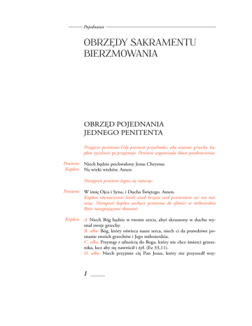 Pojednanie OBRZĘDY SAKRAMENTU BIERZMOWANIA OBRZĘD POJEDNANIA JEDNEGO PENITENTA Przyjęcie penitenta Gdy penitent przychodzi, aby wyznać grzechy, kapłan życzliwie go przyjmuje. Penitent wypowiada słowa pozdrowienia: Penitent: Niech będzie pochwalony Jezus Chrystus. Kapłan: Na wieki wieków. Amen Następnie penitent żegna się mówiąc: Penitent: W imię Ojca i Syna, i Ducha Świętego. Amen. Kapłan równocześnie kreśli znak krzyża nad penitentem nic nie mówiąc. Następnie kapłan zachęca penitenta do ufności w miłosierdzie Boże następującymi słowami: Kapłan: A. Niech Bóg będzie w twoim sercu, abyś skruszony w duchu wyznał swoje grzechy. B. albo: Bóg, który oświeca nasze serca, niech ci da prawdziwe poznanie swoich grzechów i Jego miłosierdzia. C. albo: Przystąp z ufnością do Boga, który nie chce śmierci grzesznika, lecz aby się nawrócił i żył. (Ez 33,11). D. albo: Niech przyjmie cię Pan Jezus, który nie przyszedł wzy- 1 Pojednanie wać do nawrócenia sprawiedliwych, lecz grzeszników. Jemu zaufaj. (Łk 5,32). E. albo: Łaska Ducha Świętego niech oświeci Twoje serce, abyś wyznał z ufnością swoje grzechy i poznał miłosierdzie Boże. F. albo: Jeżeli zgrzeszyłeś, nie trać nadziei, mamy rzecznika wobec Ojca, Jezusa Chrystusa sprawiedliwego. On bowiem jest ofiarą przebłagalną za nasze grzechy, i nie tylko za nasze, lecz również za grzechy całego świata. (1 J 2, 1-2). Penitent: Amen. Penitent, zwłaszcza gdy nie jest znany spowiednikowi, określa swój stan, czas ostatniej spowiedzi, trudności w prowadzeniu życia chrześcijańskiego oraz inne okoliczności, których poznanie jest potrzebne spowiednikowi do wykonywania posługi. CZYTANIE SŁOWA BOŻEGO (DOWOLNE) Jeżeli przemawiają za tym okoliczności, kapłan może odczytać albo przytoczyć z pamięci urywek z Pisma św., który obwieszcza miłosierdzie Boże i wzywa penitenta do odnowy życia. Przy spowiedziach odbywanych w konfesjonałach wskazane jest, aby penitent sam odczytał urywek Pisma św. w czasie przygotowania do spowiedzi. Polecane teksty biblijne: Kapłan: Iz 53, 4-6; Ez 11, 19-20; Mt 6, 14-15; Mk 1, 14-15; Łk 6, 31-38; Łk 15, 1-7; J 20, 19-23; Rz 5, 8-9; Ef 5, 1-2; Kol 1, 12-14; Kol 3, 8-10.12-17; 1 J 1, 6-7.9. WYZNANIE GRZECHÓW Tam, gdzie istnieje taki zwyczaj, przed wyznaniem grzechów penitent może odmówić spowiedź powszechną (np. ‚Spowiadam się’). Następnie penitent wyznaje swoje grzechy. Jeżeli zachodzi potrzeba, kapłan pomaga penitentowi w odbyciu zupełnej spowiedzi, udziela stosownych rad, zachęca go do żalu za grzechy przypominając, że chrześcijanin przez sa- 2 Pojednanie krament pokuty odnawia się w tajemnicy paschalnej umierając i zmartwychwstając z Chrystusem. Następnie wyznacza mu czyn pokutny, który penitent przyjmuje, aby zadośćuczynić za popełnione grzechy i poprawić swoje życie. Kapłan niech stara się we wszystkim dostosować do poziomu penitenta, tak w sposobie mówienia jak i w udzielaniu pouczeń. MODLITWA PENITENTA I ROZGRZESZENIE Następnie kapłan zachęca penitenta do okazania żalu, który penitent może wyrazić w tych lub podobnych słowach: Penitent: A. albo: Boże, bądź miłościw mnie grzesznemu (Łk 18,13). B. albo: Boże, zgrzeszyłem przeciw Tobie, już nie jestem godny nazywać się Twoim dzieckiem. Bądź miłościw mnie grzesznemu (Łk 15,18; 18,13). C. albo: Boże mój żałuję, że Ciebie obraziłem swoimi grzechami. Mocno postanawiam więcej nie grzeszyć i unikać okazji do grzechu. Przez zasługi męki Jezusa Chrystusa zmiłuj się nade mną. Kapłan wyciąga prawą rękę w kierunku penitenta i wypowiada słowa rozgrzeszenia: Kapłan: Bóg, Ojciec miłosierdzia, który pojednał świat ze sobą przez śmierć i zmartwychwstanie swojego Syna i zesłał Ducha Świętego na odpuszczenie grzechów, niech ci udzieli przebaczenia i pokoju przez posługę Kościoła. I JA ODPUSZCZAM TOBIE GRZECHY W IMIĘ OJCA I SYNA, + I DUCHA ŚWIĘTEGO. Penitent: Amen. 3 Pojednanie Po spowiedzi penitentów znających język łaciński kapłan może użyć formuły rozgrzeszenia w języku łacińskim: Kapłan: Penitent: Deus, Pater misericordiarum, qui per mortem et resurrectionem Filii sui mundum sibi reconciliavit et Spiritum Sanctum effudit in remissionem peccatorum, per ministerium Ecclesiae indulgentiam tibi tribuat et pacem. ET EGO TE ABSOLVO A PECCATIS TUIS IN NOMINE PATRIS ET FILII, + ET SPIRITUS SANCTI. Amen. UWIELBIENIE BOGA I ZAKOŃCZENIE OBRZĘDU POJEDNANIA Kapłan: Penitent: Kapłan: Penitent: Po udzieleniu rozgrzeszenia kapłan mówi: Wysławiajmy Pana, bo jest dobry. Penitent kończy: Bo jego miłosierdzie trwa na wieki. Kapłan odsyła penitenta mówiąc: Pan odpuścił tobie grzechy. Idź w pokoju. Zamiast dziękczynienia i formuły rozesłania penitenta kapłan może powiedzieć: A. Męka Jezusa Chrystusa, naszego Pana, wstawiennictwo Najświętszej Maryi Panny i wszystkich Świętych, dobro, które spełniasz, i cierpienie, które zniesiesz, niech będą zadośćuczynieniem za twoje grzechy, wyjednają ci wzrost łaski i nagrodę życia wiecznego. B. albo: Pan ciebie uwolnił od grzechu, niech da ci udział w swoim królestwie. Jemu chwała na wieki wieków. Amen. C. albo: Szczęśliwy człowiek, któremu zostanie odpuszczona wina, a jego grzech zapomniany. Raduj się w i wesel w Panu. Idź w pokoju. D. albo: Idź w pokoju i głoś światu cudowne dzieła Boga, który cię zbawił. 4