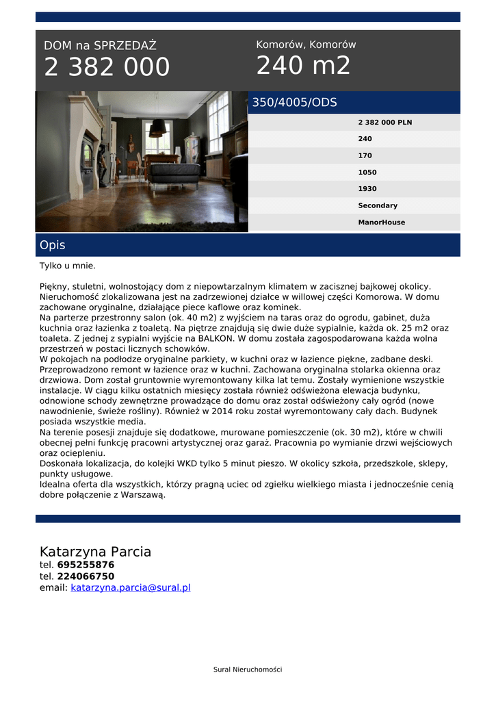 DOM na SPRZEDAŻ 2 382 000 Komorów, Komorów 240 m2 350/4005/ODS 2 382 000 PLN 240 170 1050 1930 Secondary ManorHouse Opis Tylko u mnie. Piękny, stuletni, wolnostojący dom z niepowtarzalnym klimatem w zacisznej bajkowej okolicy. Nieruchomość zlokalizowana jest na zadrzewionej działce w willowej części Komorowa. W domu zachowane oryginalne, działające piece kaflowe oraz kominek. Na parterze przestronny salon (ok. 40 m2) z wyjściem na taras oraz do ogrodu, gabinet, duża kuchnia oraz łazienka z toaletą. Na piętrze znajdują się dwie duże sypialnie, każda ok. 25 m2 oraz toaleta. Z jednej z sypialni wyjście na BALKON. W domu została zagospodarowana każda wolna przestrzeń w postaci licznych schowków. W pokojach na podłodze oryginalne parkiety, w kuchni oraz w łazience piękne, zadbane deski. Przeprowadzono remont w łazience oraz w kuchni. Zachowana oryginalna stolarka okienna oraz drzwiowa. Dom został gruntownie wyremontowany kilka lat temu. Zostały wymienione wszystkie instalacje. W ciągu kilku ostatnich miesięcy została również odświeżona elewacja budynku, odnowione schody zewnętrzne prowadzące do domu oraz został odświeżony cały ogród (nowe nawodnienie, świeże rośliny). Również w 2014 roku został wyremontowany cały dach. Budynek posiada wszystkie media. Na terenie posesji znajduje się dodatkowe, murowane pomieszczenie (ok. 30 m2), które w chwili obecnej pełni funkcję pracowni artystycznej oraz garaż. Pracownia po wymianie drzwi wejściowych oraz ociepleniu. Doskonała lokalizacja, do kolejki WKD tylko 5 minut pieszo. W okolicy szkoła, przedszkole, sklepy, punkty usługowe. Idealna oferta dla wszystkich, którzy pragną uciec od zgiełku wielkiego miasta i jednocześnie cenią dobre połączenie z Warszawą. Katarzyna Parcia tel. 695255876 tel. 224066750 email: [email protected] Sural Nieruchomości Powered by TCPDF (www.tcpdf.org)