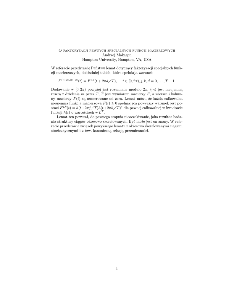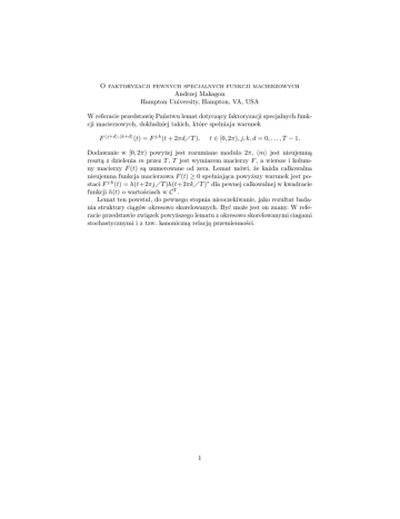 O faktoryzacji pewnych specjalnych funkcji macierzowych Andrzej Makagon Hampton University, Hampton, VA, USA W referacie przedstawię Państwu lemat dotyczący faktoryzacji specjalnych funkcji macierzowych, dokładniej takich, które spelniaja warunek F hj+di,hk+di (t) = F j,k (t + 2πdT ), t ∈ [0, 2π), j, k, d = 0, . . . , T − 1. Dodawanie w [0, 2π) powyżej jest rozumiane modulo 2π, hmi jest nieujemną resztą z dzielenia m przez T , T jest wymiarem macierzy F , a wiersze i kolumny macierzy F (t) są numerowane od zera. Lemat mówi, że każda całkowalna nieujemna funkcja macierzowa F (t) ≥ 0 spełniająca powyższy warunek jest postaci F j,k (t) = h(t+2πjT )h(t+2πkT )∗ dla pewnej calkowalnej w kwadracie funkcji h(t) o wartościach w C T . Lemat ten powstał, do pewnego stopnia nieoczekiwanie, jako rezultat badania struktury ciągów okresowo skorelowanych. Być może jest on znany. W referacie przedstawie związek powyższego lematu z okresowo skorelowanymi ciagami stochastycznymi i z tzw. kanoniczną relacją przemienności. 1