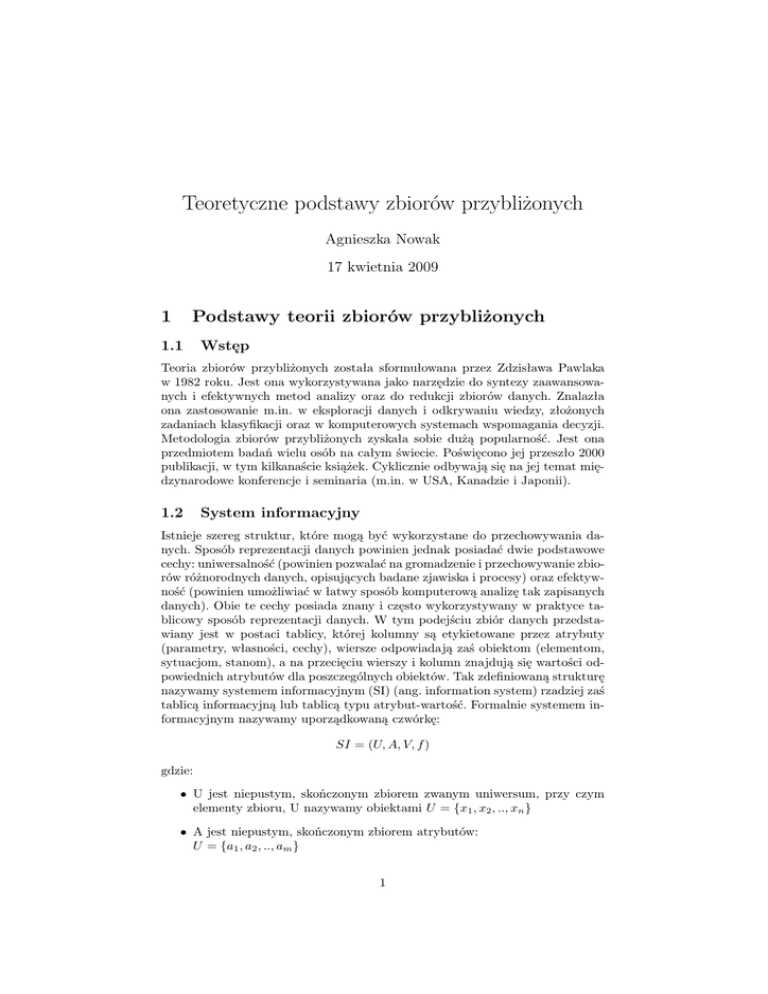 Rozpatrywany system informacyjny może zostać zapisany w następującej postaci: SI = (U, A, V, f ) gdzie: