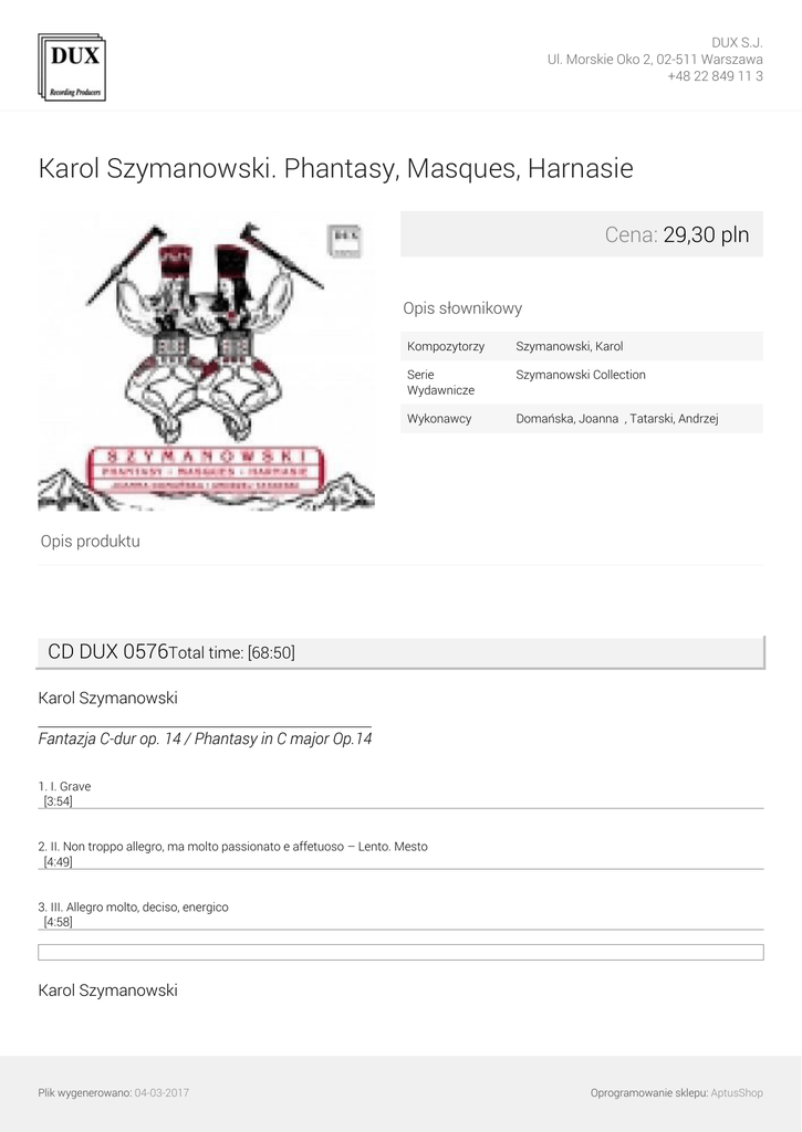 DUX S.J. Ul. Morskie Oko 2, 02-511 Warszawa +48 22 849 11 3 Karol Szymanowski. Phantasy, Masques, Harnasie Cena: 29,30 pln Opis słownikowy Kompozytorzy Szymanowski, Karol ∎ Serie Wydawnicze Szymanowski Collection Wykonawcy Domańska, Joanna ∎, Tatarski, Andrzej ∎ Opis produktu CD DUX 0576Total time: [68:50] Karol Szymanowski Fantazja C-dur op. 14 / Phantasy in C major Op.14 1. I. Grave [3:54] 2. II. Non troppo allegro, ma molto passionato e affetuoso – Lento. Mesto [4:49] 3. III. Allegro molto, deciso, energico [4:58] Karol Szymanowski Plik wygenerowano: 04-03-2017 Oprogramowanie sklepu: AptusShop DUX S.J. Ul. Morskie Oko 2, 02-511 Warszawa +48 22 849 11 3 Maski op. 34 / Masques. Three poems for piano Op.34 4. I. Szecherezada / Schéhérazade [10:38] 5. II. Błazen Tantris / Tantris le bouffon [6:49] 6. III. Serenada Don Juana / Sérénade de Don Juan [7:04] Karol Szymanowski Harnasie op. 55 / Harnasie Op.55 transkrypcja na dwa fortepiany / arr. for two pianos: Grażyna Bacewicz, opracowanie wykonawcze / performing adaptation: Andrzej Tatarski 7. Obraz I: Hala / 1er tableau: Dans la Montagne. Redyk / Prélude et scene champetre [3:58] 8. Obraz I: Hala / 1er tableau: Dans la Montagne. 2. Scena mimiczna / Scene mimée [2:01] 9. Obraz I: Hala / 1er tableau: Dans la Montagne. 3. Marsz zbójnicki / Marche de Harnasie [1:48] 10. Obraz I: Hala / 1er tableau: Dans la Montagne. 4. Scena mimiczna / Scene mimée [3:27] 11. Obraz I: Hala / 1er tableau: Dans la Montagne. 5. Taniec zbójnicki / Danse de Harnasie [4:17] 12. Obraz II: Wnętrze chałupy / 2me tableau: Intérieur d’une chaumiere. 6a. Wesele / Les Noces [2:17] 13. Obraz II: Wnętrze chałupy / 2me tableau: Intérieur d’une chaumiere. 6b. Cepiny / Entrée de la fiancée [1:44] 14. Obraz II: Wnętrze chałupy / 2me tableau: Intérieur d’une chaumiere. 6c. Pieśń Siuhajów / Chanson a boire [1:06] 15. Obraz II: Wnętrze chałupy / 2me tableau: Intérieur d’une chaumiere. 7. Taniec góralski / Danse des montagnards [3:27] Plik wygenerowano: 04-03-2017 Oprogramowanie sklepu: AptusShop DUX S.J. Ul. Morskie Oko 2, 02-511 Warszawa +48 22 849 11 3 16. Obraz II: Wnętrze chałupy / 2me tableau: Intérieur d’une chaumiere. 8. Wejście harnasiów. Taniec / Entrée de Harnasie et Danse [4:14] 17. Obraz III: Hala / 3me tableau: Dans la Montagne 9. Hala / Dans la Montagne [2:17] Wykonawcy: Andrzej Tatarski /fortepian/ Joanna Domańska /fortepian/ Plik wygenerowano: 04-03-2017 Powered by TCPDF (www.tcpdf.org) Oprogramowanie sklepu: AptusShop