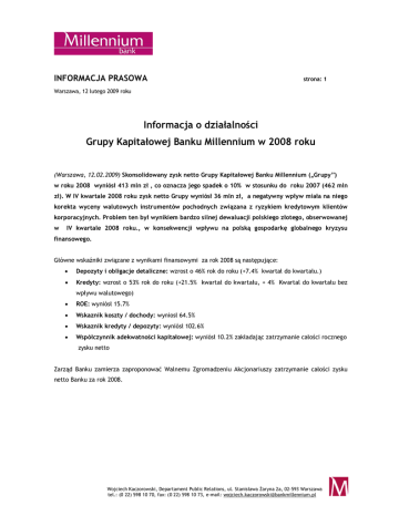INFORMACJA PRASOWA strona: 1 Warszawa, 12 lutego 2009 roku Informacja o działalności Grupy Kapitałowej Banku Millennium w 2008 roku (Warszawa, 12.02.2009) Skonsolidowany zysk netto Grupy Kapitałowej Banku Millennium („Grupy”) w roku 2008 wyniósł 413 mln zł , co oznacza jego spadek o 10% w stosunku do roku 2007 (462 mln zł). W IV kwartale 2008 roku zysk netto Grupy wyniósł 36 mln zł, a negatywny wpływ miała na niego korekta wyceny walutowych instrumentów pochodnych związana z ryzykiem kredytowym klientów korporacyjnych. Problem ten był wynikiem bardzo silnej dewaluacji polskiego złotego, obserwowanej w IV kwartale 2008 roku., w konsekwencji wpływu na polską gospodarkę globalnego kryzysu finansowego. Główne wskaźniki związane z wynikami finansowymi za rok 2008 są następujące: • Depozyty i obligacje detaliczne: wzrost o 46% rok do roku (+7.4% kwartał do kwartału.) • Kredyty: wzrost o 53% rok do roku (+21.5% kwartał do kwartału, + 4% Kwartal do kwartału bez wpływu walutowego) • ROE: wyniósł 15.7% • Wskaznik koszty / dochody: wyniosł 64.5% • Wskaznik kredyty / depozyty: wyniósł 102.6% • Współczynnik adekwatności kapitałowej: wyniósł 10.2% zakładając zatrzymanie całości rocznego zysku netto Zarząd Banku zamierza zaproponować Walnemu Zgromadzeniu Akcjonariuszy zatrzymanie całości zysku netto Banku za rok 2008. Wojciech Kaczorowski, Departament Public Relations, ul. Stanisława Żaryna 2a, 02-593 Warszawa tel.: (0 22) 598 10 70, fax: (0 22) 598 10 73, e-mail: [email protected] Grupa począwszy od 2006 roku, a zwłaszcza w samym 2008 roku, zdołała poprawić, swoją pozycję rynkową w wielu kategoriach produktów, szczególnie w obszarze bankowości detalicznej. Kategoria produktu 2006 2007 2008 Depozyty klientów indywidualnych 4.0% 5.3% 7.1% Depozyty przedsiębiorstw 3.7% 3.9% 3.8% Depozyty ogółem 3.9% 4.6% 5.6% Kredyt dla klientów indywidualnych 5.4% 6.6% 7.4% W tym hipoteczne 9.8% 11.2% 11.5% W tym kredyty w kartach 4.9% 5.5% 5.6% Kredyty dla przedsiębiorstw 3.4% 3.2% 3.2% Kredyty ogółem 4.3% 4.8% 5.4% Bank zrealizował swój cel, zakładający otwarcie 80 oddziałów w 2008 roku, w tym 25 w samym IV kwartale 2008 roku, osiągając na koniec raportowanego okresu sieć liczącą w sumie 490 placówek. Główne zdarzenia, które miały wpływ na działalność Grupy w IV kwartale 2008 roku to: • znaczne zawirowania na rynkach finansowych; • wysoka dewaluacja złotego przy silnych wahaniach kursów wymiany walut i stóp procentowych; • negatywny wpływ opcji walutowych zawartych z klientami korporacyjnymi; • wycofanie z dniem 1 grudnia 2008 roku kredytów hipotecznych w walutach obcych z oferty produktowej Banku; • wyższy koszt finansowania w walutach obcych; • zmiana polityki pieniężnej NBP: od podwyższania do obniżania stóp procentowych w końcu 2008 roku; • dalsze spadki cen akcji na rynkach kapitałowych, szczególnie na rynkach wschodzących (w tym w Polsce). a) Sytuacja makroekonomiczna w Polsce w IV kwartale 2008 roku. W latach 2006, 2007 i w pierwszej połowie 2008 roku głównym czynnikiem sprzyjającym wzrostowi gospodarczemu był popyt krajowy, a w szczególności inwestycje, które rosły w dwucyfrowym tempie. Pierwsze symptomy pogorszenia koniunktury odnotowano w trzecim kwartale 2008 roku, kiedy w ślad za pogarszającymi się nastrojami przedsiębiorców dynamika inwestycji spadła do zaledwie 3,5% rok do roku. Prawdziwe spowolnienie nastąpiło jednak dopiero w IV kwartale 2008 roku, według naszych szacunków tempo wzrostu PKB wyniosło wówczas 2,9% rok do roku, co jest wynikiem ponad dwukrotnie gorszym niż na początku roku. Skutki kryzysu na globalnych rynkach finansowych dotyczyły w pierwszej kolejności przemysłu. Wskaźniki koniunktury w tej gałęzi gospodarki utrzymywały się w IV kwartale ubiegłego roku na rekordowo niskich poziomach. Dynamika inwestycji w IV kwartale pozostała na poziomie zbliżonym do poprzedniego kwartału, a jedynym filarem wzrostu gospodarczego była konsumpcja prywatna, która według naszych obliczeń zwiększyła się o 5,6% rok do roku. Wojciech Kaczorowski, Departament Public Relations, ul. Stanisława Żaryna 2a, 02-593 Warszawa tel.: (0 22) 598 10 70, fax: (0 22) 598 10 73, e-mail: [email protected] W IV kwartale zaczęły być widoczne symptomy pogorszenia sytuacji na rynku pracy oraz w konsekwencji pogorszenie nastrojów konsumentów. Stopa bezrobocia rejestrowanego zwiększyła się w grudniu 2008 roku do 9,5% z 8,8% w październiku. Zatrudnienie w sektorze przedsiębiorstw spadło w IV kwartale o 0,8% a nominalna dynamika płac spadła we wrześniu do 5,4% z 10,9% rok do roku. Skutkiem spowolnienia gospodarczego i zmniejszenia się presji płacowej oraz spadających cen na rynku surowców i wolniejszego niż przed rokiem wzrostu cen żywności było osłabienie, pod koniec 2008 roku, napięć inflacyjnych. W grudniu 2008 roku inflacja konsumenta wyniosła 3,3% i po raz pierwszy od października 2007 roku znajdowała się w pożądanym paśmie odchyleń od celu banku centralnego. W listopadzie, w obawie przed nadchodzącym spowolnieniem gospodarczym i w obliczu spadającej inflacji w Polsce, NBP rozpoczął cykl luzowania polityki pieniężnej. Stopa referencyjna powróciła do poziomu 5,0% pod koniec 2008 roku. W IV kwartale 2008 roku sytuacja na rynku walutowym uległa istotnej zmianie w porównaniu z poprzednimi okresami. Rozwój kryzysu finansowego na globalnych rynkach przyczynił się do ucieczki inwestorów z rynków wschodzących, co spowodowało silną deprecjację lokalnych walut. Złoty osłabił się w trakcie zaledwie trzech miesięcy o 22,4% względem euro o 23% wobec dolara oraz o 29% wobec franka szwajcarskiego. Polska waluta podlegała najszybszej deprecjacji w tej dekadzie, podobnie jak pozostałe waluty w regionie: węgierski forint i czeska korona. Skutkiem osłabienia złotego był silny wzrost wyrażonej w złotych 