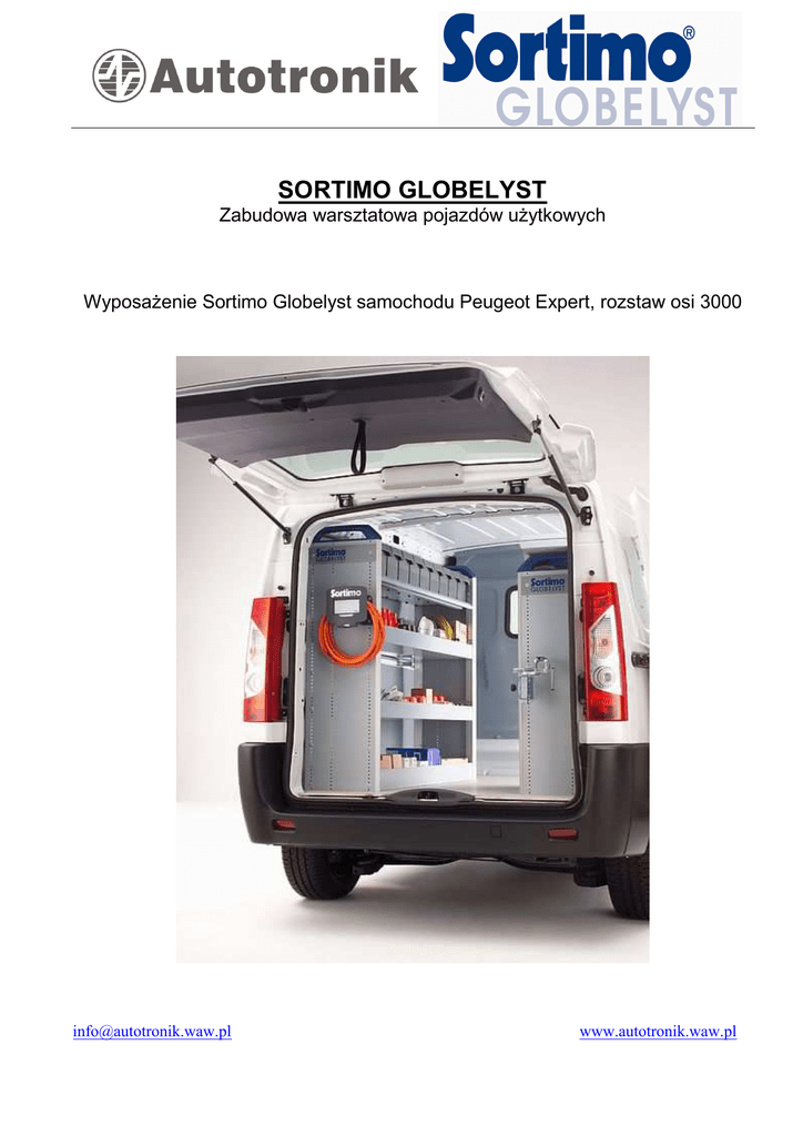 SORTIMO GLOBELYST Zabudowa warsztatowa pojazdów uŜytkowych WyposaŜenie Sortimo Globelyst samochodu Peugeot Expert, rozstaw osi 3000 [email protected] www.autotronik.waw.pl Samochód bazowy: Charakterystyka: Peugeot Expert, rozstaw osi 3000. Globelyst jest innowacyjnym sposobem wykańczania wnętrz samochodów, stworzonym przez firmę Sortimo. Idealnie pasuje do następujących modeli Peugeota: Bipper, Partner, Expert, Boxer. JuŜ podstawowe wyposaŜenie z zakresu Globelyst zamienia samochód w mobilny warsztat, który jest gwarancją efektywnej pracy i ergonomicznego wykorzystania pojazdu. Przykładowe elementy wyposaŜenia Soboflex®- podłoga montaŜowa: • • • • • • Multiplex 12 mm antypoślizgowa dopasowana do konkretnego modelu samochodu brak konieczności przewiercania karoserii pojazdu (zabudowa warsztatowa przykręcana jest wyłącznie do płyty podłogowej Soboflex, natomiast boczne elementy stabilizujące przytwierdzane są do bocznych elementów karoserii pojazdu odporna na ścieranie stabilna i łatwa w utrzymaniu czystości Sowaflex®- wyłoŜenie ścian bocznych przestrzeni ładunkowej • • • • • ochrona samochodu przed wewnętrznymi szkodami niezwykle odporne na wstrząsy i zadrapania odporne takŜe na wilgoć i substancje chemiczne wielkość dokładnie dopasowana do danego typu samochodu lŜejsze o 60% od drewna Lewa strona (kierowcy) Prawa strona (pasaŜera) EX KU LI-1 4 półki FW z 2 przegrodami, wyłoŜone matami przeciwpoślizgowymi 2 półki z 4, względnie 6 pojemnikami SB 04-9 1 półka FR z 2 przegrodami, wyłoŜona matą przeciwpoślizgową EX KU RE-1 3 półki FW z 2 przegrodami, wyłoŜone matami przeciwpoślizgowymi (S x G x H)~ 1004 x 382 x 1253 mm Waga: około 33,5 kg (S x G x H)~ 1730 x 382 x 1253 mm Waga: około 63,2 kg [email protected] www.autotronik.waw.pl EX KU LI-2 EX KU RE- 2 3 półki FW z 2 przegrodami, wyłoŜone matami przeciwpoślizgowymi 2 półki z 6 pojemnikami SB 04-9 1 półka FR z dwoma przegrodami, wyłoŜona matą przeciwpoślizgową 1 półka z aluminiową, uchylną klapą 1 uchwyt blokujący walizki 1 klapa uchylana do góry 1 kątownik podłogowy (w formie szyny transportowej) 1 półka FR z 2 przegrodami, wyłoŜona matą przeciwpoślizgową 1 półka FW z 2 przegrodami, wyłoŜona matą przeciwpoślizgową 3 szuflady 2 walizki T-BOXX zamontowane na półce aluminiowej 1 Mobilbox z uchwytem transportowym 1 klapa uchylna do góry 1 kątownik podłogowy w formie szyny transportowej (S x G x H)~ 1730 x 382 x 1253 mm Waga: około 73,7 kg EX KU LI-3 4 półki FW z 2 przegrodami, wyłoŜone matami przeciwpoślizgowymi 2 szuflady z przegrodą, wyłoŜone matami przeciwpoślizgowymi 2 walizki T-BOXX zamontowane na półce aluminiowej 1 półka z 2 Mobilbox z uchwytem transportowym 1 klapa uchylna do góry 1 pas transportowy (S x G x H)~ 1004 x 382 x 1253 mm Waga: około 65,4 kg EX KU RE- 3 2 półki FW z 2 przegrodami, wyłoŜone matami przeciwpoślizgowymi 3 szuflady z przegrodami, wyłoŜone matami przeciwpoślizgowymi 1 klapa uchylna do góry (S x G x H)~ 1004 x 382 x 1253 mm Waga: około 52,7 kg (S x G x H)~ 1730 x 382 x 1253 mm Waga: około 79,9 kg [email protected] www.autotronik.waw.pl EX KU LI-4 2 półki FW z 2 przegrodami, wyłoŜone matami przeciwpoślizgowymi 1 półka z 6 pojemnikami SB 04-9 1 półka z 2 Mobilbox z uchwytem transportowym 1 półka FR z 2 przegrodami, wyłoŜona matą przeciwpoślizgową 3 szuflady z przegrodami, wyłoŜone matami przeciwpoślizgowymi 1 półka z aluminiowa, uchylną klapą 1 uchwyt blokujący walizki 1 klapa uchylna do góry 1 kątownik podłogowy (w formie szyny transportowej) EX KU RE- 4 1 półka FW z 2 przegrodami, wyłoŜona matą przeciwpoślizgową 1 półka z 6 pojemnikami SB 04-9 4 szuflady 3 walizki aluminiowe z plastikowymi pojemnikami 1 klapa uchylna do góry 1 kątownik podłogowy ( w formie szyny transportowej) 1 blat składany z imadłem 1 uchwyt na dokumenty A4 (S x G x H)~ 1224 x 382 x 1253 mm Waga: około 97,3 kg (S x G x H)~ 1730 x 382 x 1253 mm Waga: około 89,9 kg Certyfikaty: • • • ISO 9001 TÜV produkt spełnia wymagania normy europejskiej ECE R17 Homologacja pojazdu: nie wymaga Gwarancja: 3 lata na produkty Sortimo International GmbH Jeśli macie Państwo jakieś pytania, nasz doradca pomoŜe Państwu zaprojektować zabudowę samochodu. Autotronik Ul. E.Orzeszkowej 39 05-500 Piaseczno Tel/fax. (022) 757 21 22; 0-603 91 93 95 E-mail: [email protected] www.autotronik.waw.pl [email protected] www.autotronik.waw.pl
