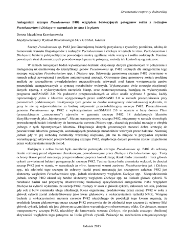 Streszczenie rozprawy doktorskiej Antagonizm szczepu Pseudomonas P482 względem bakteryjnych patogenów roślin z rodzajów Pectobacterium i Dickeya w warunkach in vitro i in planta Dorota Magdalena Krzyżanowska Międzyuczelniany Wydział Biotechnologii UG i GUMed, Gdańsk Szczep Pseudomonas sp. P482 jest Gramujemną bakterią pozyskaną z ryzosfery pomidora, zdolną do hamowania wzrostu fitopatogenów z rodzajów Pectobacterium i Dickeya w testach in vitro. Pectobacterium i Dickeya to bakterie pektynolityczne powodujące mokrą zgniliznę wielu warzyw i roślin ozdobnych. Pomimo poważnych strat ekonomicznych powodowanych przez te patogeny, metody ich kontroli są ograniczone. W ramach niniejszych badań wykorzystano techniki eksploracji danych genomowych w połączeniu z mutagenezą ukierunkowaną do identyfikacji genów Pseudomonas sp. P482 istotnych dla antagonizmu tego szczepu względem Pectobacterium spp. i Dickeya spp. Sekwencję genomową szczepu P482 otrzymano w ramach usługi zewnętrznej i poddano automatycznej anotacji. Otrzymane dane genomowe zostały poddane analizie ze szczególnym uwzględnieniem przeszukiwania sekwencji pod kątem występowania genów potencjalnie zaangażowanych w syntezę metabolitów wtórnych. Wykorzystano dwie strategie eksploracji danych: ręczną, z wykorzystaniem narzędzia blastp, oraz zautomatyzowaną, bazującą na wykorzystaniu programu antiSMASH 2.0. Na podstawie przeprowadzonych in silico analiz wybrano 5 genów, każdy reprezentujący jeden z klastrów wytypowanych przez antiSMASH 2.0 w ramach przeszukiwania przy parametrach podstawowych. Inaktywacja tych genów na drodze mutagenezy ukierunkowanej wykazała, że geny te nie są odpowiedzialne za badaną aktywność przeciwbakteryjną szczepu P482. Przeszukiwanie genomu Pseudomonas sp. P482 z wykorzystaniem antiSMASH 2.0 w oparciu o bazę domen Pfam (przeszukiwanie „rozszerzone”) ujawniło w genomie szczepu P482 18 dodatkowych klastrów klasyfikowanych jako „hipotetyczne”. Mutant transpozonowy szczepu P482, otrzymany w ramach równolegle prowadzonych badań i niezdolny do hamowania wzrostu Dickeya spp., okazał się posiadać mutację w obrębie jednego z tych hipotetycznych klastrów. Eksploracja danych genomowych stanowi dobrą strategię do poszukiwania klastrów genowych, warunkujących produkcje metabolitów wtórnych przez bakterie. Niemniej jednak gdy w grę wchodzą metabolity wcześniej niepisane, jak ma to miejsce w przypadku czynnika warunkującego aktywność przeciwbakteryjną szczepu P482, eksploracja danych powinna zostać uzupełniona przez wykorzystanie innych metod. Kolejnym z celów badań było określenie potencjału szczepu Pseudomonas sp. P482 do ochrony tkanki roślinnej przed objawami chorobowym, powodowanymi przez Dickeya i Pectobacterium spp. Testy ochrony tkanki przed maceracją przeprowadzono poprzez koinokulację tkanki bulw ziemniaka i liści główek cykorii zawiesinami bakterii patogennych i szczepu P482. Test na tkance bulw ziemniaka wykazał, że chociaż szczep P482 jest w stanie, w warunkach in vitro, hamować wzrost zarówno Pectobacterium jak i Dickeya spp., tak zdolność tego szczepu do ochrony tkanki przed maceracją jest szczepowo zależna: P482 jest skuteczny względem Pectobacterium spp., jednak nieskuteczny względem Dickeya spp. Niespodziewanie jednak, szczep P482 okazał się bardzo skuteczny względem Dickeya spp. na liściach główek cykorii. W rezultacie badań nad przyczyną obserwowanej tkankowej specyficzności antagonizmu P482 względem Dickeya na cykorii wykazano, że szczep P482, rosnący w soku z główek cykorii, zakwasza ten sok, podczas gdy sok z bulw ziemniaka ulega alkalizacji. Kwas organiczny, produkowany przez szczep P482 w soku z główek cykorii został zidentyfikowany jako kwas glukonowy z wykorzystaniem techniki NMR. Wstępne badania z wykorzystaniem mutanta szczepu P482 niezdolnego do produkcji tego kwasu sugerują, że produkcja kwasu glukonowego przez szczep P482 przyczynia się do zdolności tego szczepu do ochrony liści główek cykorii, jednak nie jest głównym czynnikiem warunkującym obserwowany efekt. Co ciekawe, mutant transpozonowy szczepu P482, niezdolny do hamowania wzrostu Dickeya, nie posiada znacząco obniżonej aktywności względem tego patogenu na liściu główek cykorii. Pokazuje to, mechanizm antagonistycznego Gdańsk 2015 Streszczenie rozprawy doktorskiej oddziaływania szczepu P482 względem Dickeya spp. w warunkach in vitro nie warunkuje zdolności tego szczepu do ochrony tkanki roślinnej w zastosowanych warunkach in planta. Dodatkowo w ramach prowadzonych badań wykazano, że szczep P482 jest zdolny do kolonizacji ryzosfery roślin ziemniaka, rosnących w glebie z pola, chociaż nie w stopniu tak znacznym, jak szczep referencyjny, pozyskany z tej niszy ekologicznej. Oznacza to, że możliwe jest wykorzystanie rośliny ziemniaka w charakterze rośliny-gospodarza w badaniach in planta nad oddziaływaniem pomiędzy szczepem P482 a bakteriami pektynolitycznymi. Gdańsk 2015
