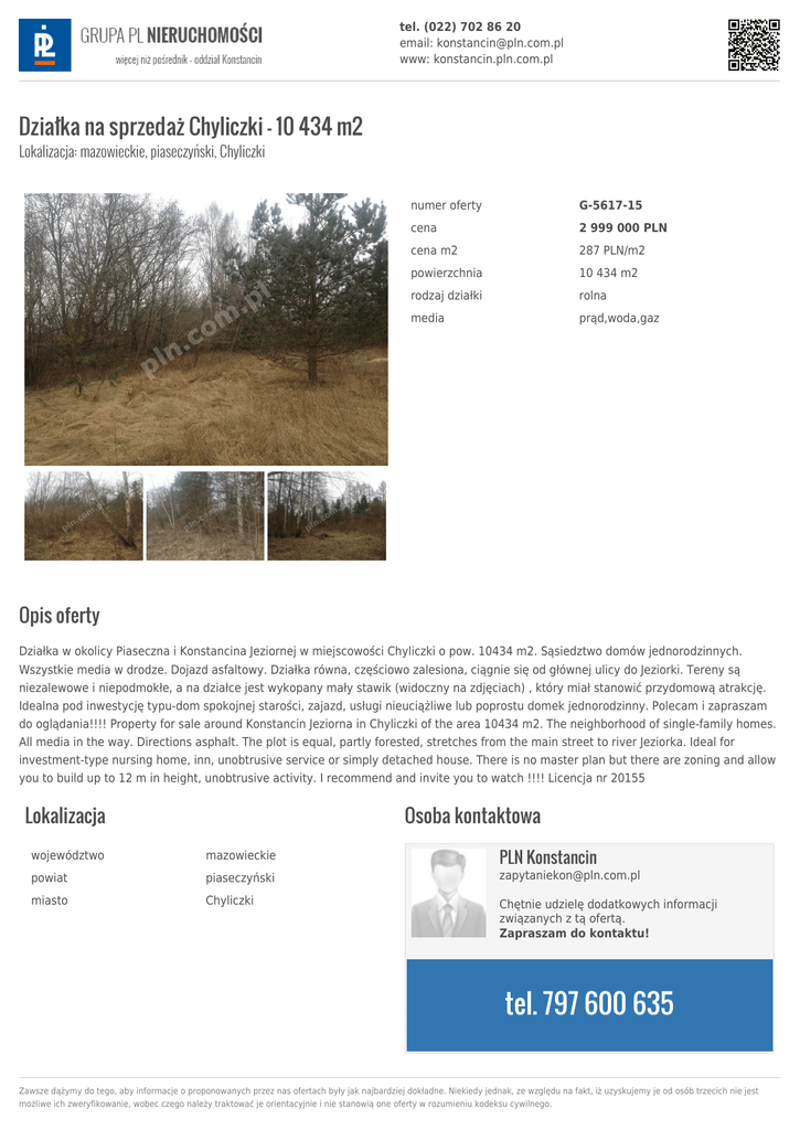 tel. (022) 702 86 20 email: [email protected] www: konstancin.pln.com.pl Działka na sprzedaż Chyliczki - 10 434 m2 Lokalizacja: mazowieckie, piaseczyński, Chyliczki numer oferty G-5617-15 cena 2 999 000 PLN cena m2 287 PLN/m2 powierzchnia 10 434 m2 rodzaj działki rolna media prąd,woda,gaz Opis oferty Działka w okolicy Piaseczna i Konstancina Jeziornej w miejscowości Chyliczki o pow. 10434 m2. Sąsiedztwo domów jednorodzinnych. Wszystkie media w drodze. Dojazd asfaltowy. Działka równa, częściowo zalesiona, ciągnie się od głównej ulicy do Jeziorki. Tereny są niezalewowe i niepodmokłe, a na działce jest wykopany mały stawik (widoczny na zdjęciach) , który miał stanowić przydomową atrakcję. Idealna pod inwestycję typu-dom spokojnej starości, zajazd, usługi nieuciążliwe lub poprostu domek jednorodzinny. Polecam i zapraszam do oglądania!!!! Property for sale around Konstancin Jeziorna in Chyliczki of the area 10434 m2. The neighborhood of single-family homes. All media in the way. Directions asphalt. The plot is equal, partly forested, stretches from the main street to river Jeziorka. Ideal for investment-type nursing home, inn, unobtrusive service or simply detached house. There is no master plan but there are zoning and allow you to build up to 12 m in height, unobtrusive activity. I recommend and invite you to watch !!!! Licencja nr 20155 Lokalizacja Osoba kontaktowa PLN Konstancin województwo mazowieckie powiat piaseczyński [email protected] miasto Chyliczki Chętnie udzielę dodatkowych informacji związanych z tą ofertą. Zapraszam do kontaktu! tel. 797 600 635 Zawsze dążymy do tego, aby informacje o proponowanych przez nas ofertach były jak najbardziej dokładne. Niekiedy jednak, ze względu na fakt, iż uzyskujemy je od osób trzecich nie jest możliwe ich zweryfikowanie, wobec czego należy traktować je orientacyjnie i nie stanowią one oferty w rozumieniu kodeksu cywilnego.