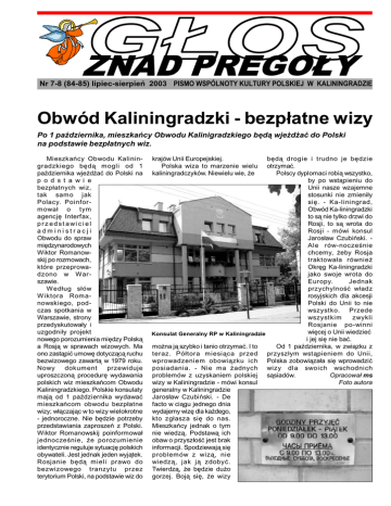 Nr 7-8 (84-85) lipiec-sierpień 2003 PISMO WSPÓLNOTY KULTURY POLSKIEJ W KALININGRADZIE Obwód Kaliningradzki - bezpłatne wizy Po 1 października, mieszkańcy Obwodu Kalinigradzkiego będą wjeżdżać do Polski na podstawie bezpłatnych wiz. Mieszkańcy Obwodu Kaliningradzkiego będą mogli od 1 października wjeżdżać do Polski na p o d s t a w i e bezpłatnych wiz, tak samo jak Polacy. Poinformował o tym agencję Interfax, prz edst awi c i el administracji Obwodu do spraw międzynarodowych Wiktor Romanowskij po rozmowach, które przeprowadzono w Warszawie. W edług słów W iktora Romanowskiego, podczas spotkania w Warszawie, strony przedyskutowały i uzgodniły projekt nowego porozumienia między Polską a Rosją w sprawach wizowych. Ma ono zastąpić umowę dotyczącą ruchu bezwizowego zawartą w 1979 roku. Nowy dokument przewiduje uproszczoną procedurę wydawania polskich wiz mieszkańcom Obwodu Kaliningradzkiego. Polskie konsulaty mają od 1 października wydawać mieszkańcom obwodu bezpłatne wizy; włączając w to wizy wielokrotne - jednoroczne. Nie będzie potrzeby przedstawiania zaproszeń z Polski. Wiktor Romanowskij poinformował jednocześnie, że porozumienie identycznie reguluje sytuację polskich obywateli. Jest jednak jeden wyjątek. Rosjanie będą mieli prawo do bezwizowego tranzytu przez terytorium Polski, na podstawie wiz do krajów Unii Europejskiej. Polska wiza to marzenie wielu kaliningradczyków. Niewielu wie, że będą drogie i trudno je będzie otrzymać. Polscy dyplomaci robią wszystko, by po wstąpieniu do Unii nasze wzajemne stosunki nie zmieniły się. - Ka-liningrad, Obwód Ka-liningradzki to są nie tylko drzwi do Rosji, to są wrota do Rosji - mówi konsul Jarosław Czubiński. Ale rów-nocześnie chcemy, żeby Rosja traktowała również Okręg Ka-liningradzki jako swoje wrota do Europy. Jednak przychylność władz rosyjskich dla akcesji Polski do Unii to nie wszystko. Przede wszystkim zwykli Rosjanie po-winni więcej o Unii wiedzieć Konsulat Generalny RP w Kaliningradzie i jej się nie bać. można ją szybko i tanio otrzymać. I to Od 1 października, w związku z teraz. Półtora miesiąca przed przyszłym wstąpieniem do Unii, wprowadzeniem obowiązku ich Polska zobowiązała się wprowadzić posiadania. - Nie ma żadnych wizy dla swoich wschodnich problemów z uzyskaniem polskiej sąsiadów. Opracował ms wizy w Kaliningradzie - mówi konsul Foto autora generalny w Kaliningradzie Jarosław Czubiński. - De facto w ciągu jednego dnia wydajemy wizę dla każdego, kto zgłasza się do nas. Mieszkańcy jednak o tym nie wiedzą. Podstawą ich obaw o przyszłość jest brak informacji. Spodziewają się problemów z wizą, nie wiedzą, jak ją zdobyć. Twierdzą, że będzie dużo gorzej. Boją się, że wizy