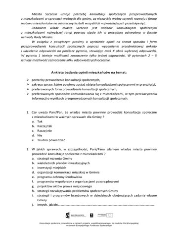Miasto Szczecin uznaje potrzebę konsultacji społecznych przeprowadzonych z mieszkańcami w sprawach ważnych dla gminy, za niezwykle ważny czynnik rozwoju i formę wpływu mieszkańców na ostateczny kształt wszystkich najważniejszych przedsięwzięć. Zadaniem władz miasta Szczecin jest nadanie konsultacjom społecznym z mieszkańcami najwyższej rangi poprzez ujęcie ich w procedurę uchwaloną w formie uchwały Rady Miasta. W związku z powyższym prosimy o wyrażenie opinii na temat sposobu i form przeprowadzenia konsultacji społecznych poprzez wypełnienie przedmiotowej ankiety i udzielenie odpowiedzi na poniższe pytania, stawiając znak X obok wybranej odpowiedzi. W pytaniu 1 istnieje możliwość zaznaczenie tylko jednej odpowiedzi. W pytaniach 2 – 5 istnieje możliwość zaznaczenie kilku odpowiedzi jednocześnie. Ankieta badania opinii mieszkańców na temat: potrzeby prowadzenia konsultacji społecznych, zakresu spraw, które powinny zostać objęte konsultacjami społecznymi w przyszłości, preferowanych form prowadzenia konsultacji społecznych, preferowanych sposobów komunikowania się z mieszkańcami, w tym przekazywania informacji o wynikach przeprowadzonych konsultacji społecznych. 1. Czy uważa Pani/Pan, że władze miasta powinny prowadzić konsultacje społeczne z mieszkańcami w ważnych sprawach dla Gminy ? a. Tak b. Raczej tak c. Raczej nie d. Nie e. Trudno powiedzieć 2. W jakich sprawach, w szczególności, Pani/Pana zdaniem władze miasta powinny prowadzić konsultacje społeczne z mieszkańcami ? a. strategii rozwoju Gminy b. wieloletnich planów inwestycyjnych c. inwestycji miejskich d. organizacji komunikacji miejskiej w Gminie e. programu ochrony środowiska f. programów współpracy z organizacjami pozarządowymi g. projektów aktów prawa miejscowego h. strategii rozwiązywania problemów społecznych Gminy i. strategii i programów branżowych w dziedzinach obejmujących zadania własne Gminy j. innych, jakich:……………………………………………………………………………………………………… Konsultacje społeczne prowadzone w ramach projektu współfinansowanego ze środków Unii Europejskiej w ramach Europejskiego Funduszu Społecznego 3. W jakich formach, w szczególności, Pani/Pana zdaniem konsultacje społeczne powinny być prowadzone ? a. otwartych spotkań z mieszkańcami b. badania opinii mieszkańców z wykorzystaniem strony internetowej Urzędu za pośrednictwem poczty elektronicznej, formularza zgłaszania uwag, formularza ankietowego itp. c. badania opinii mieszkańców poprzez umieszczeniu w budynku Urzędu urny oraz wyłożeniu formularza zgłaszania uwag, formularza ankietowego itp. d. zebrań z przedstawicielami organizacji pozarządowych działających na terenie Gminy e. przekazania do zaopiniowania projektu dokumentu organizacjom społecznym, instytucjom i innym podmiotom (np. firmy - pracodawców) f. zogniskowanego wywiadu grupowego g. badań reprezentatywnych grup społecznych h. innych, jakich: ……………………………………………………………………………………………………. 4. W jaki sposób Pani/Pana zdaniem władze miasta powinny informowaćmieszkańców o przedmiocie konsultacji społecznych, ich celach, sposobie zgłaszania opinii, terminie ich realizacji ? a. poprzez umieszczenie ogłoszenia o rozpoczęciu konsultacji społecznych na stronie internetowej Urzędu b. poprzez umieszczenie ogłoszenia o rozpoczęciu konsultacji społecznych w mediach lokalnych c. poprzez umieszczenie ogłoszenia o rozpoczęciu konsultacji społecznych na urzędowych tablicach ogłoszeń d. poprzez umieszczenie ogłoszenia o rozpoczęciu konsultacji społecznych na tablicach rad osiedli e. inne, jakie: ………………………………………………………………………………………………………… 5. W jaki sposób Pani/Pana zdaniem władze miasta powinny informować mieszkańców o wynikach przeprowadzonych konsultacji społecznych ? a. poprzez umieszczenie informacji o wynikach przeprowadzonych konsultacji społecznych na stronie internetowej Urzędu b. poprzez umieszczenie informacji o wynikach przeprowadzonych konsultacji społecznych w mediach lokalnych c. poprzez umieszczenie informacji o wynikach przeprowadzonych konsultacji społecznych na urzędowych tablicach ogłoszeń d. poprzez wyłożenie do wglądu mieszkańców informacji o wynikach konsultacji w wyznaczonym do tego miejscu w Urzędzie Miasta e. inne, jakie: ………………………………………………………………………………………………………… Dziękujemy za wypełnienie ankiety Konsultacje społeczne prowadzone w ramach projektu współfinansowanego ze środków Unii Europejskiej w ramach Europejskiego Funduszu Społecznego